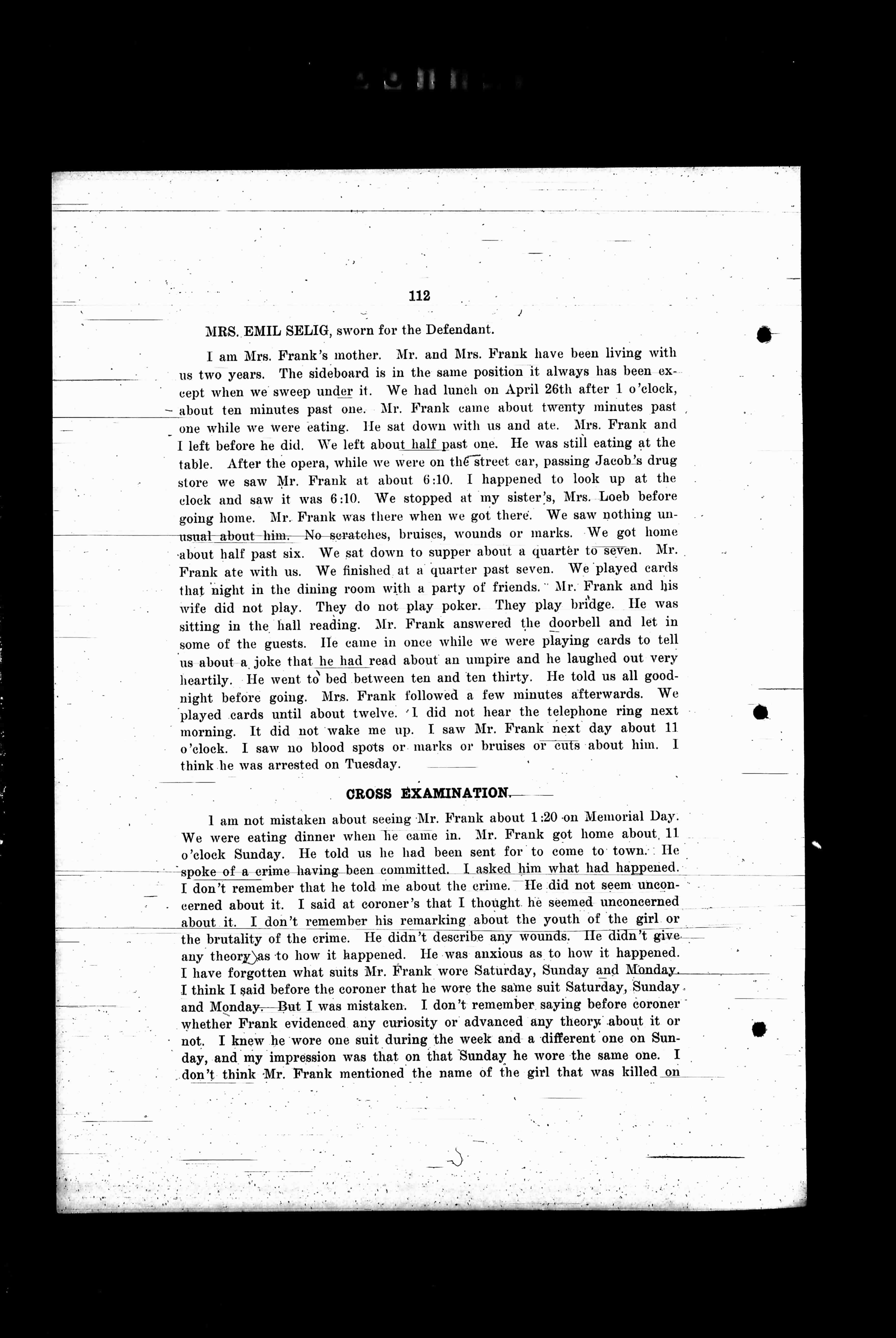I am Mrs. Frank's mother. Mr. and Mrs. Frank have been living with us two years. The sideboard is in the same position it always has been except when we sweep under it. We had lunch on April 26th after 1 o'clock, about ten minutes past one. Mr. Frank came about twenty minutes past one while we were eating. He sat down with us and ate. Mrs. Frank and I left before he did. We left about half past one. He was still eating at the table. After the opera, while we were on the street car, passing Jacob's drug store we saw Mr. Frank at about 6:10. I happened to look up at the clock and saw it was 6:10. We stopped at my sister's, Mrs. Loeb before going home. Mr. Frank was there when we got there. We saw nothing unusual about him. No scratches, bruises, wounds or marks. We got home about half past six. We sat down to supper about a quarter to seven. Mr. Frank ate with us. We finished at a quarter past seven. We played cards that night in the dining room with a party of friends. Mr. Frank and his wife did not play. They do not play poker. They play bridge. He was sitting in the hall reading. Mr. Frank answered the doorbell and let in some of the guests. He came in once while we were playing cards to tell us about a joke that he had read about an umpire and he laughed out very heartily. He went to bed between ten and ten thirty. He told us all goodnight before going. Mrs. Frank followed a few minutes afterwards. We played cards until about twelve. I did not hear the telephone ring next morning. It did not wake me up. I saw Mr. Frank next day about 11 o'clock. I saw no blood spots or marks or bruises or cuts about him. I think he was arrested on Tuesday.