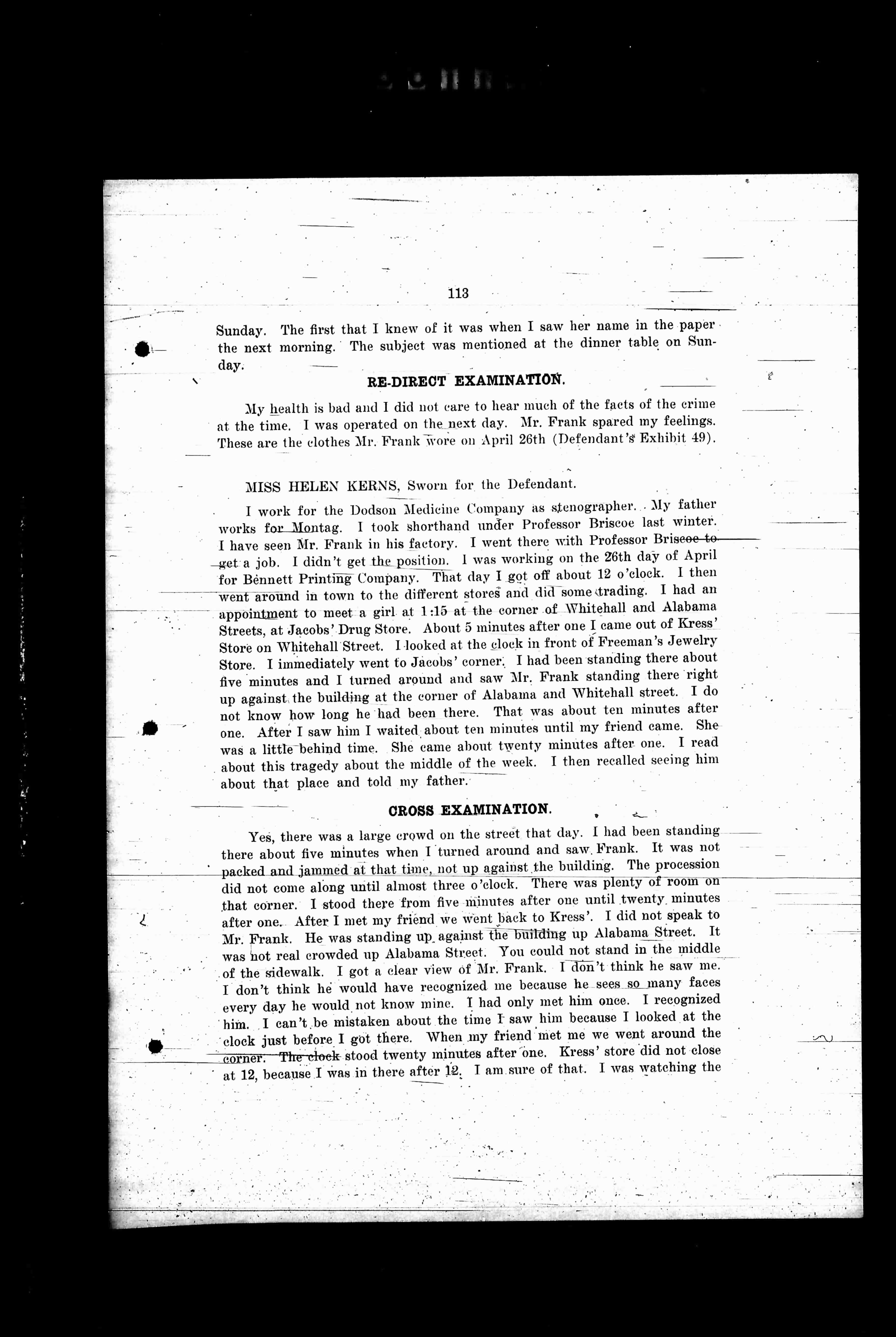 I work for the Dodsom Medicine Company as stenographer. My father works for Montag. I took shorthand under Professor Briseoe last winter. I have seen Mr. Frank in his factory. I went there with Professor Briseoe to get a job. I didn't get the position. I was working on the 26th day of April for Bennett Printing Company. That day I got off about 12 o'clock. I then went around in town to the different stores and did some trading. I had an appointment to meet a girl at 1:15 at the corner of Whitehall and Alabama Streets, at Jacobs' Drug Store. About 5 minutes after I came out of Kress' Store on Whitehall Street. I looked at the clock in front of Freeman's Jewelry Store. I immediately went to Jacobs' corner. I had been standing there about five minutes and I turned around and saw Mr. Frank standing there right up against the building at the corner of Alabama and Whitehall street. I do not know how long he had been there. That was about ten minutes after one. After I saw him I waited about ten minutes until my friend came. She was a little behind time. She came about twenty minutes after one. I read about this tragedy about the middle of the week. I then recalled seeing him about that place and told my father.
