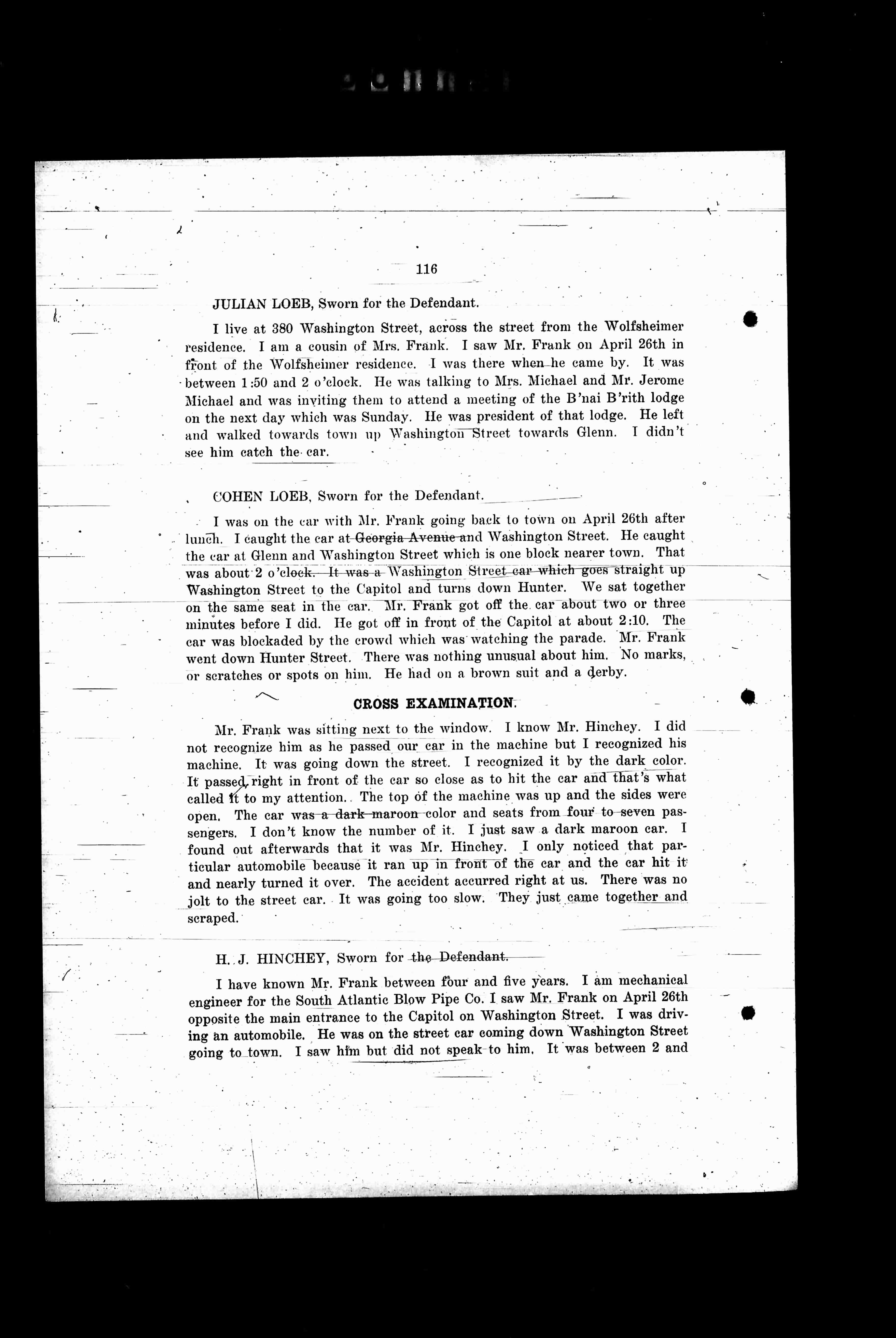 I was on the car with Mr. Frank going back to town on April 26th after lunch. I caught the car at Georgia Avenue and Washington Street. He caught the car at Glenn and Washington Street which is one block nearer town. That was about 2 o’clock. It was a Washington Street car which goes straight up Washington Street to the Capitol and turns down Hunter. We sat together on the same seat in the car. Mr. Frank got off the car about two or three minutes before I did. He got off in front of the Capitol at about 2:10. The car was blockaded by the crowd which was watching the parade. Mr. Frank went down Hunter Street. There was nothing unusual about him. No marks, or scratches or spots on him. He had on a brown suit and a derby.