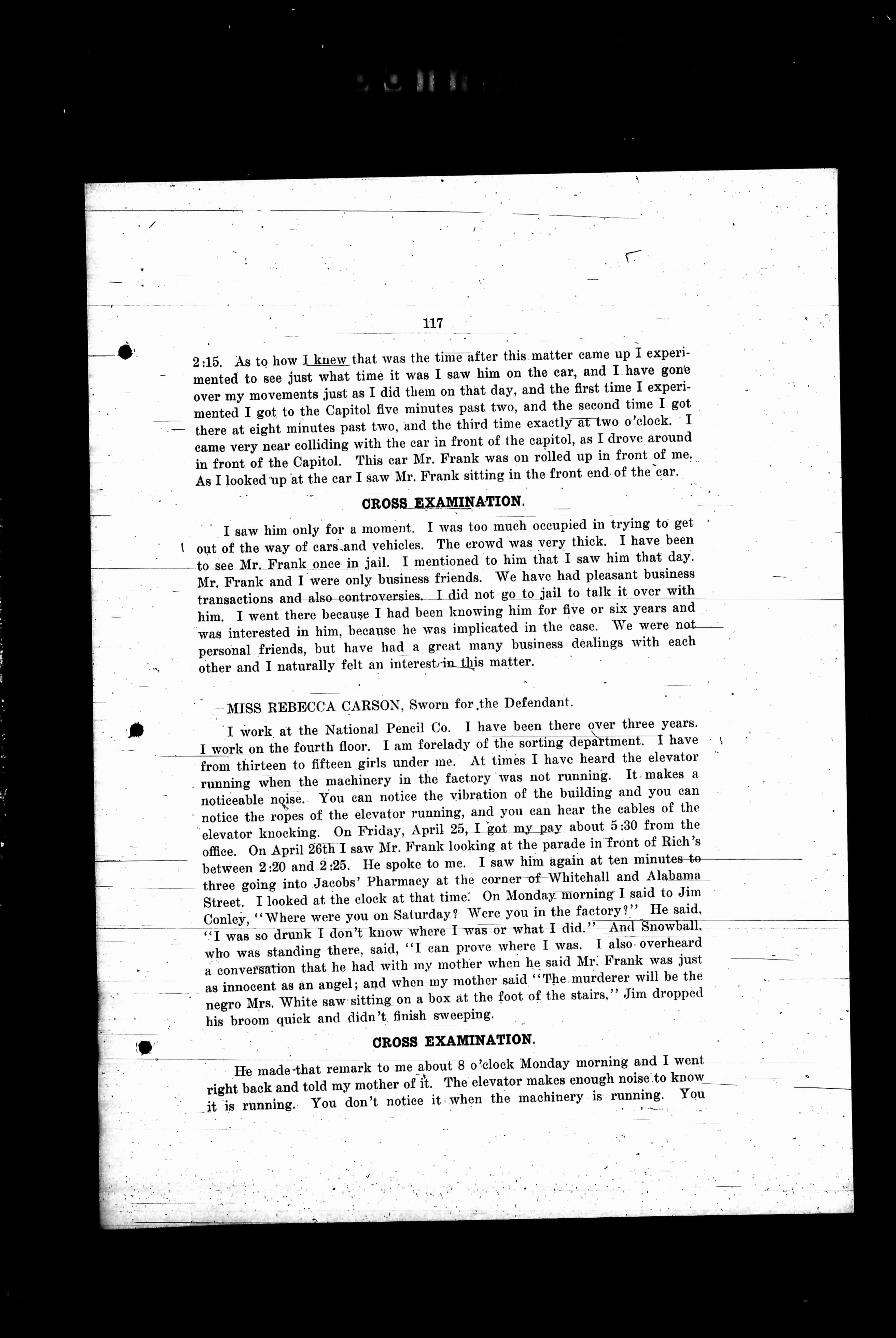 I work at the National Pencil Co. I have been there over three years. I work on the fourth floor. I am forelady of the sorting department. I have from thirteen to fifteen girls under me. At times I have heard the elevator running when the machinery in the factory was not running. It makes a noticeable noise. You can notice the vibration of the building and you can notice the ropes of the elevator running, and you can hear the cables of the elevator knocking. On Friday, April 25th at any time from 5:30 from the office. On April 26th I saw Mr. Frank looking at the parade in front of Rich's between 2:20 and 2:25. He spoke to me. I saw him again at ten minutes to three going into Jacobs' Pharmacy at the corner of Whitehall and Alabama Street. I looked at the clock at that time. On Monday morning I said to Jim Conley, "Where were you on Saturday? Were you in the factory?" He said, "I was so drunk I don't know where I was or what I did." And Snowball who was standing there, said, "I can prove where I was. I also overheard a conversation that he had with my mother when he said Mr. Frank was just as innocent as an angel; and when my mother said "The murderer will be the last one you'd suspect," and he said at the foot of the stairs," Jim dropped his broom quick and didn't finish sweeping.