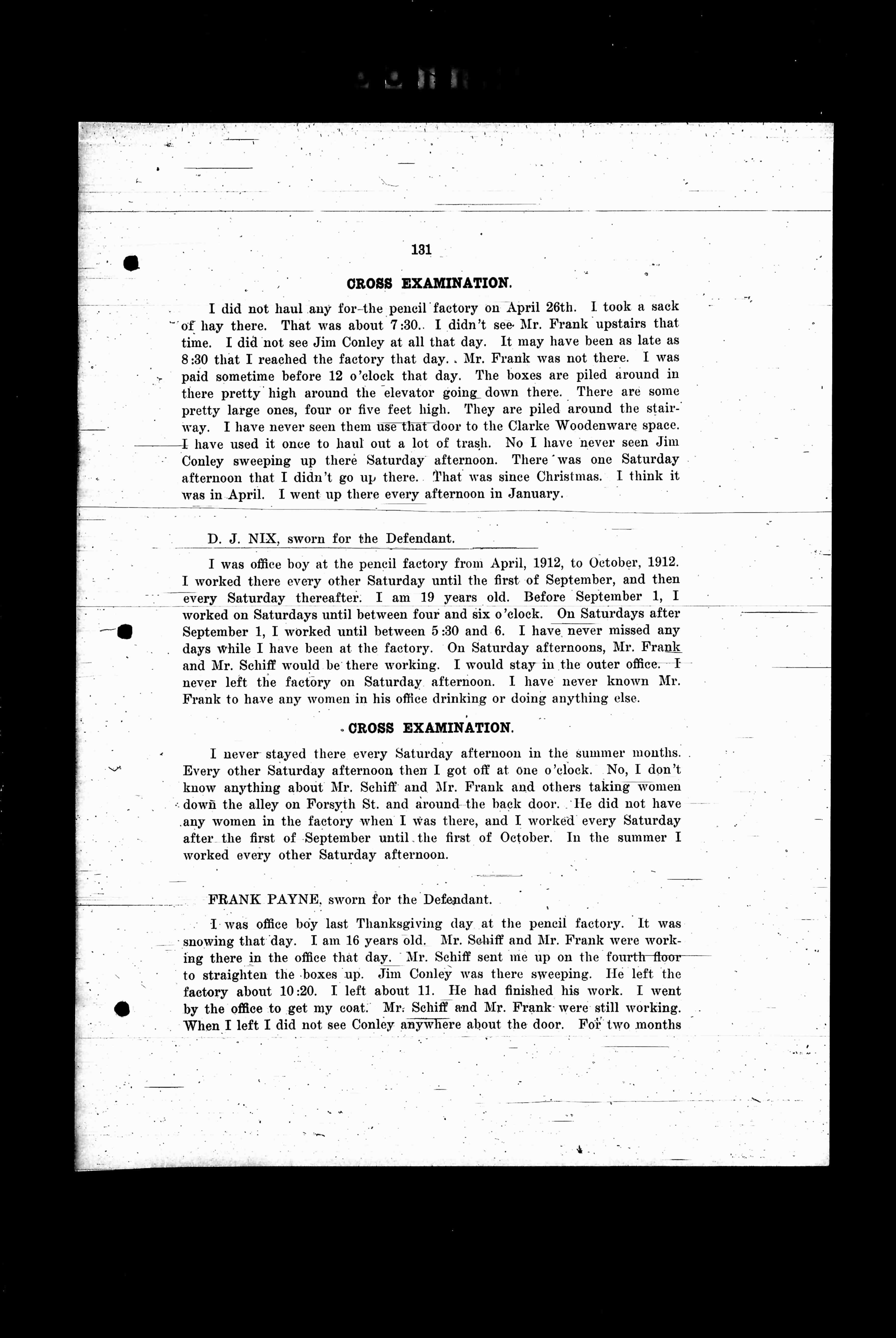 I was office boy at the pencil factory from April, 1912, to October, 1912. I worked there every other Saturday until the first of September, and then every Saturday thereafter. I am 19 years old. Before September 1, I worked on Saturdays until between four and six o'clock. On Saturdays after September 1, I worked until between 5.30 and 6. I have never missed any days while I have been at the factory. On Saturday afternoons, Mr. Frank and Mr. Schiff would be there working. I would stay in the outer office. I never left the factory on Saturday afternoon. I have never known Mr. Frank to have any women in his office drinking or doing anything else.