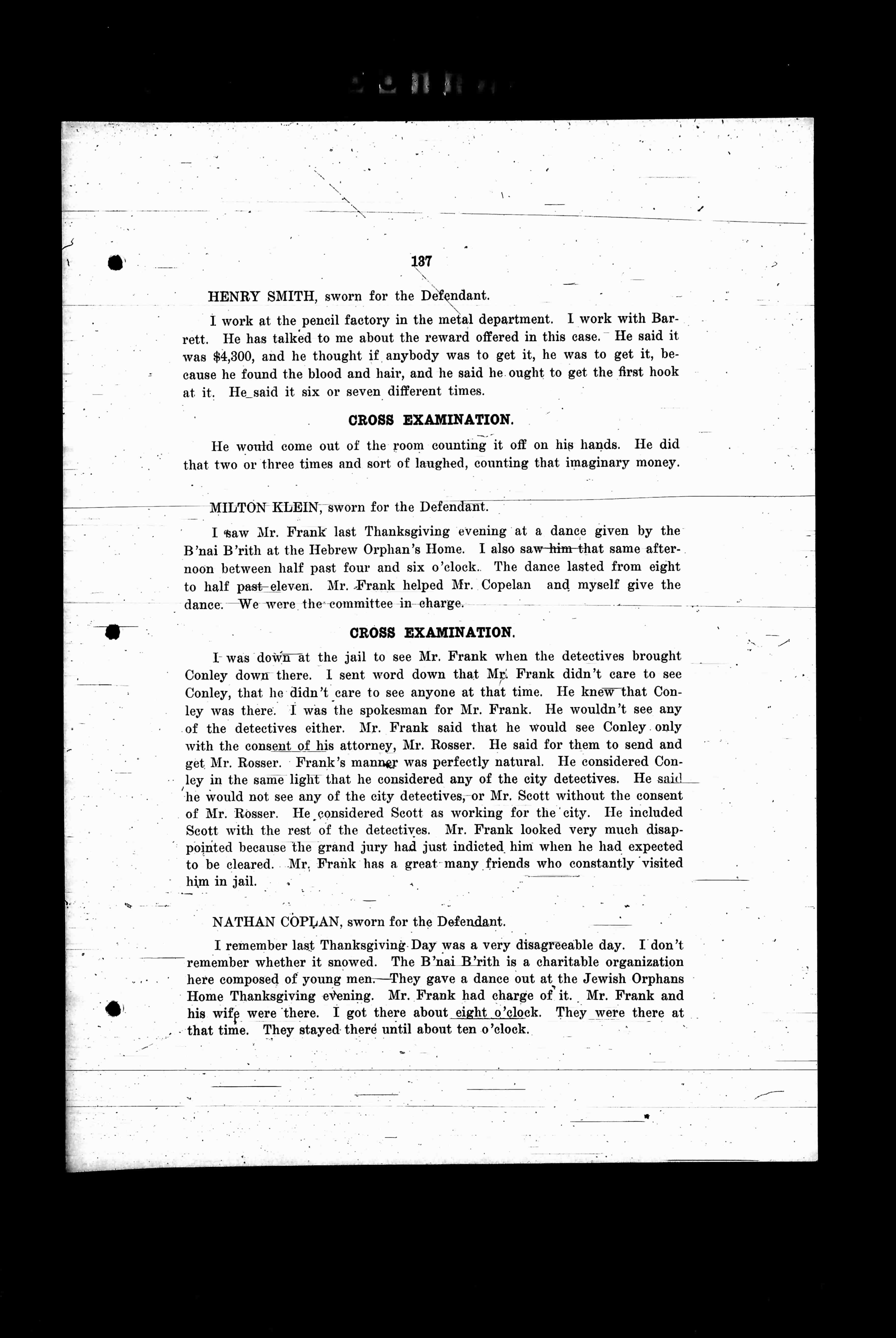 I was down at the jail to see Mr. Frank when the detectives brought Conley down there. I sent word down that Mr. Frank didn't care to see Conley, that he didn't care to see anyone at that time. He knew that Conley was there. I was the spokesman for Mr. Frank. He wouldn't see any of the detectives either. Mr. Frank said that he would see Conley only with the consent of his attorney, Mr. Rosser. He said for them to send and get Mr. Rosser. Frank's manner was perfectly natural. He considered Conley in the same light that he considered any of the city detectives. He said he would not see any of the city detectives. Mr. Scott without the consent of Mr. Rosser. He considered Scott as working for the city. He included Scott with the rest of the detectives. Mr. Frank looked very much disappointed because the grand jury had just indicted him when he had expected to be cleared. Mr. Frank has a great many friends who constantly visited him in jail.