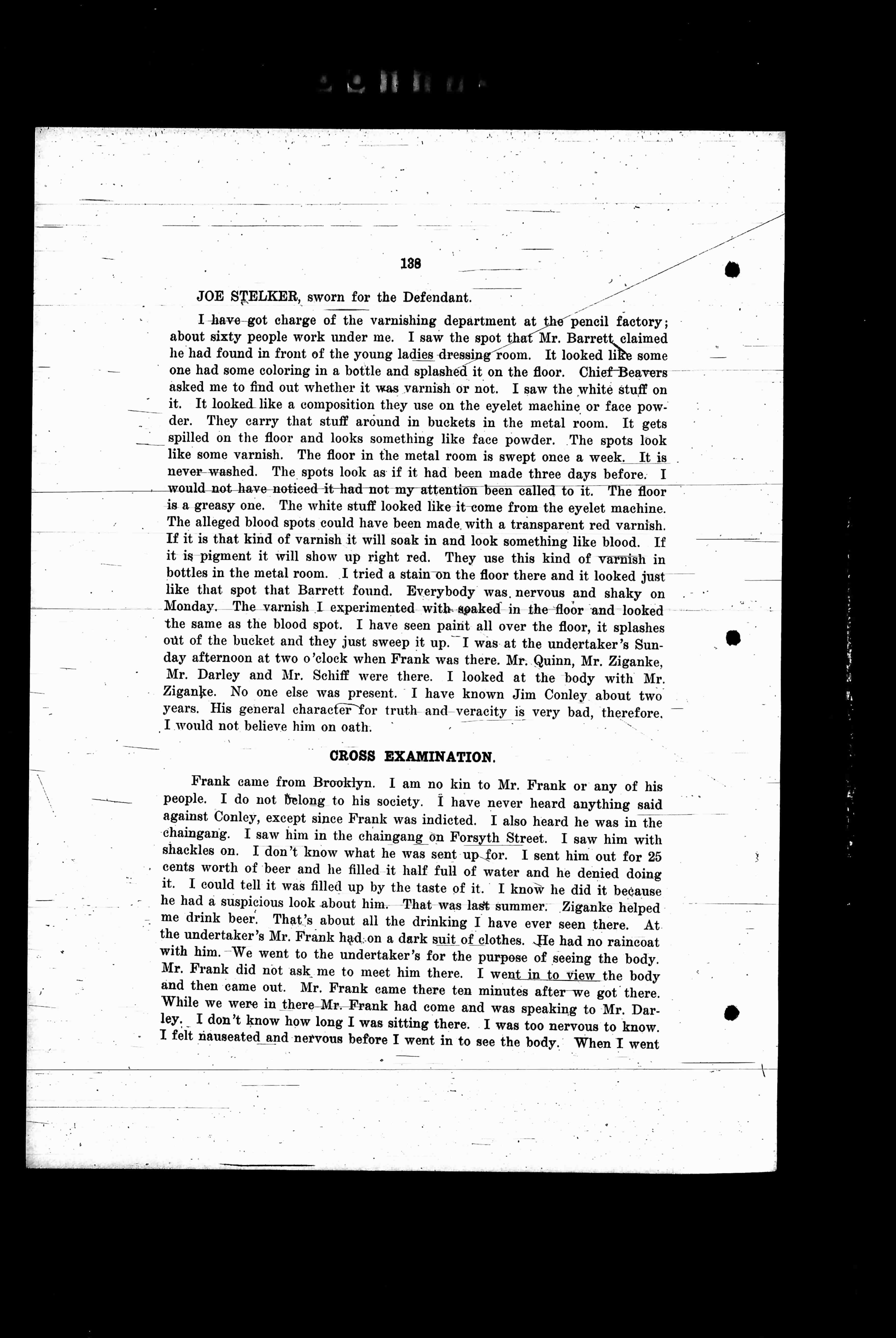 I have got charge of the varnishing department at the pencil factory; about sixty people work under me. I saw the spot that Mr. Barrett claimed he had found in front of the young ladies dressing room. It looked like some one had some coloring in a bottle and splashed it on the floor. Chief Beavers asked me to find out whether it was varnish or not. I saw the white stuff on it. It looked like a composition they use on the eyelet machine or face powder. They carry that stuff around in buckets in the metal room. It gets spilled on the floor and looks something like face powder. The spots look like some varnish. The floor in the metal room is swept once a week. It is never-washed. The spots look as if it had been made three days before. I would not have noticed it-had not my attention been called to it. The floor is a greasy one. The white stuff looked like it come from the eyelet machine. The alleged blood spots could have been made with a transparent red varnish. If it is that kind of varnish it will soak in and look something like blood. If it is pigment it will show up right red. They use this kind of varnish in bottles in the metal room. I tried a stain on the floor there and it looked just like that spot that Barrett found. Everybody was nervous and shaky on Monday. The varnish I experimented with soaked in the floor and looked the same as the blood spot. I have seen paint all over the floor, it splashes out of the bucket and they just sweep it up. I was at the undertaker's Sunday afternoon at two o'clock when Frank was there. Mr. Quinn, Mr. Zigank, Mr. Darley and Mr. Schiff were there. I looked at the body with Mr. Zigank. No one else was present. I have known Jim Conley about two years. His general character for truth and veracity is very bad, therefore I would not believe him on oath.