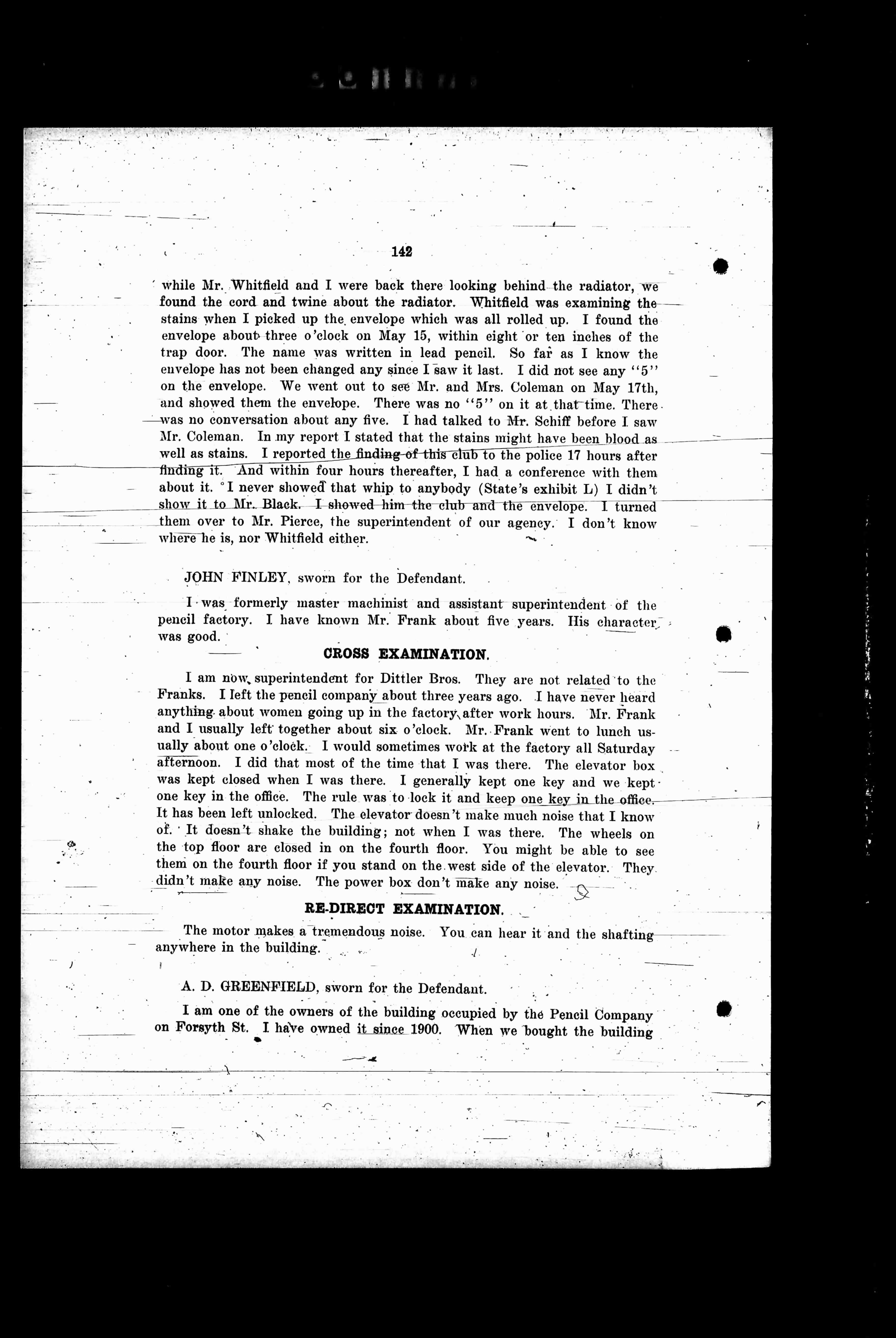 I am now, superintendent for Dittler Bros. They are not related to the Franks. I left the pencil company about three years ago. I have never heard anything about women going up in the factory after work hours. Mr. Frank and I usually left together about six o'clock. Mr. Frank went to lunch usually about one o'clock. I would sometimes work at the factory all Saturday afternoon. I did that most of the time that I was there. The elevator box was kept closed when I was there. I generally kept one key and we kept one key in the office. The rule was to lock it up when one key in the office. It has been left unlocked. The elevator doesn't make much noise that I know of. It doesn't shake the building; not when you are up there. The wheels on the top floor are closed in on the fourth floor. You might be able to see them on the fourth floor if you stand on the west side of the elevator. They didn't make any noise. The power box doesn't make any noise.