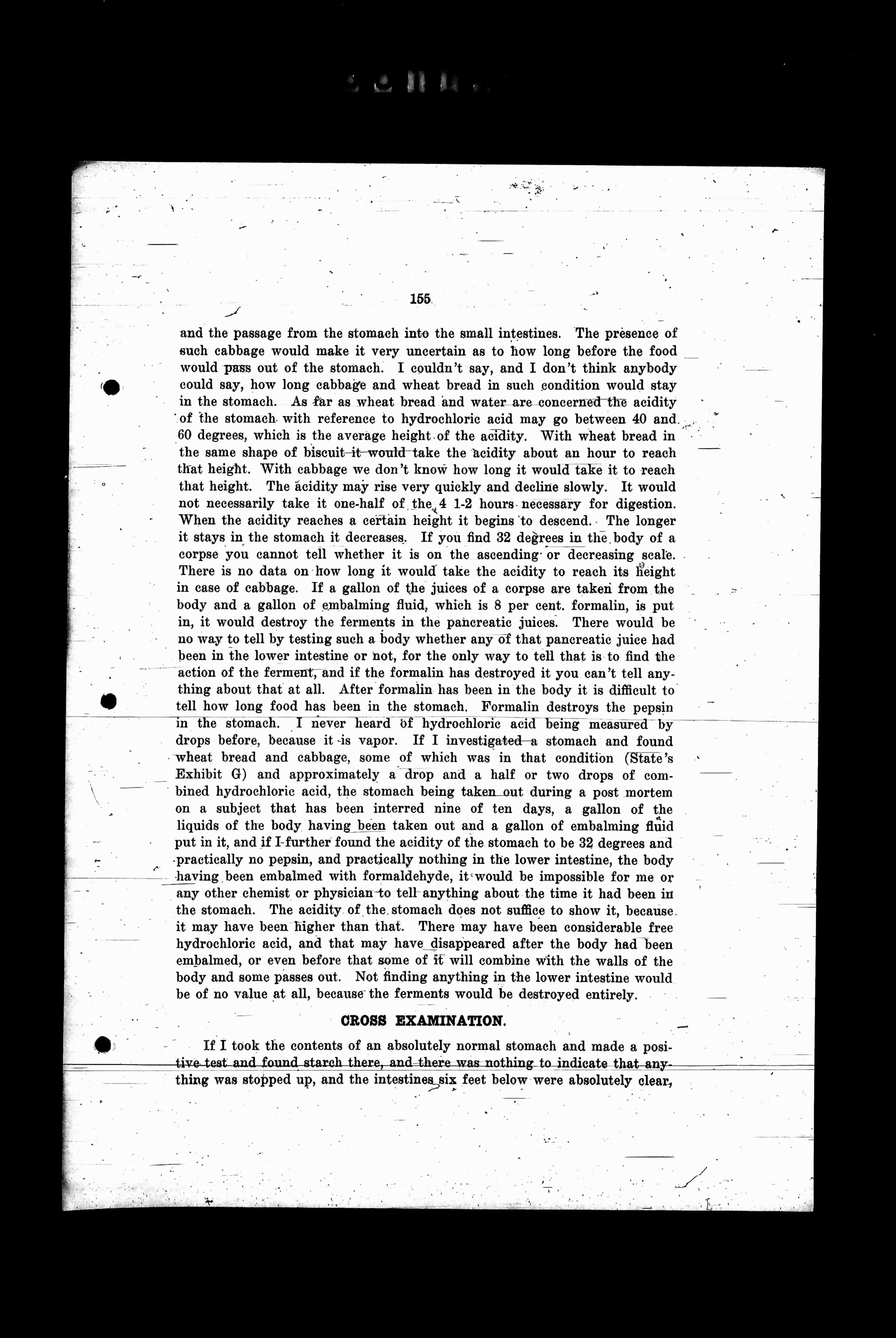 and the passage from the stomach into the small intestines. The presence of such cabbage would make it very uncertain as to how long before the food would pass out of the stomach. I couldn't say, and I don't think anybody could say, how long cabbage and wheat bread in such condition would stay in the stomach. As far as wheat bread and water are concerned the acidity of the stomach with reference to hydrochloric acid may go between 40 and 60 degrees, which is the average height of the acidity. With wheat bread in the same shape of biscuit-it would take the acidity about an hour to reach that height. With cabbage we don't know how long it would take it to reach that height. The acidity may rise very quickly and decline slowly. It would not necessarily take it one-half of the 4-1.2 hours necessary for digestion. When the acidity reaches a certain height it begins to descend. The longer it stays in the stomach it decreases. If you found 32 degrees in the body of a corpse you cannot tell whether it is on the ascending or decreasing scale. There is no data on how long it would take the acidity to reach its height in case of cabbage. If a gallon of the juices of a corpse are taken from the body and a gallon of embalming fluid, which is 8 per cent. formalin, is put in, it would destroy the ferments in the pancreatic juices. There would be no way to tell by testing such a body whether any of that pancreatic juice had been in the lower intestine or not, for the only way to tell that is to find the action of the ferment, and if the formalin has destroyed it you can't tell anything about that at all. After formalin has been in the body it is difficult to tell how long food has been in the stomach. Formalin destroys the pepsin in the stomach. I never heard of hydrochloric acid being measured by drops before, because it is vapor. If I investigated a stomach and found wheat bread and cabbage, some of which was in that condition (State's Exhibit G) and approximately a drop and a half or two drops of combined hydrochloric acid, the stomach being taken out during a post mortem on a subject that has been interred nine or ten days, a gallon of the liquids of the body having been taken out and a gallon of embalming fluid put in it, and if I further found the acidity of the stomach to be 32 degrees and practically no pepsin, and practically nothing in the lower intestine, the body having been embalmed with formaldehyde, it would be impossible for me or any other chemist or physician to tell anything about the time it had been in the stomach. The acidity of the stomach does not suffice to show it, because it may have been higher than that. There may have been considerable free hydrochloric acid, and that may have disappeared after the body had been embalmed, or even before that some of it will combine with the walls of the body and some passes out. Not finding anything in the lower intestine would be of no value at all, because the ferment would be destroyed entirely.