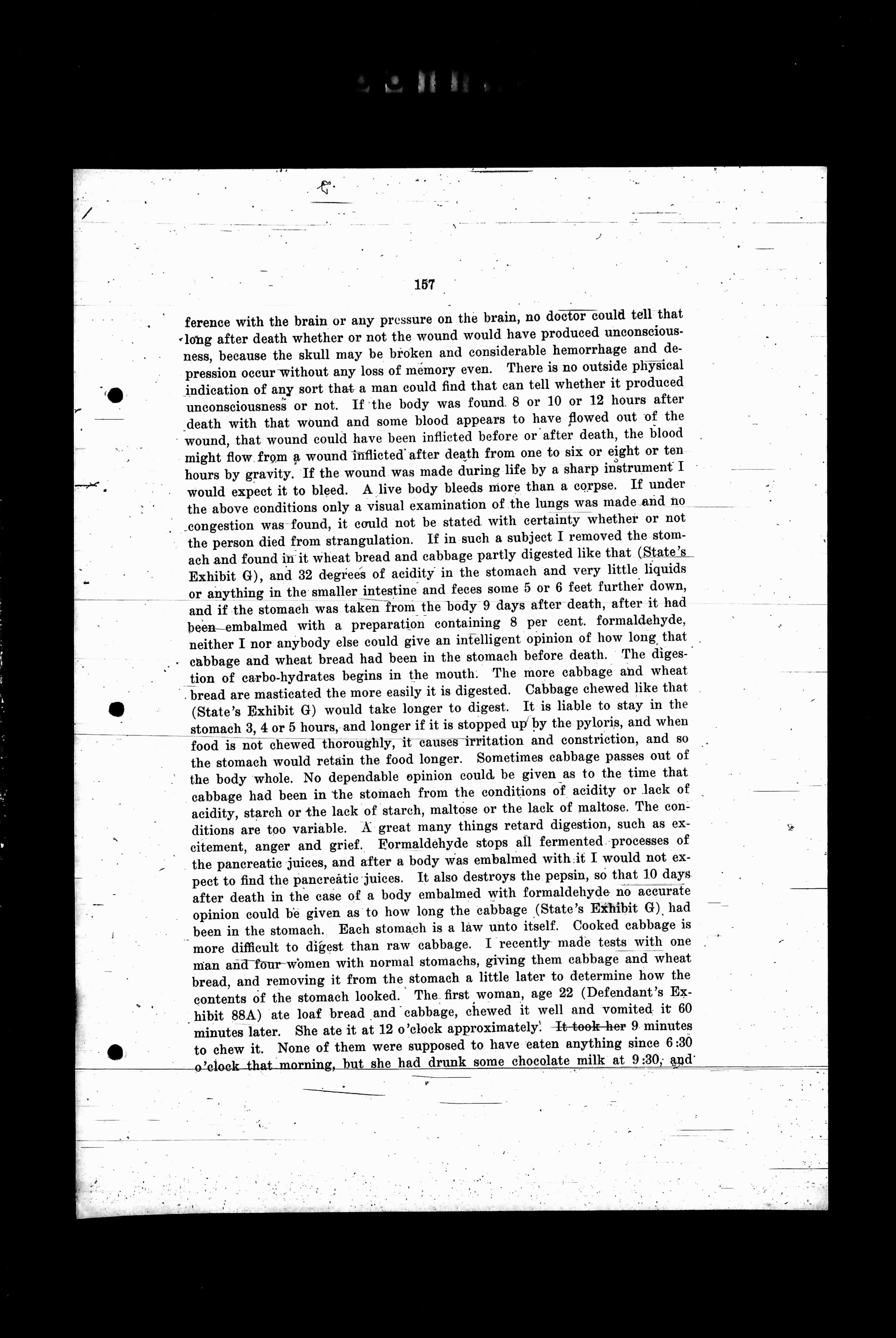 ference with the brain or any pressure on the brain, no doctor could tell that -long after death whether or not the wound would have produced unconsciousness, because the skull may be broken and considerable hemorrhage and de pression occur without any loss of memory. There is no outside physical indication of any sort that a man could find that can tell whether it produced unconsciousness or not. If the body was found 8 or 10 or 12 hours after death, with that wound and some blood appears to have flowed out of the wound, that wound could have been inflicted before or after death, the blood might flow from a wound inflicted after death from one to six or eight or ten hours by gravity. If the wound was made during life by a sharp instrument I would expect it to bleed. A live body bleeds more than a corpse. If under the above conditions only a visual examination of the lungs was made and no congestion was found, it could not be stated with certainty whether or not the person died from strangulation. In such a subject I removed the stomach and found in it wheat bread and cabbage partly digested like that (State's Exhibit G), and 32 degrees of acidity in the stomach and very little liquids or anything in the smaller intestine and feces some 5 or 6 feet further down, and if the stomach was taken from the body 9 days after death, after it had been embalmed with a preparation containing 8 per cent. formaldehyde, neither I nor anybody else could give an intelligent opinion of how long that cabbage and wheat bread had been in the stomach before death. The digestion of carbo-hydrates begins in the mouth. The more cabbage and wheat bread are masticated the more easily it is digested. Cabbage chewed like that (State's Exhibit G) would take longer to digest. It is liable to stay in the stomach 3, 4 or 5 hours, and longer if it is stopped up by the pyloris, and when food is not chewed thoroughly, it causes irritation and constriction, and so the stomach would retain the food longer. Sometimes cabbage passes out of the body whole. No dependable opinion could be given as to the time that cabbage had been in the stomach from the conditions of acidity or lack of acidity, starch or the lack of starch, maltase or the lack of maltase. The conditions are too variable. A great many things retard digestion, such as excitement, anger and grief. Formaldehyde stops all fermented processes of the pancreatic juices, and after a body was embalmed with it I would not expect to find the pancreatic juices. It also destroys the pepsin, so that 10 days after death in the case of a body embalmed with formaldehyde no accurate opinion could be given as to how long the cabbage (State's Exhibit G) had been in the stomach. Each stomach is a law unto itself. Cooked cabbage is more difficult to digest than raw cabbage. I recently made tests with one man and four women with normal stomachs, giving them cabbage and wheat bread, and removing it from the stomach a little later to determine how the contents of the stomach looked. The first woman, age 22 (Defendant's Exhibit 88A) ate a loaf bread and cabbage, chewed it well and vomited it 60 minutes later. She ate it at 12 o'clock approximately. It took her 9 minutes to chew it. None of them were supposed to have eaten anything since 6:30 o'clock that morning, but she had drunk some chocolate milk at 9:30, and