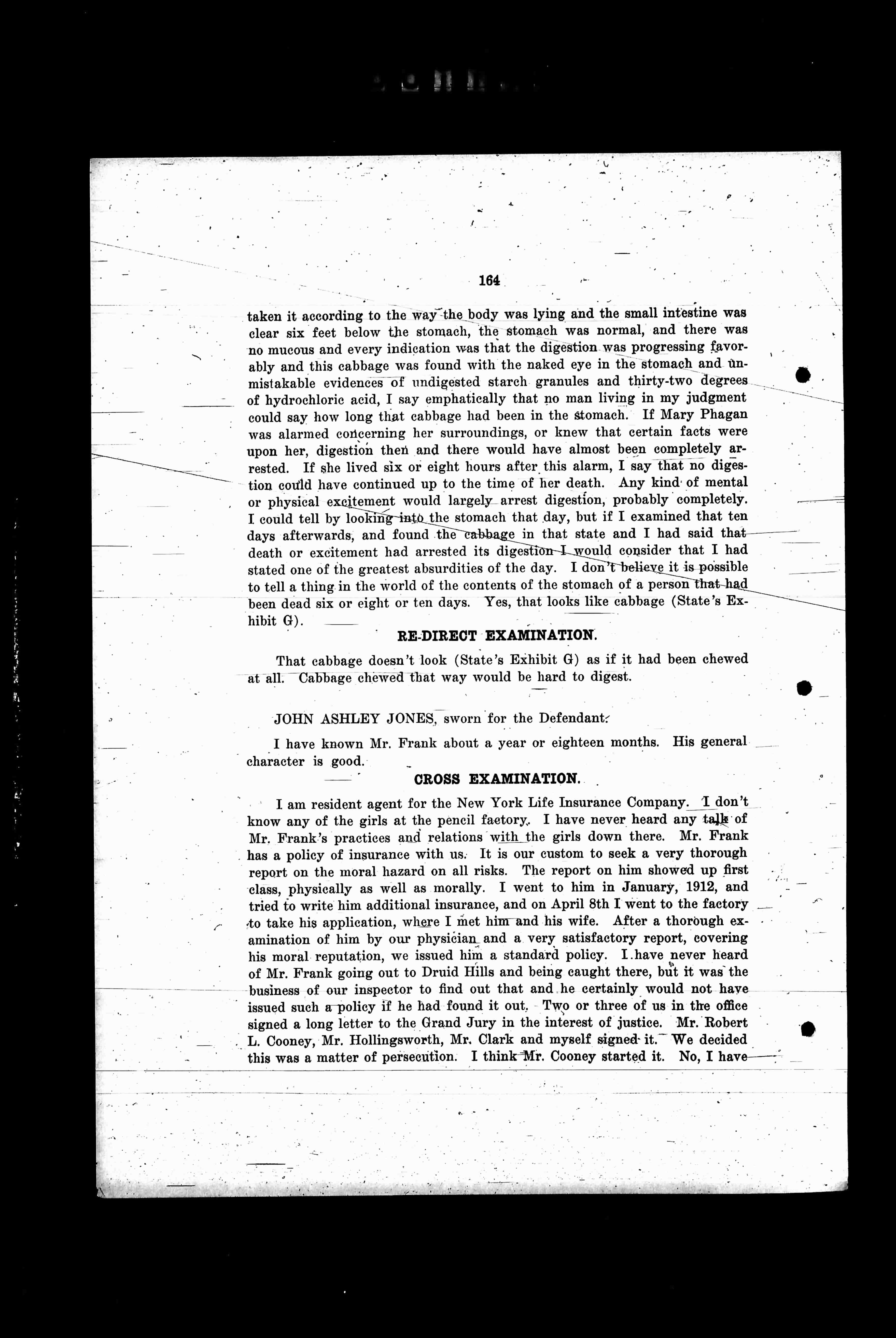 taken it according to the way the body was lying and the small intestine was clear six feet below the stomach. The stomach was normal, and there was no mucous and every indication was that the digestion was progressing favorably and this cabbage was found with the naked eye in the stomach and unmistakable evidences of undigested starch granules and thirty-two degrees of hydrochloric acid, I say emphatically that no man living in my judgement could say how long that cabbage had been in the stomach. If Mary Phagan was alarmed concerning her surroundings, or knew that certain facts were upon her, digestion then and there would have almost been completely arrested. If she lived six or eight hours after this alarm, I say that no digestion could have continued up to the time of her death. Any kind of mental or physical excitement would largely arrest digestion, probably completely. I could tell by looking into the stomach that day, but if I examined that ten days afterwards, and found the cabbage in that state and I had said that death or excitement had arrested its digestion-I would consider that I had stated one of the greatest absurdities of the day. I don't believe it is possible to tell a thing in the world of the contents of the stomach of a person that had been dead six or eight or ten days. Yes, that looks like cabbage (State's Exhibit G).