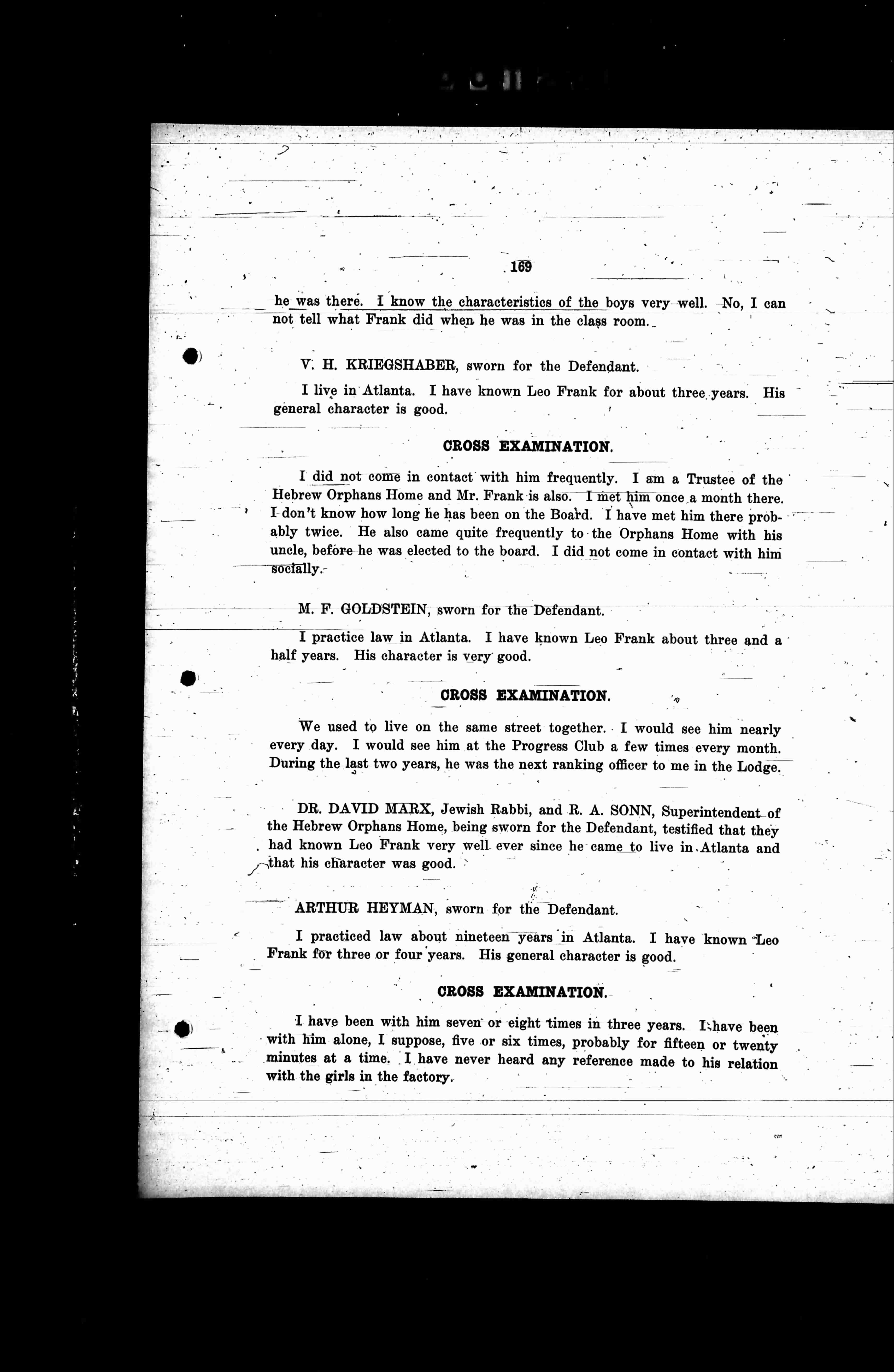 DR. DAVID MARX, Jewish Rabbi, and R. A. SONN, Superintendent of the Hebrew Orphans Home, being sworn for the Defendant, testified that they had known Leo Frank very well ever since he came to live in Atlanta and that his character was good.