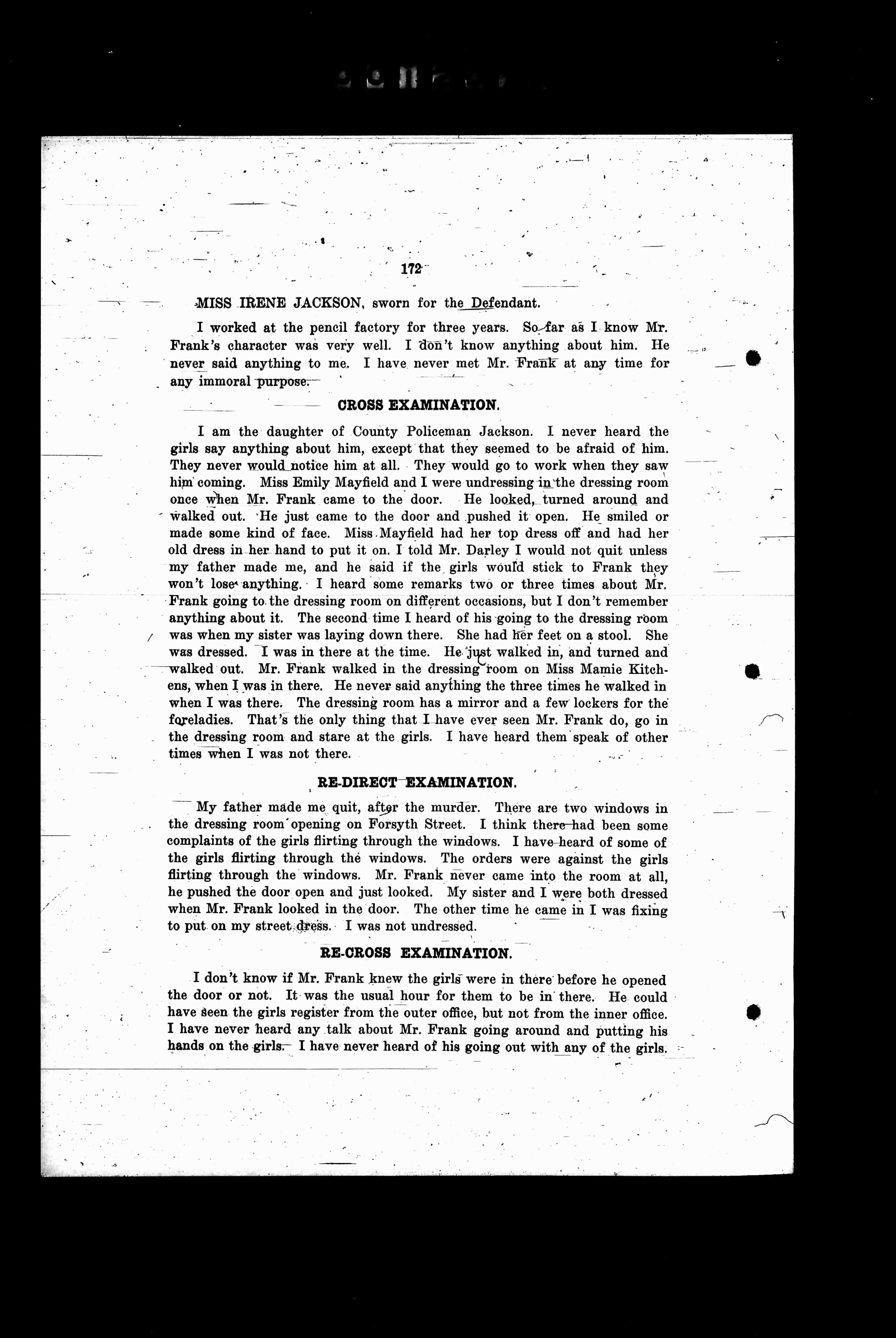 I am the daughter of County Policeman Jackson. I never heard the girls say anything about him, except that they seemed to be afraid of him. They never would notice him at all. They would go to work when they saw him coming. Miss Emily Mayfield and I were undressing in the dressing room once when Mr. Frank came to the door. He looked, turned around and walked out. He just came to the door and pushed it open. He smiled or made some kind of face. Miss Mayfield had her topdress off and had her old dress in her hand to put it on. I told Mr. Darley I would not quit unless my father made me, and he said if the girls would stick to Frank they won't lose anything. I heard some remarks two or three times about Mr. Frank going to the dressing room on different occasions, but I don't remember anything about it. The second time I heard of his going to the dressing room was when my sister was laying down there. She had her feet on a stool. She was dressed. I was in there at the time. He just walked in, and turned and walked out. Mr. Frank walked in the dressing room on Miss Mamie Kitchens, when I was in there. He never said anything the three times he walked in when I was there. The dressing room has a mirror and a few lockers for the foreladies. That's the only thing that I have ever seen Mr. Frank do, go in the dressing room and stare at the girls. I have heard them speak of other times when I was not there.