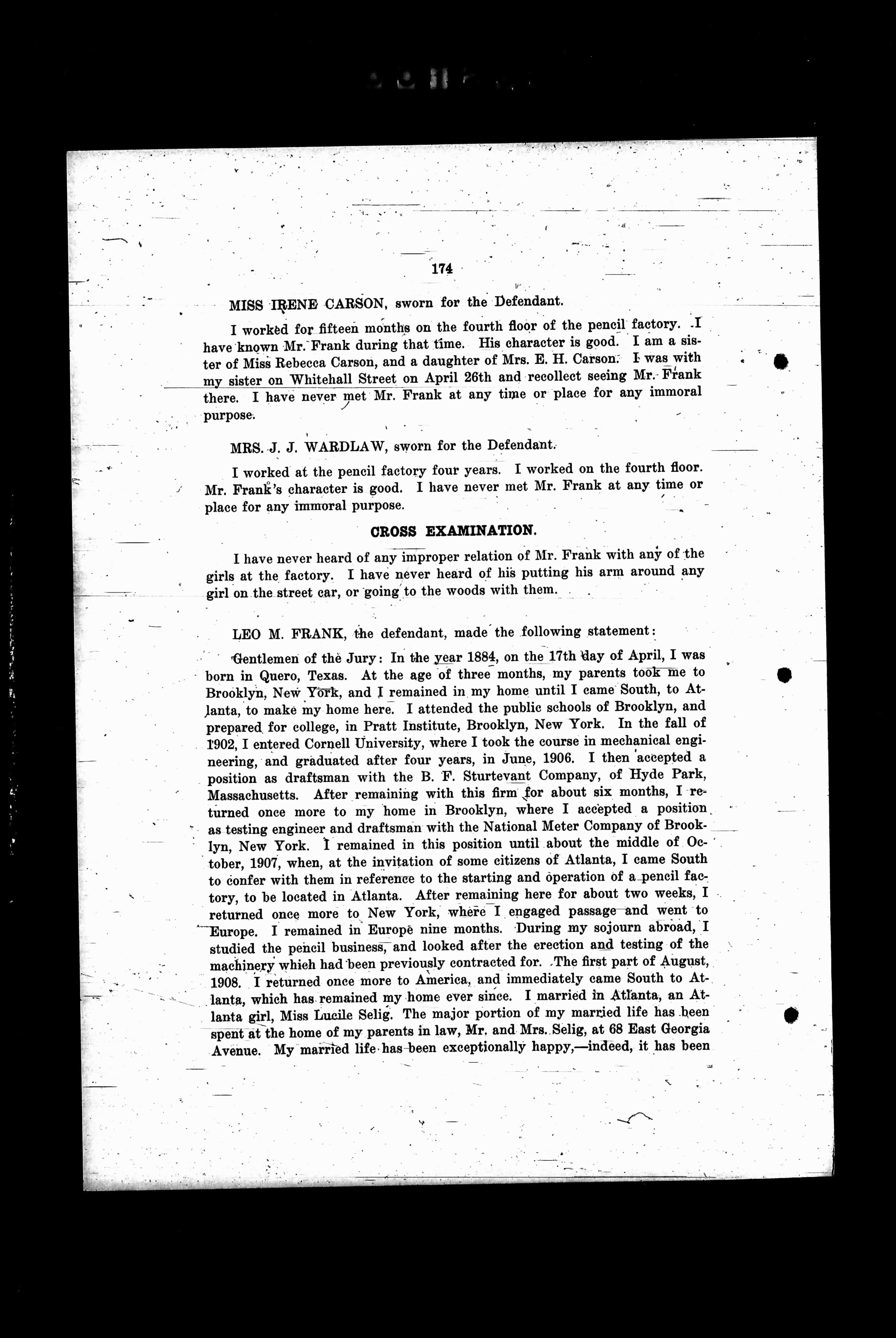 Gentlemen of the Jury: In the year 1884, on the 17th day of April, I was born in Quero, Texas. At the age of three months, my parents took me to Brooklyn, New York, and I remained in my home until I came South, to Atlanta, to make my home here. I attended the public schools of Brooklyn, and prepared for college, in Pratt Institute, Brooklyn, New York. In the fall of 1902, I entered Cornell University, where I took the course in mechanical engineering, and graduated after four years, in June, 1906. I then accepted a position as draftsman with the B. F. Sturtevant Company, of Hyde Park, Massachusetts. After remaining with their firm for about six months, I returned once more to my home in Brooklyn, where I accepted a position as testing engineer and draftsman with the National Meter Company of Brooklyn, New York. I remained in this position until about the middle of October, 1907, when, at the invitation of some citizens of Atlanta, I came South to confer with them in reference to the starting and operation of a pencil factory, to be located in Atlanta. After remaining here for about two weeks, I returned once more to New York, where I engaged passage and went to Europe. I remained in Europe nine months. During my sojourn abroad, I studied the pencil business, and looked after the erection and testing of the machinery which had been previously contracted for. The first part of August, 1908, I returned once more to America, and immediately came South to Atlanta, which has remained my home ever since. I married in Atlanta, an Atlanta girl, Miss Lucile Selig. The major portion of my married life has been spent at the home of my parents in law, Mr. and Mrs. Selig, at 68 East Georgia Avenue. My married life has been exceptionally happy - indeed, it has been
