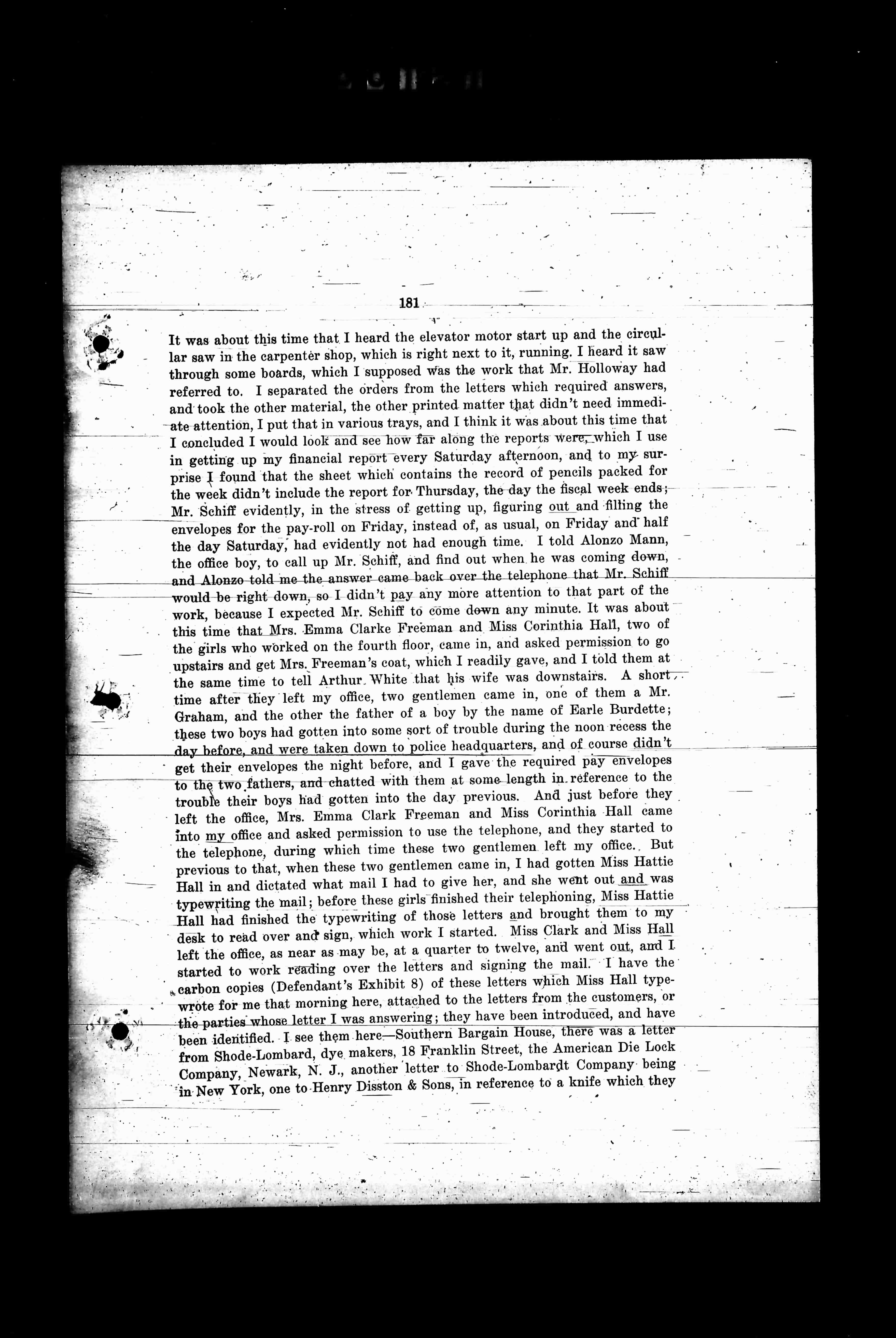 It was about this time that I heard the elevator motor start up and the circular saw in the carpenter shop, which is right next to it, running. I heard it saw through some boards, which I supposed was the work that Mr. Holloway had referred to. I separated the orders from the letters which required answers, and took the other material, the other printed matter that didn't need immediate attention. I put that in various trays, and I think it was about this time that I concluded I would look and see how far along the reports were; which I use in getting up my financial report every Saturday afternoon, and to my surprise I found that the sheet which contains the record of pencils packed for the week didn't include the report for Thursday, the day the fiscal week ends; Mr. Schiff evidently, in the stress of getting up, figuring out and filling the envelopes for the pay-roll on Friday, instead of, as usual, on Friday and half the day Saturday, had evidently not had enough time. I told Alonzo Mann, the office boy, to call up Mr. Schiff, and find out when he was coming down, and Alonzo told me the answer came back over the telephone that Mr. Schiff would be right down, so I didn't pay any more attention to that part of the work, because I expected Mr. Schiff to come down any minute. It was about this time that Mrs. Emma Clarke Freeman and Miss Corinthia Hall, two of the girls who worked on the fourth floor, came in, and asked permission to go upstairs and get Mrs. Freeman's coat, which I readily gave, and I told them at the same time to tell Arthur White that his wife was downstairs. A short time after they left my office, two gentlemen came in, one of them a Mr. Graham, and the other the father of a boy by the name of Earle Burdette; these two boys had gotten into some sort of trouble during the noon recess the day before, and were taken down to police headquarters, and of course didn't get their envelopes the night before, and I gave the required pay envelopes to the two fathers, and chatted with them at some length in reference to the trouble their boys had gotten into the day previous. And just before they left the office, Mrs. Emma Clarke Freeman and Miss Corinthia Hall came into my office and asked permission to use the telephone, and they started to the telephone, during which time these two gentlemen left my office. But previous to that, when these two gentlemen came in, I had gotten Miss Hattie Hall in and dictated what mail I had to give her, and she went out and was typewriting the mail; before these girls finished their telephoning, Miss Hattie Hall had finished the typewriting of those letters and brought them to my desk to read over and sign, which work I started. Miss Clark and Miss Hall left the office, as near as may be, at a quarter to twelve, and went out, and I started to work reading over the letters and signing the mail. I have the carbon copies (Defendant's Exhibit 8) of these letters which Miss Hall typewrote for me that morning here, attached to the letters from the customers, or the parties whose letter I was answering; they have been introduced, and have been identified. I see them here—Southern Bargain House, there was a letter from Shode-Lombard, dye makers, 18 Franklin Street, the American Die Lock Company, Newark, N. J., another letter to Shode-Lombard Company being in New York, one to Henry Disston & Sons, in reference to a knife which they