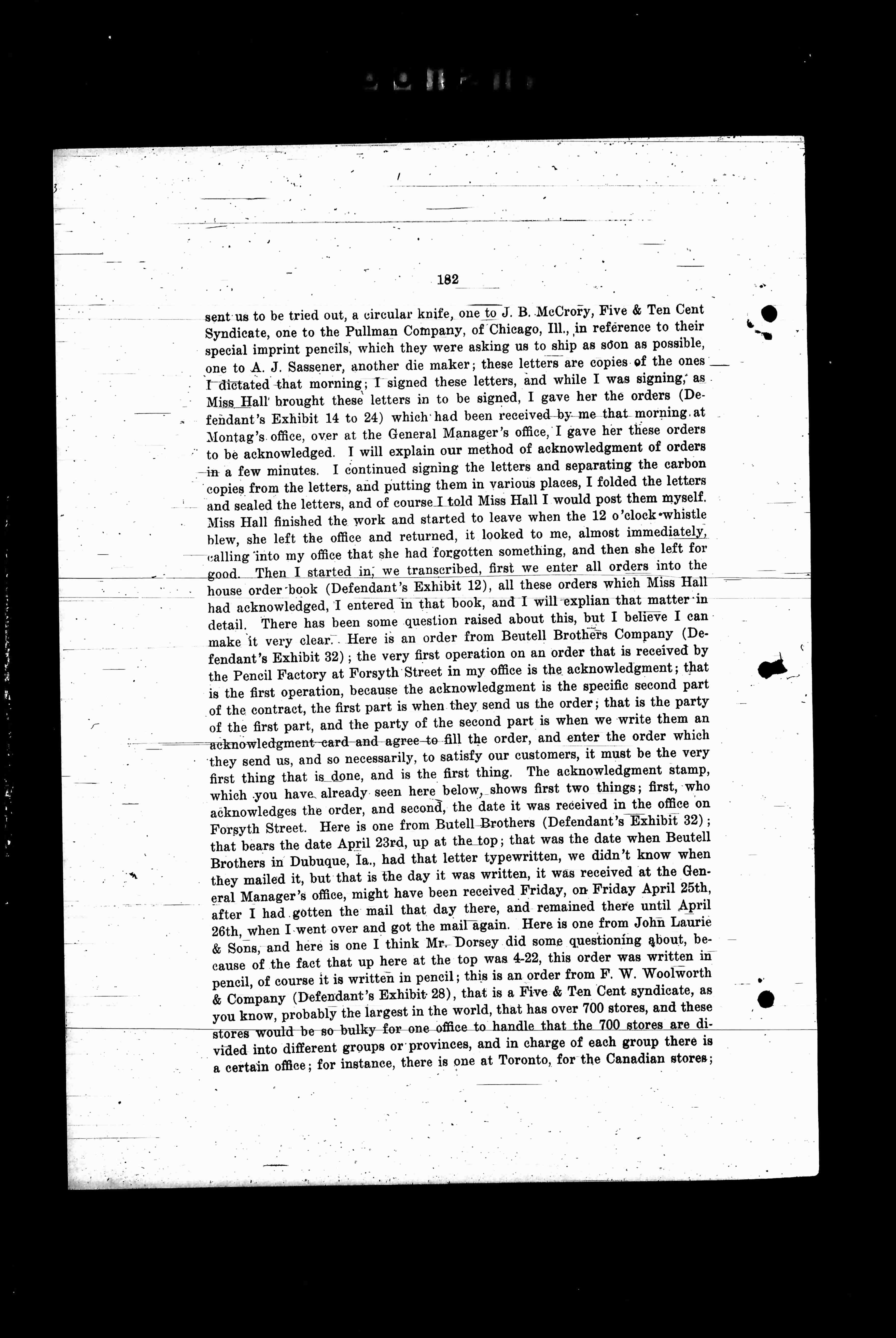sent us to be tried out, a circular knife, one to J. B. McCrory, Five & Ten Cent Syndicate, one to the Pullman Company, of Chicago, Ill., in reference to their special imprint pencils, which they were asking us to ship as soon as possible, one to A. J. Sassener, another die maker, two letters are copies of the ones I dictated that morning; I signed these letters, and while I was signing, as Miss Hall brought these letters in to be signed, I gave her the orders (Defendant's Exhibit 14 to 24) which had been received by me that morning at Montag's office, over at the General Manager's office. I gave her these orders to be acknowledged. I will explain our method of acknowledgment of orders in a few minutes. I continued signing the letters and separating the carbon copies from the letters, and putting them in various places, I folded the letters and sealed the letters, and of course I told Miss Hall I would post them myself. Miss Hall finished the work and started to leave when the 12 o'clock whistle blew, she left the office and returned; it looked to me, almost immediately, calling into my office that she had forgotten something, and then she left for good. Then I started in; we transcribed, first we enter all orders into the house order-book (Defendant's Exhibit 12), all these orders which Miss Hall had acknowledged, I entered in that book, and I will explain that matter in detail. There has been some question raised about this, but I believe I can make it very clear. Here is an order from Beutell Brothers' Company (Defendant's Exhibit 32); the very first operation on an order that is received by the Pencil Factory at Forsyth Street in my office is the acknowledgment; that is the first operation, because the acknowledgment is the specific second part of the contract, the first part is when they send us the order; that is the party of the first part, and the party of the second part is when we write them an acknowledgment-card-and-agree-to-fill the order, and enter the order which they send us, and so necessarily, to satisfy our customers, it must be the very first thing that is done, and is the first thing. The acknowledgment stamp, which you have already seen here below, shows first two things; first, who acknowledges the order, and second, the date it was received in the office on Forsyth Street. Here is one from Beutell Brothers (Defendant's Exhibit 32); that bears the date April 23rd, up at the top, that was the date when Beutell Brothers in Dubuque, Ia., had that letter typewritten, we didn't know when they mailed it, but that is the day it was written, it was received at the General Manager's office, might have been received Friday, on Friday April 25th, after I had gotten the mail that day there, and remained there until April 26th, when I went over and got the mail again. Here is one from John Laurie & Sons, and here is one I think Mr. Dorsey did some questioning about, because of the fact that up here at the top was 4-22, this order was written in pencil, of course it is written in pencil; this is an order from F. W. Woolworth & Company (Defendant's Exhibit 34), that is a Five & Ten Cent syndicate, as you know, probably the largest in the world, that has over 700 stores, and these stores would be so bulky for one office to handle that the 700 stores are divided into different groups or provinces, and in charge of each group there is a certain office; for instance, there is one at Toronto, for the Canadian stores;
