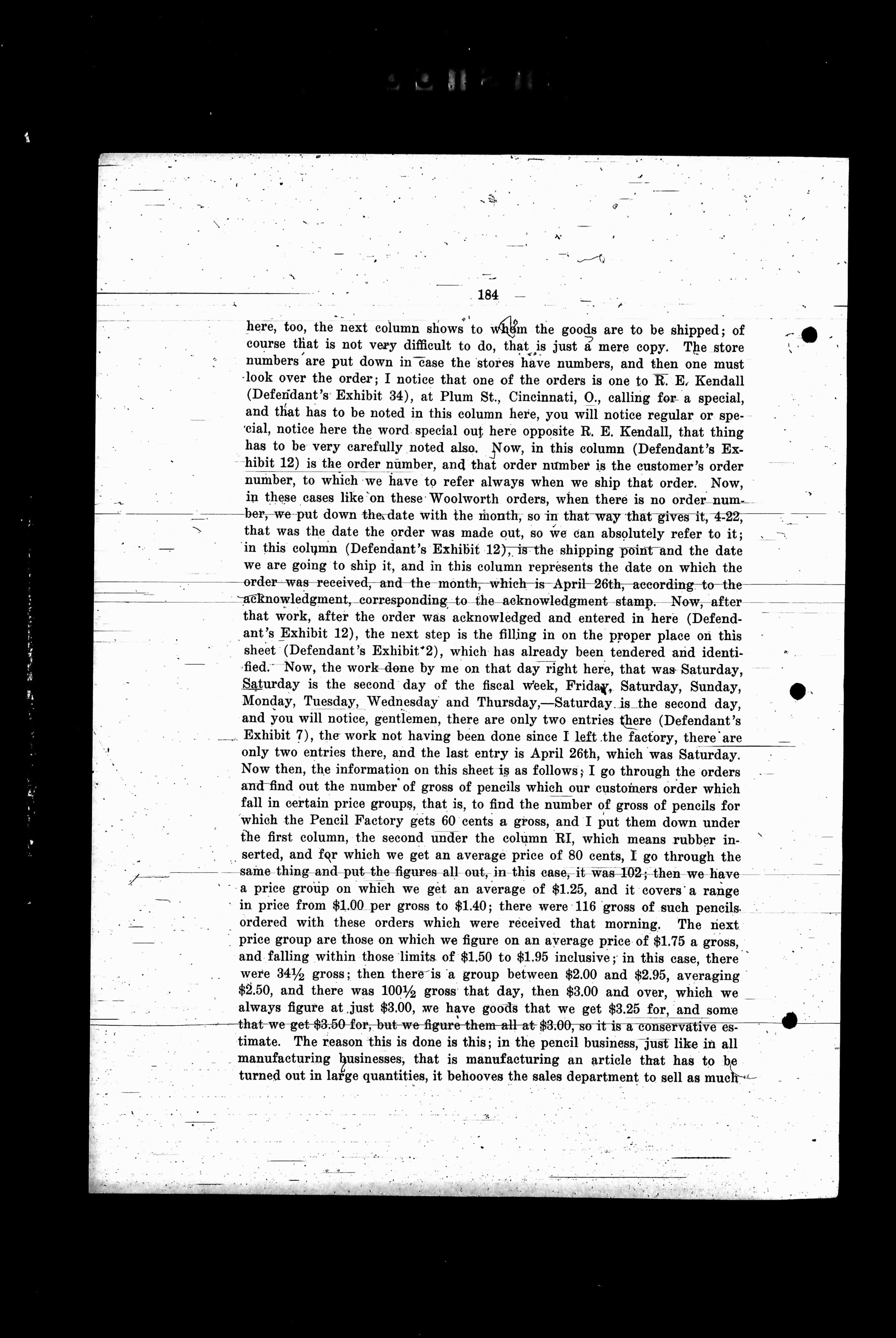 here, too, the next column shows to whom the goods are to be shipped; of course that is not very difficult to figure out, it is just a mere copy. The store numbers are put down in case that store have numbers, and then one must look over the order; I notice that one of the orders is one to R. E. Kendall (Defendant's Exhibit 34), at Plum St., Cincinnati, O., calling for a special, and that has to be noted in this column here, you will notice regular or special, notice here the word special out here opposite R. E. Kendall, that thing has to be very carefully noted also. Now, in this column (Defendant's Exhibit 12) is the order number, and that order number is the customer's order number, to which we have to refer always when we ship that order. Now, in these cases like on these Woolworth orders, when there is no order number, we put down the date with the month, so in that way that gives it, 4-22, that was the date the order was made out, so we can absolutely refer to it; in this column (Defendant's Exhibit 12), is the shipping point and the date we are going to ship it, and in this column represents the date on which the order was received, and the month, which is April 26th, according to the acknowledgment, corresponding to the acknowledgment stamp. Now, after that work, after the order was acknowledged and entered in here (Defendant's Exhibit 12), the next step is the filling in on the proper place on this sheet (Defendant's Exhibit 2), which has already been tendered and identified. Now, the work done by me on that day right here, that was Saturday, Saturday is the second day of the fiscal week, Friday, Saturday, Sunday, Monday, Tuesday, Wednesday and Thursday—Saturday is the second day, and you will notice, gentlemen, there are only two entries there (Defendant's Exhibit 7), the work not having been done since I left the factory, there are only two entries there, and the last entry is April 26th, which was Saturday. Now then, the information on this sheet is as follows; I go through the orders and find out the number of gross of pencils which our customers order which fall in certain price groups, that is, find out the number of gross of pencils for which the Pencil Factory gets 60 cents a gross, and I put them down under the first column, the second under the column R1, which means rubber inserted, and for which we get an average price of 80 cents, I go through the same thing and put the figures all out; in this case, it was 102; then we have a price group on which we get an average of $1.25, and it covers a range in price from $1.00 per gross to $1.40; there were 116 gross of such pencils. ordered with these orders which were received that morning. The next price group are those on which we figure on an average price of $1.75 a gross, and falling within those limits of $1.50 to $1.95 inclusive; in this case, there were 34½ gross; then there is a group between $2.00 and $2.95, averaging $2.50, and there was 100% gross that day, then $3.00 and over, which we always figure at just $3.00, we have goods that we get $3.25 for, and some that we get $3.50 for, but we figure them all at $3.00, so it is a conservative estimate. The reason this is done is this; in the pencil business, just like in all manufacturing businesses, that is manufacturing an article that has to be turned out in large quantities, it behooves the sales department to sell as much-