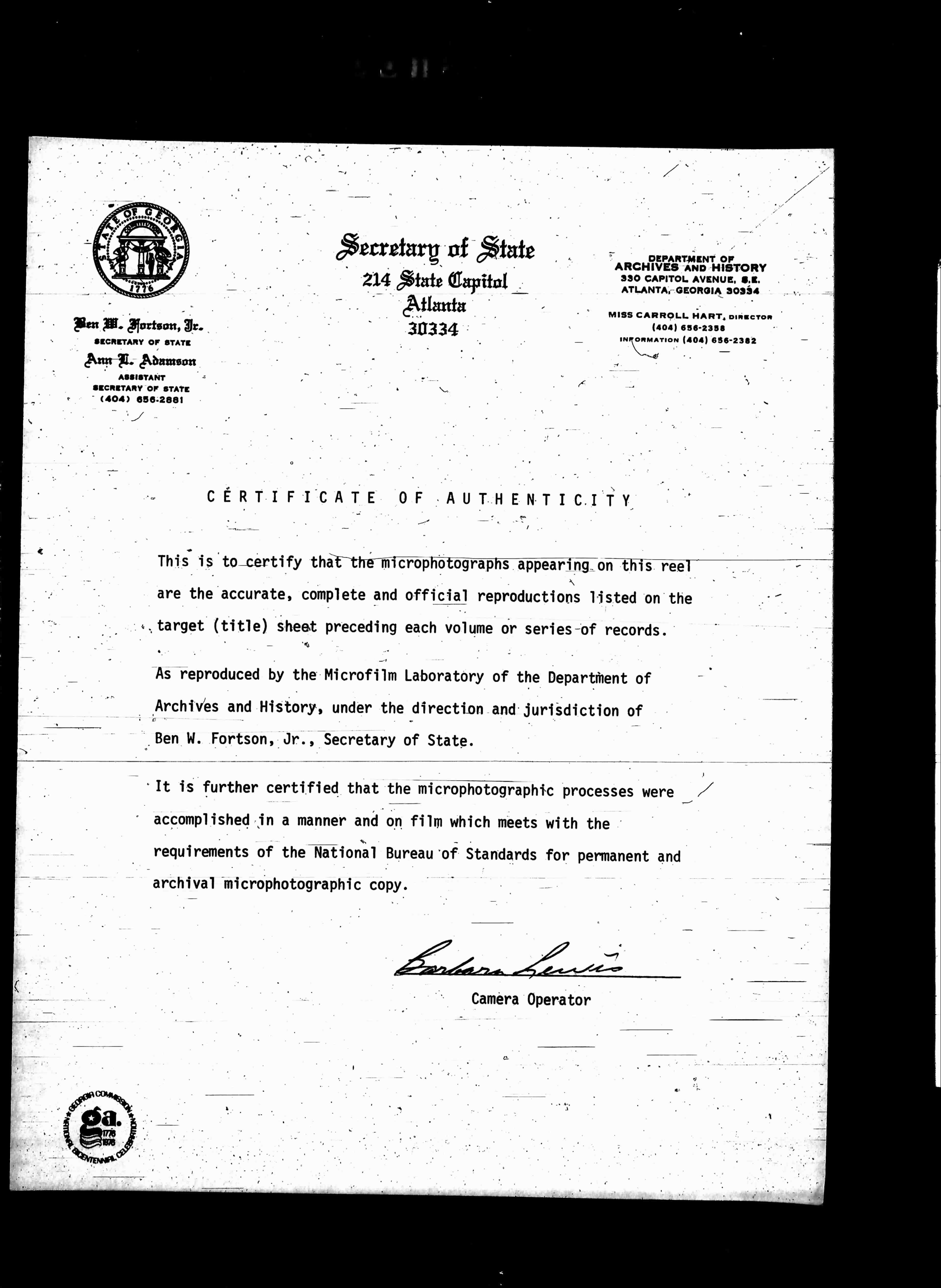 As reproduced by the Microfilm Laboratory of the Department of Archives and History, under the direction and jurisdiction of Ben W. Fortson, Jr., Secretary of State.