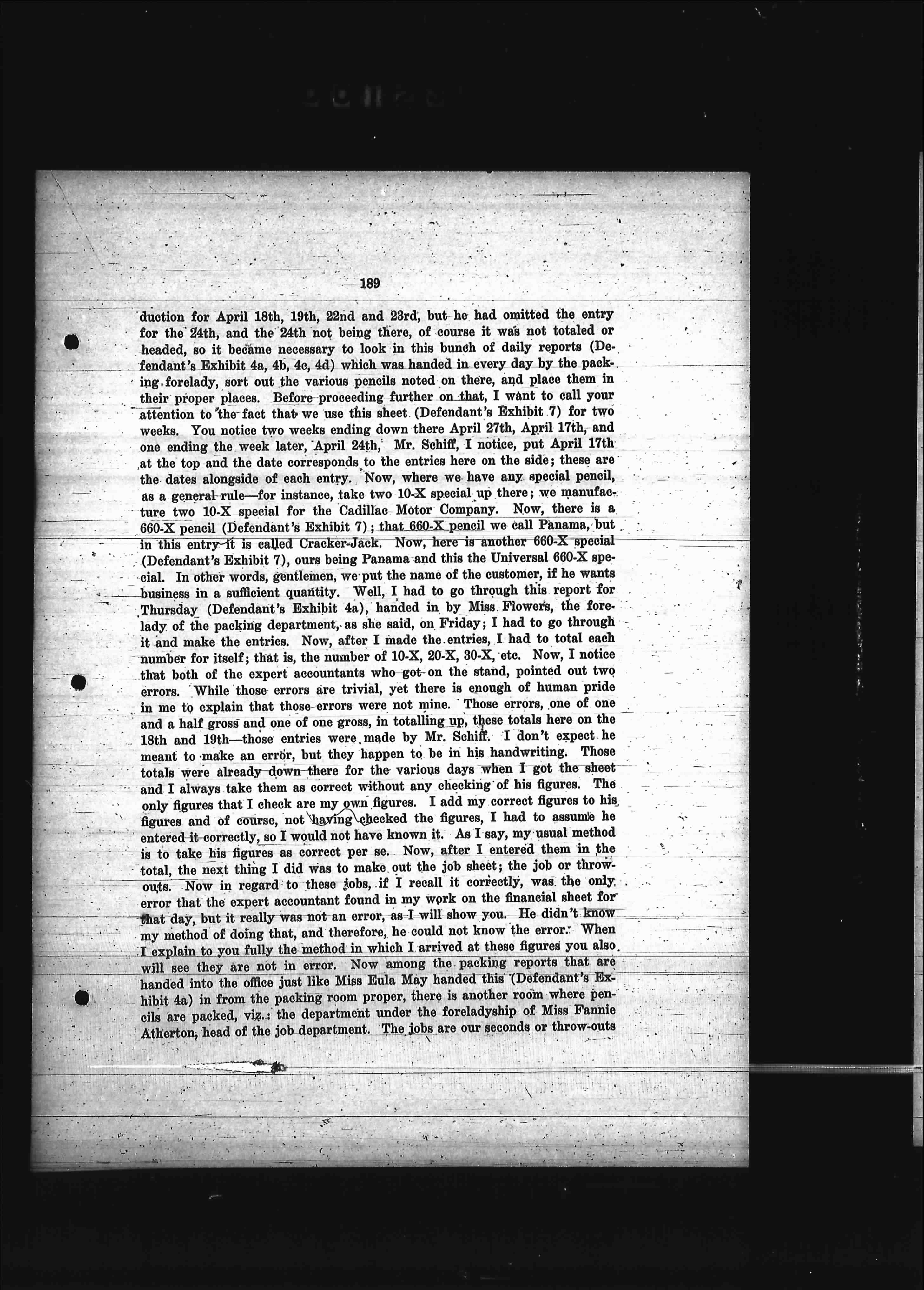 duction for April 18th, 19th, 22nd and 23rd, but he had omitted the entry for the 24th, and the 24th not being there, of course it was not totaled or headed, so it became necessary to look in this bunch of daily reports (Defendant's Exhibit 4a, 4b, 4c, 4d,) which was handed in, and then place them in, forelady, sort out the various pencils noted on there, and place them in their proper places. Before proceeding further on that, I want to call your attention to the fact that we use this sheet (Defendant's Exhibit 7) for two weeks. You notice two weeks ending down there April 27th, April 17th, and one ending the week later, April 24th, Mr. Schiff, I notice, put April 17th at the top and the date corresponds to the entries here on the side; these are the dates alongside of each entry. Now where we have any special pencil, as a general rule—for instance, take two 10-X special up there; we manufacture two 10-X special for the Cadillac Motor Company. Now, there is a 660-X pencil (Defendant's Exhibit 7); that 660-X pencil we call Panama, but in this entry—it is called Cracker-Jack. Now, here is another 660-X special (Defendant's Exhibit 7), ours being Panama and that Universal 660-X special. In other words, gentlemen, we put the name of the customer, if he wants business in a sufficient quantity. Well, I had to go through this report for Thursday (Defendant's Exhibit 4a), handed in by Miss Flowers, the forelady of the packing department, as she said, on Friday; I had to go through it and make the entries. Now, after I made the entries, I had to total each number for itself; that is, the number of 10-X, 20-X, 30-X, etc. Now, I notice that both of the expert accountants who got on the stand, pointed out two errors. While those errors are trivial, yet there is enough of human pride in me to explain that those errors were not mine. Those errors, one of one and a half gross and one of one gross, in totaling up, these totals here on the 18th and 19th—those entries were made by Mr. Schiff. I don't expect he meant to make an error, but they happen to be in his handwriting. Those totals were already down there for the various days when I got the sheet and I always take them as correct without any checking of his figures. The only figures that I check are my own figures. I add my correct figures to his figures and of course, the "having" checked the figures, I had to assume he entered it correctly, so I would not have known it. As a part of my usual method is to take his figures as correct per se. Now, after I had added them in the total, the next thing I did was to make out the job sheet; the job or throw-outs. Now in regard to these jobs, if I recall it correctly, was the only error that the expert accountant found in my work on the financial sheet for that day, but it really was not an error, as I will show you. He didn't know my method of doing that, and therefore, he could not know the error. When I explain to you fully the method in which I arrived at these figures you also will see they are not in error. Now among the packing reports that are handed into the office just like Miss Eula May handed this (Defendant's Exhibit 4a) in from the packing room proper, there is another room where pencils are packed, viz.: the department under the foreladyship of Miss Fannie Atherton, head of the job department. The jobs are either seconds or throw-outs