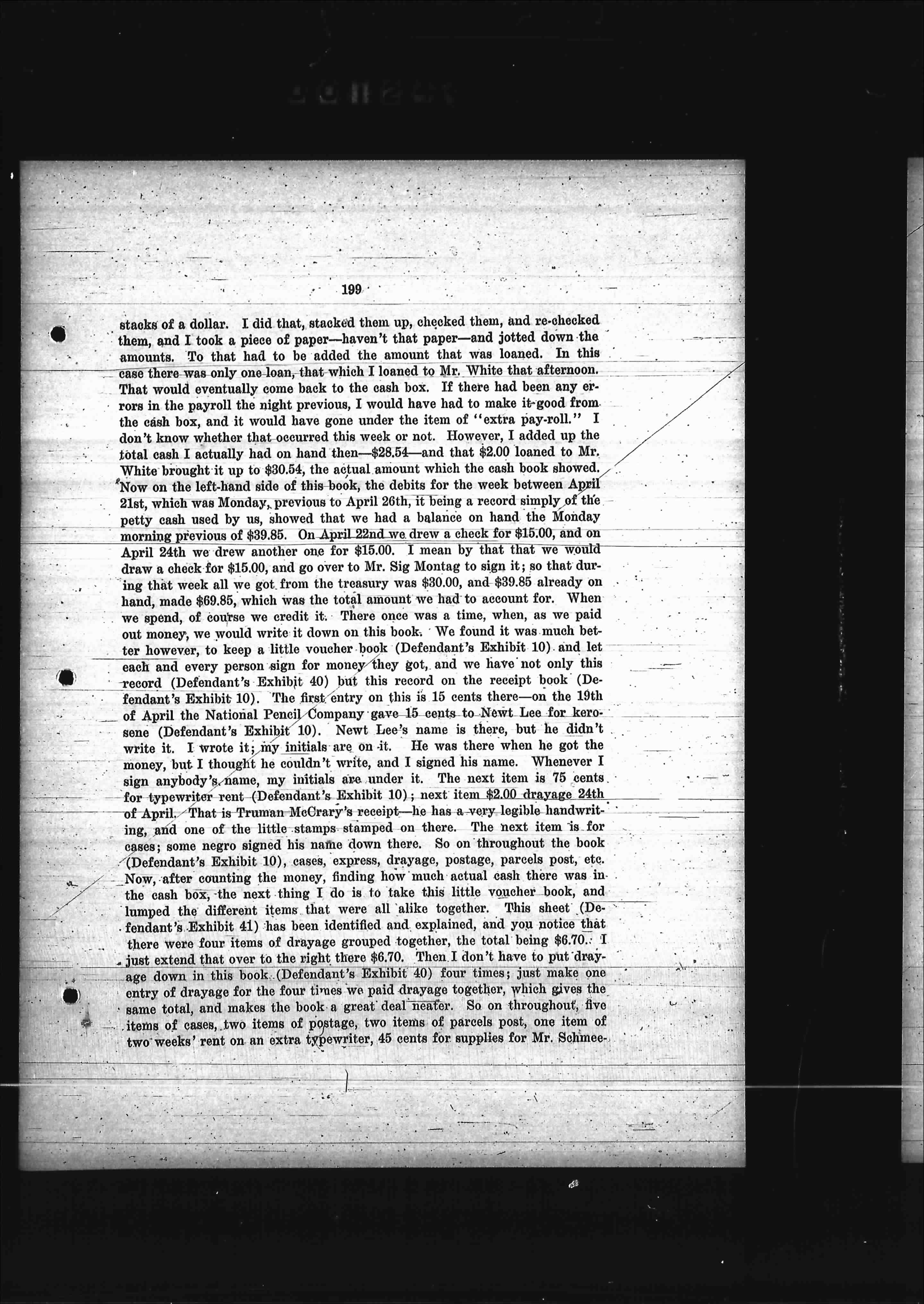 stacks of a dollar. I did that, stacked them up, checked them, and re-checked them, and I took a piece of paper—haven't that paper—and jotted down the amounts. To that had to be added the amount that we had paid. In this case there was only one loan, that which I loaned to Mr. White that afternoon. That would eventually come back to the cash box. If there had been any errors in the payroll the night previous, I would have had to make it good from the cash box, and it would have gone under the item of "extra pay-roll." I don't know whether that occurred this week or not. However, I added up the total cash I actually had on hand then—$28.54—and that $30.00 loaned to Mr. White brought it up to $50.54, the actual amount which the cash book showed. Now on the left-hand side of this book, the debits between April 21st, which was Monday, previous to April 26th, I being a record simply of the petty cash used by us, showed that we had a balance on hand the Monday morning previous of $99.85. On April 22nd we drew a check for $15.00, and on April 24th we drew another one for $15.00. I mean that that we would draw a check for $15.00, and go over to Mr. Sig Montag to sign it; so that during that week all we got from the treasury was $30.00, and $39.85 already on hand, made $69.85, which was the total amount we had to account for. When we spend, of course we credit it. There once was a time, when, as we paid out money, we would write it down on this book. We found it was much better however, to keep a little voucher book (Defendant's Exhibit 10) and let each and every person sign for money they got, and we have not only this record (Defendant's Exhibit 40) but this record on the receipt book (Defendant's Exhibit 10). The first entry on this is 15 cents there—on the 19th of April the National Pencil Company gave 15 cents to Newt Lee for kerosene (Defendant's Exhibit 10). Newt Lee's name is there, but he didn't write it. I wrote it; my initials are on it. He was there when he got the money, but I thought he couldn't write, and I signed his name. Whenever I sign anybody's name, my initials are under it. The next item is 75 cents for typewriter rent (Defendant's Exhibit 10); next item $3.00 drayage 24th of April. That is Truman McCrary's receipt—he has a very fine handwriting, and one of the little stamps stamped on there. The next item is for cases; some negro signed his name down there. So on throughout the book (Defendant's Exhibit 10), cases, express, drayage, postage, parcels post, etc. Now, after counting the money, finding how much actual cash there was in the cash box, the next thing I do is to take this little voucher book, and lump all the different items that were all alike together. This sheet (Defendant's Exhibit 41) has been identified and explained, and you notice that there were four items of drayage grouped together, the total being $6.70. I just extend that over to the right there $6.70. Then I don't have to put drayage down in this book. (Defendant's Exhibit 40) Four times; just make one entry of drayage for the four times we paid drayage together, which gives the same total, and makes the book a great deal neater. Now on throughout, five items of cases, two items of postage, two items of parcels post, one item of two weeks' rent on an extra typewriter, 45 cents for supplies for Mr. Schneer.