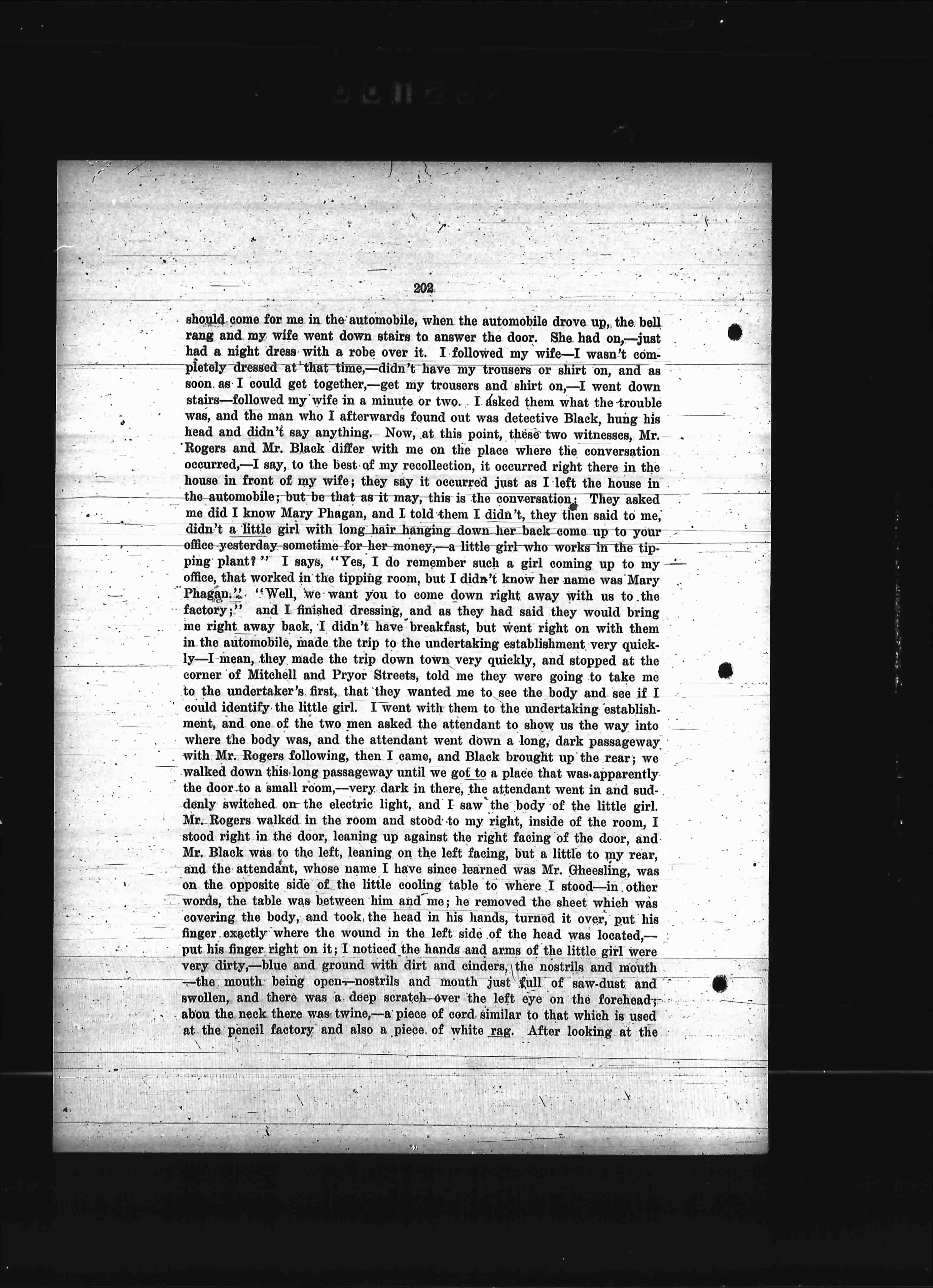 should come for me in the automobile, when the automobile drove up, the bell rang and my wife went down stairs to answer the door. She had on,—just had a night dress with a robe over it. I followed her down. I wife—I wasn't completely dressed at that time,—didn't have my collar or tie on, and as soon as I could get together,—get my trousers and shirt on,—I went down stairs—followed my wife in a minute or two. I asked them what the trouble was, and the man who I afterwards found out was detective Black, hung his head and didn't say anything. Now, at this point, these two witnesses, Mr. Rogers and Mr. Black differ with me on the place where the conversation occurred,—I say, to the best of my recollection, it occurred right there in the house in front of my wife; they say it occurred just as I left the house in the automobile; but be that as it may,—this is the conversation: They asked me did I know Mary Phagan, and I told them I didn't; they then said to me, didn't a little girl with long hair hanging down her-back come up to your office yesterday-sometime for-her money,—a little girl who works in the tipping plant? "I says, "Yes, I do remember such a girl coming up to my office, worked in the tipping room, but I didn't know her name was Mary Phagan." "Well, we want you to come down right away with us to the factory;" and I finished dressing, and as they had said they would bring me right away back, I didn't have breakfast, but went right on with them in the automobile, made the trip to the undertaking establishment very quickly—I mean, they made the trip down town very quickly, and stopped at the corner of Mitchell and Pryor Streets, told me they were going to take me to the undertaker's first, that they wanted me to see the body and see if I could identify the little girl. I went with them to the undertaking establishment, and one of the two men asked the attendant to show us the way into where the body was, and the attendant went down a long, dark passageway with Mr. Rogers following, then I came, and Black brought up the rear; we walked down this long passageway until we got to a place that was-apparently the door to a small room,—very dark in there, the attendant went in and suddenly switched on-the electric light, and I saw the body of the little girl. Mr. Rogers walked in the room and stood to my right, inside of the room, I stood right in the door, leaning up against the right side of the door, and Mr. Black was to the left, leaning on the left frame, right at little to my rear, and the attendant, whose name I have since learned was Mr. Gheesling, was on the opposite side of the little cooling table to where I stood—in other words, the table was between him and me; he removed the sheet which was covering the body, and took the head in his hands, turned it over, put his finger exactly where the wound in the left side of the head was located— put his finger right on it; I noticed the hands and arms of the little girl were very dirty,—blue and ground with dirt and cinders, the nostrils and mouth —the mouth being open—nostrils and mouth just full of saw-dust and swollen, and there was a deep scratch-over the left eye on the forehead; about the neck there was twine,—a piece of cord similar to that which is used at the pencil factory and also a piece of white rag. After looking at the