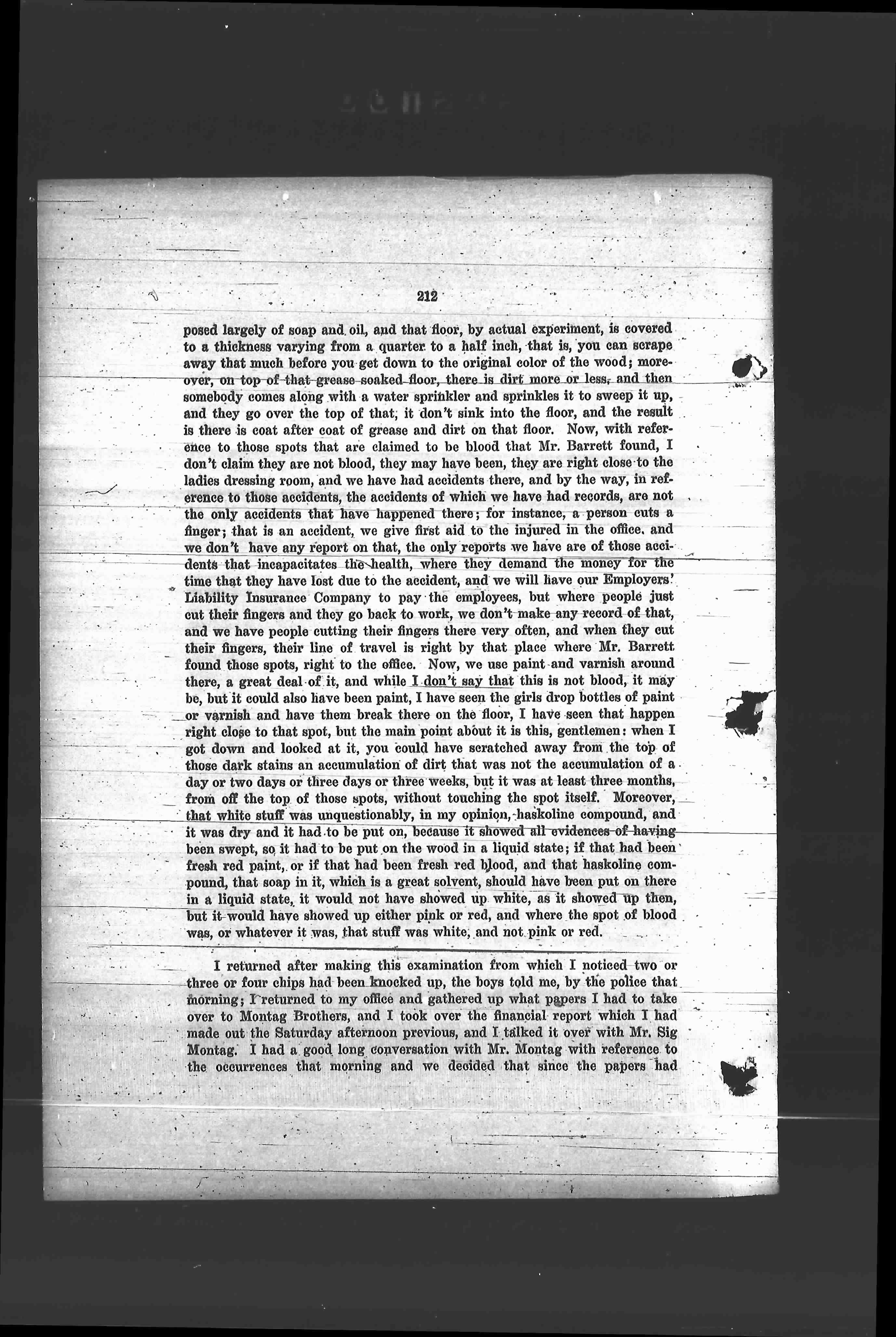 posed largely of soap and oil, and that floor, by actual experiment, is covered to a thickness varying from a quarter to a half inch, that is, you can scrape away that much before you get down to the natural color of the wood; moreover, on top-of-that-grease-soaked-floor-the-dirt more or less-and then somebody comes along with a water sprinkler and sprinkles it to sweep it up, and they go over the top of that; it don't sink into the floor, and the result is there is coat after coat of grease and dirt on that floor. Now, with reference to those spots that are claimed to be blood that Mr. Barrett found, I don't claim they are not blood, they may have been, they are right close-to the ladies dressing room, and we have had accidents there, and by the way, in reference to those accidents, the accidents of which we have had records, are not the only accidents that have happened there; for instance, a person cuts a finger; that is an accident, we give first aid to the injured in the office, and we don't have any report on that, the only reports we have are of those accidents that incapacitates the-health, when they demand the money for the time that they have lost due to the accident, and we will have our Employers' Liability Insurance Company to pay the employees, but where people just cut their fingers and they go back to work, we don't make any record of that, and we have people cutting their fingers there very often, and when they cut their fingers, their line of travel is right by that place where Mr. Barrett found those spots, right to the office. Now, we use paint-and varnish around there, a great deal-of it, and while I don't say that this is not blood, it may be, but it could also have been paint, I have seen the girls drop bottles of paint or varnish and have them break there on the floor, I have seen that happen right close to that spot, but the main point about it is this, gentlemen: when I got down and looked at it, you could have scratched away from the top of those dark stains an accumulation of dirt that was not the accumulation of a day or two days or three days or three weeks, but it was at least three months, from off the top of those spots, without touching the spot itself. Moreover, that white stuff was unquestionably, in my opinion, an alkaline compound, and it was dry and it had-to be put on, because I have lived all-evidences-of-having been swept, so it had-to be put on the wood in a liquid state; if that had been fresh red paint, or if that had been fresh red blood, and that haskolime compound, that soap in it, which is a great solvent, should have been put on there in a liquid state, it would not have showed up white, as it showed up then, but it would have showed up either pink or red, and where the spot or blood was, or whatever it was, that stuff was white, and not pink or red.