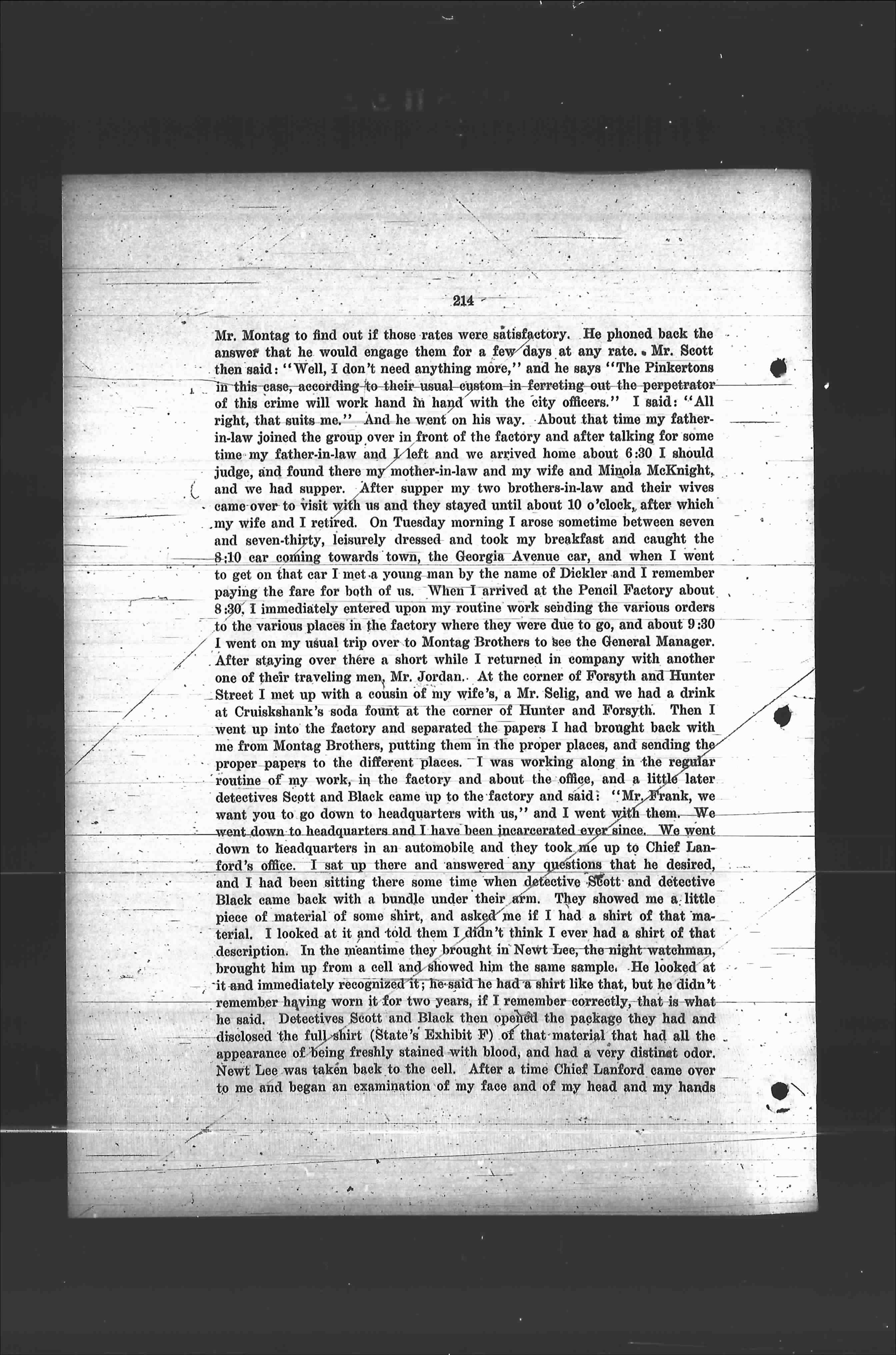 Mr. Montag to find out if those rates were satisfactory. He phoned back the answer that he would engage them for a few days at any rate. Mr. Scott then said: "Well, I don't need anything else and he says "The Pinkertons in this case, according to their usual custom in ferreting out the perpetrator of this crime will work hand in hand with the city officers." I said: "All right, that suits me." And he went on his way. About that time my father-in-law joined the group over in front of the factory and after talking for some time my father-in-law and I left and we arrived home about 6:30 I should judge, and found there my mother-in-law and my wife and Minola McKnight, and we had supper. After supper my two brothers-in-law and their wives came over to visit with us and they stayed until about 10 o'clock, after which my wife and I retired. On Tuesday morning I arose sometime between seven and seven-thirty, leisurely dressed and took my breakfast and caught the 8:10 car coming towards town, the Georgia Avenue car, and when I went to get on that car I met a young man by the name of Dickler and I remember paying the fare for both of us. When I arrived at the Pencil Factory about 8:30, I immediately entered upon my routine work sending the various orders to the various places in the factory where they were due to go, and about 9:30 I went on my usual trip over to Montag Brothers to see the General Manager. After staying over there a short while I returned in company with another one of their traveling men, Mr. Jordan. At the corner of Forsyth and Hunter Street I met up with a cousin of my wife's, a Mr. Selig, and we had a drink at Cruikshank's soda fount at the corner of Hunter and Forsyth. Then I went up into the factory and separated the papers I had brought back with me from Montag Brothers, putting them in the proper places, and sending the proper papers to the different places. I was working along in the regular routine of my work, in the factory and about the office, and a little later detectives Scott and Black came up to the office and said: "Mr. Frank, we want you to go down to headquarters with us," and I went with them. We went down to headquarters and I have been there ever since. We went down to headquarters in an automobile and they took me up to Chief Lanford's office. I sat up there and answered any questions that he desired, and I had been sitting there some time when detective Scott and detective Black came back with a bundle under their arm. They showed me a little piece of material of some shirt, and asked me if I had a shirt of that material. I looked at it and told them I didn't think I ever had a shirt of that description. In the meantime they brought in Newt Lee, the night watchman, brought him up from a cell and showed him the same sample. He looked at it and immediately recognized it; he said he had a shirt like that, but he didn't remember having worn it for two years. If I remember correctly, that is what he said. Detectives Scott and Black then opened the package they had and disclosed the full shirt (State's Exhibit B) of that material that had all the appearance of being freshly stained with blood, and had a very distinct odor. Newt Lee was taken back to the cell. After a time Chief Lanford came over to me and began an examination of my face and of my head and my hands