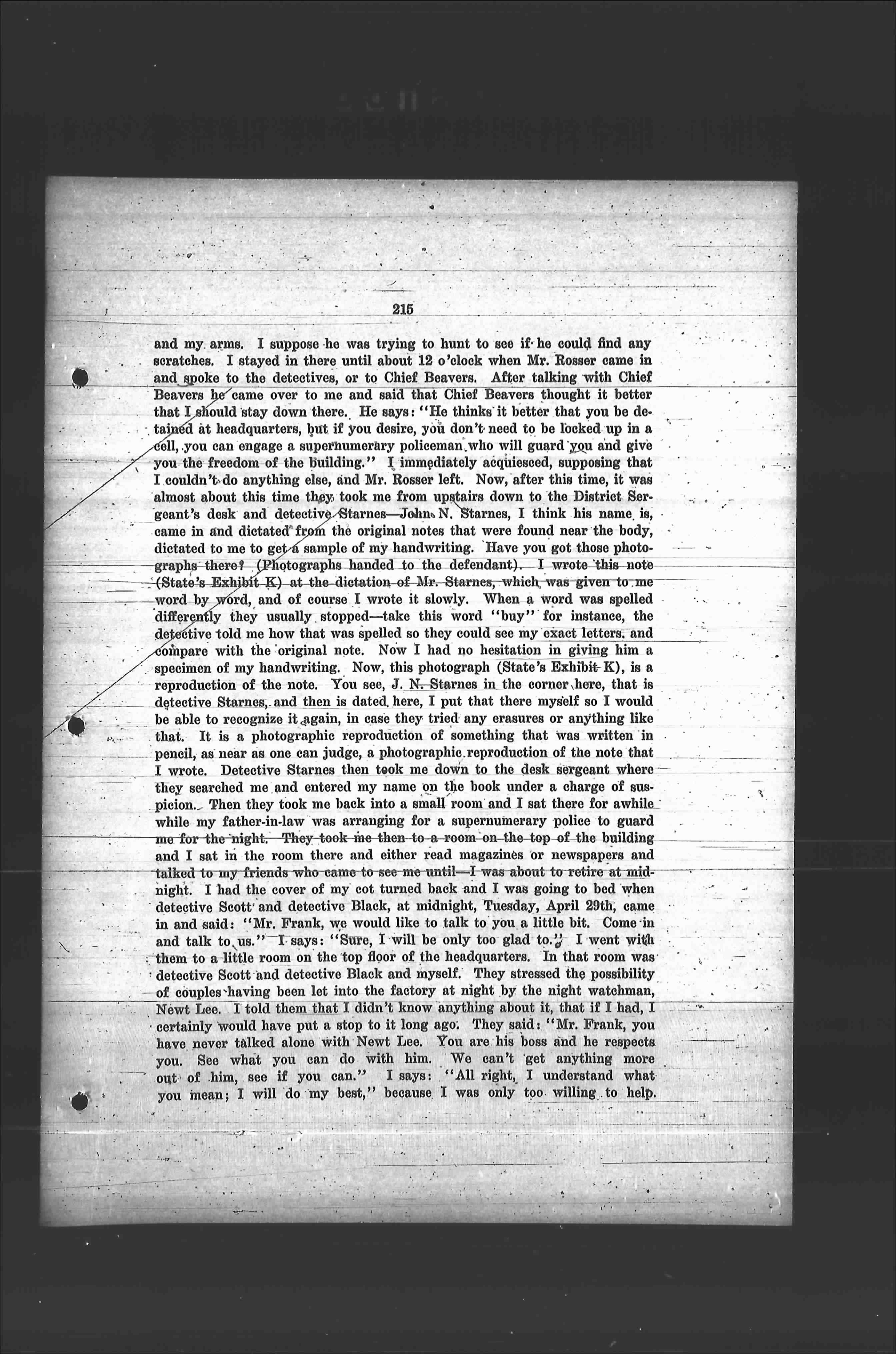 and my arms. I suppose he was trying to hunt when he could find any scratches. I stayed in there until about 12 o'clock when Mr. Rosser came in and spoke to the detectives, or to Chief Beavers. He was talking with Chief Beavers he came over to me and said that Chief Beavers thought it better that I should stay down there. He says: "He thinks it better that you be detained at headquarters, but if you desire, you don't need to be locked up in a cell, you can engage a supernumerary policeman who will guard you and give you the freedom of the building." I immediately acquiesced, supposing that I couldn't do anything else, and Mr. Rosser left. Now, after this time, it was almost about this time they took me from upstairs down to the District Sergeant's desk and detective Starnes-John W. Starnes, I think his name is, came in and dictated from the original notes that were found near the body, dictated to me to get a sample of my handwriting. Have you got those photographs there? (Photographs handed to the defendant.) I wrote this note (State's Exhibit K.) at the dictation of Mr. Starnes, which was given to me word by word, and of course I wrote it slowly. When a word was spelled differently they usually stopped-take this word "buy," for instance, the detective told me how that was spelled so they could see my exact letters, and compare with the original note. Now I had no hesitation in giving him a specimen of my handwriting. Now, this photograph (State's Exhibit K.), is a reproduction of the note. You see, J. N. Starnes in the corner here, that is detective Starnes, and then is dated here. I put that there myself so I would be able to recognize it again, in case they tried any erasures or anything like that. It is a photographic reproduction of something that was written in pencil, as near as one can judge, a photographic reproduction of the note that I wrote. Detective Starnes then took me down to the desk sergeant where they searched me and entered my name on the book under a charge of suspicion. Then they took me back into a small room and left there for awhile while my father-in-law was arranging for a supernumerary police to guard me for the night. They took me then to a room on the top of the building and I sat in the room there and either read magazines or newspapers and talked to my friends who came to see me until-I was about to retire at midnight. I had the cover of my cot turned back and I was going to bed when detective Scott and detective Black, at midnight, Tuesday, April 29th, came in and said: "Mr. Frank, we would like to talk to you a little bit. Come in and talk to us." I says: "Sure, I will be only too glad to." I went with them to a little room on the top floor of the headquarters. In that room was detective Scott and detective Black and myself. They stressed the possibility of couples having been let into the factory at night by the night watchman, Newt Lee. I told them that I didn't know anything about it, that if I had, I certainly would have put a stop to it long ago. They said: "Mr. Frank, you have never talked alone with Newt Lee. You are his boss and he respects you. See what you can do with him. We can't get anything more out of him, see if you can." I says: "All right, I understand what you mean; I will do my best," because I was only too willing to help.