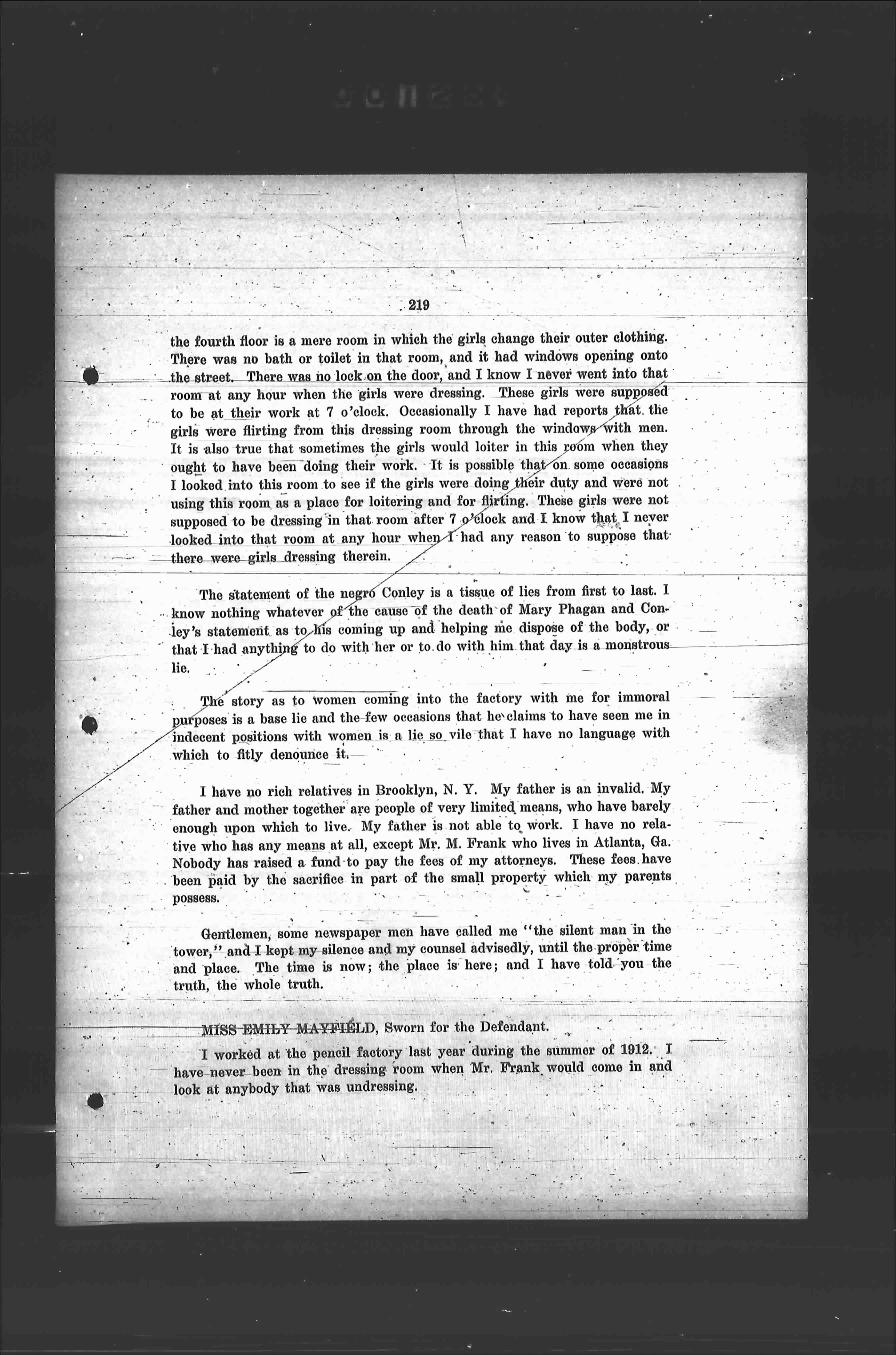 The statement of the negro Conley is a tissue of lies from first to last. I know nothing whatever of the cause of the death of Mary Phagan and Conley's statement as to his coming up and helping me dispose of the body, or that I had anything to do with her or to do with him that day is a monstrous lie.