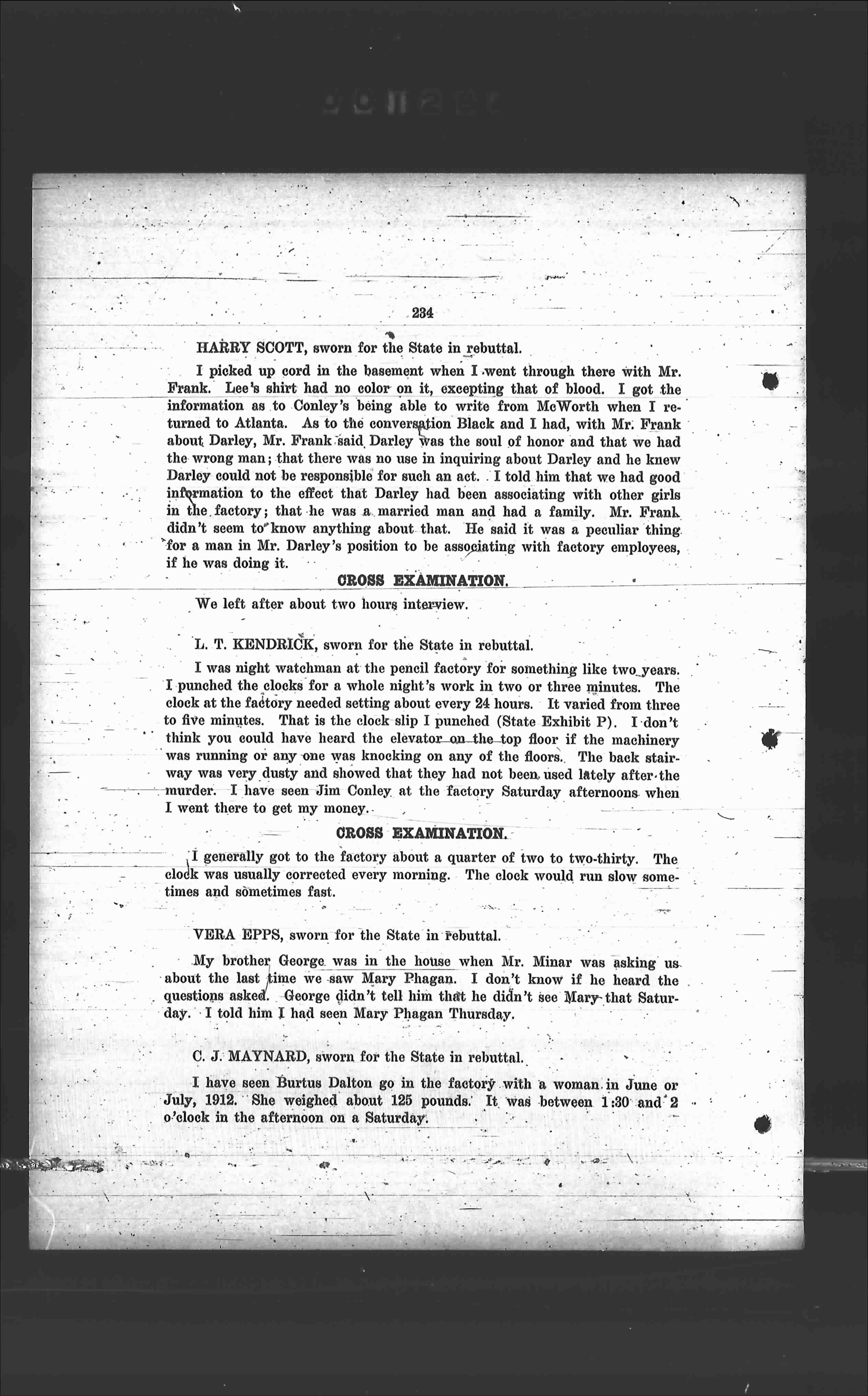 I was night watchman at the pencil factory for something like two years. I punched the clocks for a whole night's work in two or three minutes. The clock at the factory needed setting about every 24 hours. It varied from three to five minutes. That is the clock slip I punched (State Exhibit P.). I don't think you could have heard the elevator on-the top floor if the machinery was running or any one was knocking on any of the floors. The back stairway was very dusty and showed that they had not been used lately after-the murder. I have seen Jim Conley at the factory Saturday afternoons when I went there to get my money.