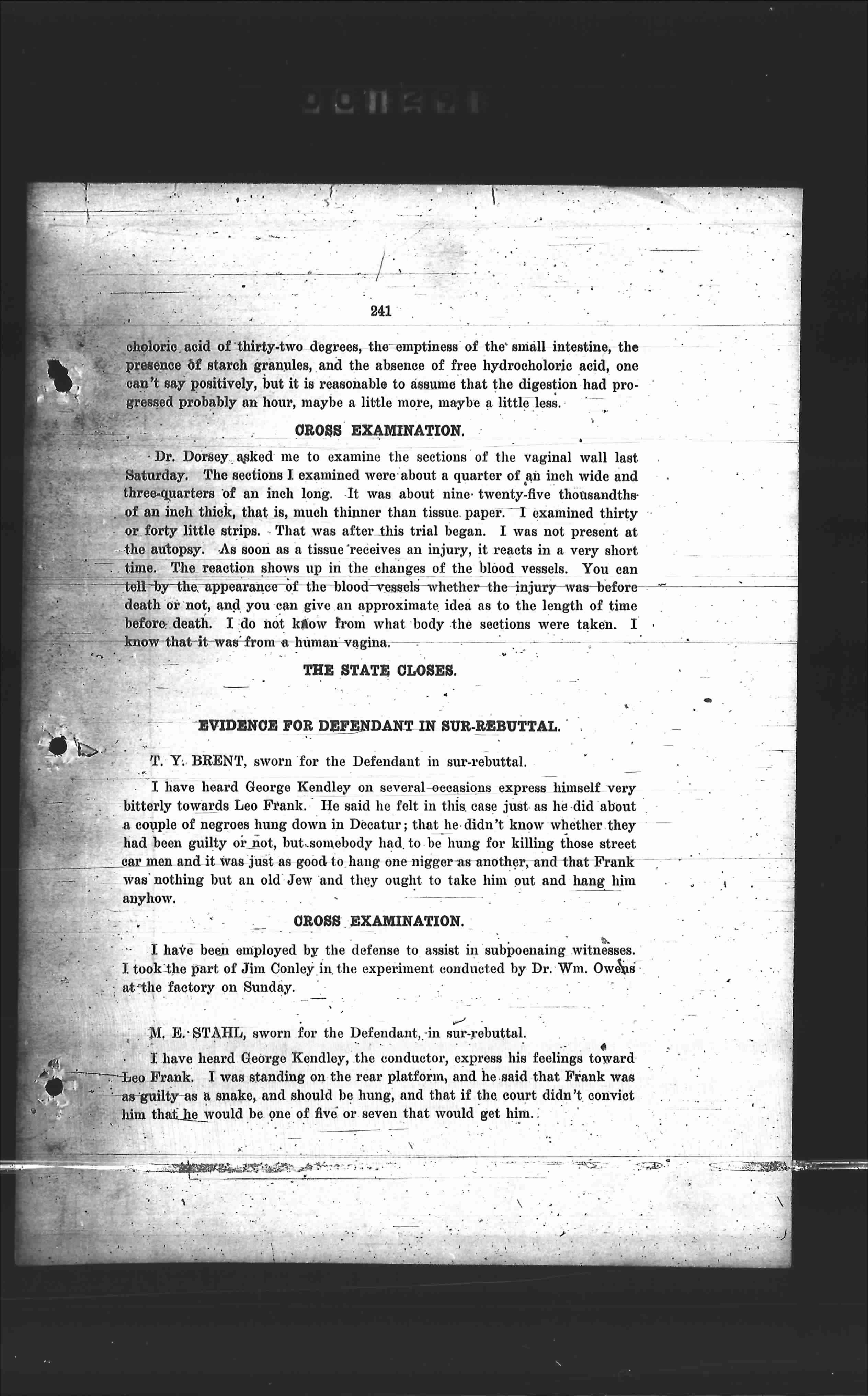 I have heard George Kendley on several occasions express himself very bitterly towards Leo Frank. He said he felt in this case just as he did about a couple of negroes hung down in Decatur; that he didn't know whether they had been guilty or not, but somebody had to be hung for killing those street car men and it was just as good to hang one nigger as another, and that Frank was nothing but an old Jew and they ought to take him out and hang him anyhow.