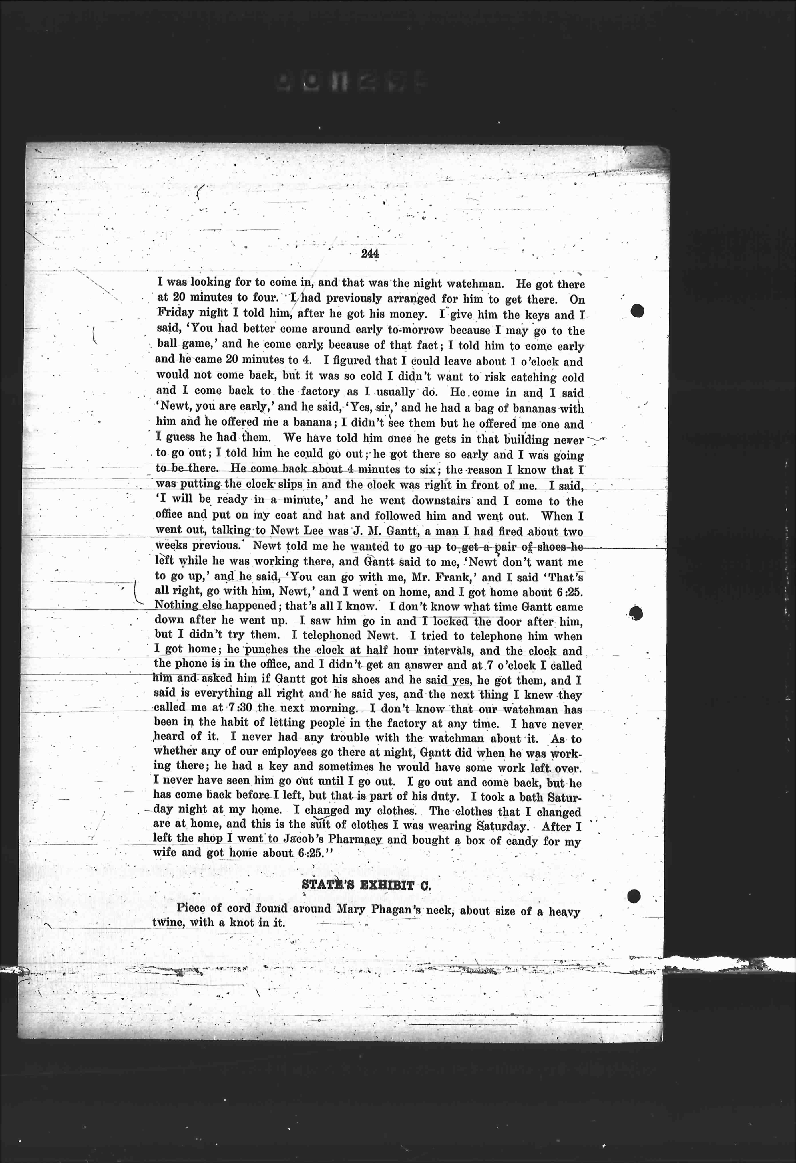 I was looking for to come in, and that was the night watchman. He got there at 20 minutes to four. I had previously arranged with him to get there. On Friday night I told him, after he got his money, to give him the keys and I said, 'You had better come around early to-morrow because I may go to the ball game,' and he came early because of that fact; I told him to come early and he came 20 minutes to 4. I figured that I could leave about 1 o'clock and would not come back, but it was so cold I didn't want to risk catching cold and I come back to the factory as I usually do. He come in and I said 'Newt, you are early,' and he said, 'Yes, sir,' and he had a bag of bananas with him and he offered me a banana; I didn't see them but he offered me one and I guess he had them. We have told him once he gets in that building never to go out; I told him he could go out; he got there so early and I was going to be there. He come back about 4 minutes to six; the reason I know that I was putting the clock slips in and the clock was right in front of me. I said, 'I will be ready in a minute,' and he went downstairs and I come to the office and put on my coat and hat and followed him and went out. When I went out, talking to Newt Lee was J. M. Gantt, a man I had fired about two weeks previous. Newt told me he wanted to go up to get-a-pair of shoes he left while he was working there, and Gantt said to me, 'Newt don't want me to go up,' and he said, 'You can go with me, Mr. Frank,' and I said 'That's all right, go with him, Newt,' and I went on home, and I got home about 6:25. Nothing else happened; that's all I know. I don't know what time Gantt came down after he went up. I saw him go in and I locked the door after him, but I didn't try them. I telephoned Newt. I tried to telephone him when I got home; he punches the clock at half hour intervals, and the clock and the phone is in the office, and I didn't get an answer and at 7 o'clock I called him and asked him if Gantt got his shoes and he said yes, he got them, and I said is everything all right and he said yes, and the next thing I knew they called me at 7:30 the next morning. I don't know that our watchman has been in the habit of letting people in the factory any time. I have never heard of it. I never had any trouble with the watchman about it. As to whether any of our employees go there at night, Gantt did, when he was working there; he had a key and sometimes he would have some work left over. I never have seen him go out until I go out. I go out and come back, but he has come back before I left, but that is part of his duty. I took a bath Saturday night at my home. I changed my clothes. The clothes that I changed are at home, and this is the suit of clothes I was wearing Saturday. After I left the shop I went to Jacob's Pharmacy and bought a box of candy for my wife and got home about 6:25."