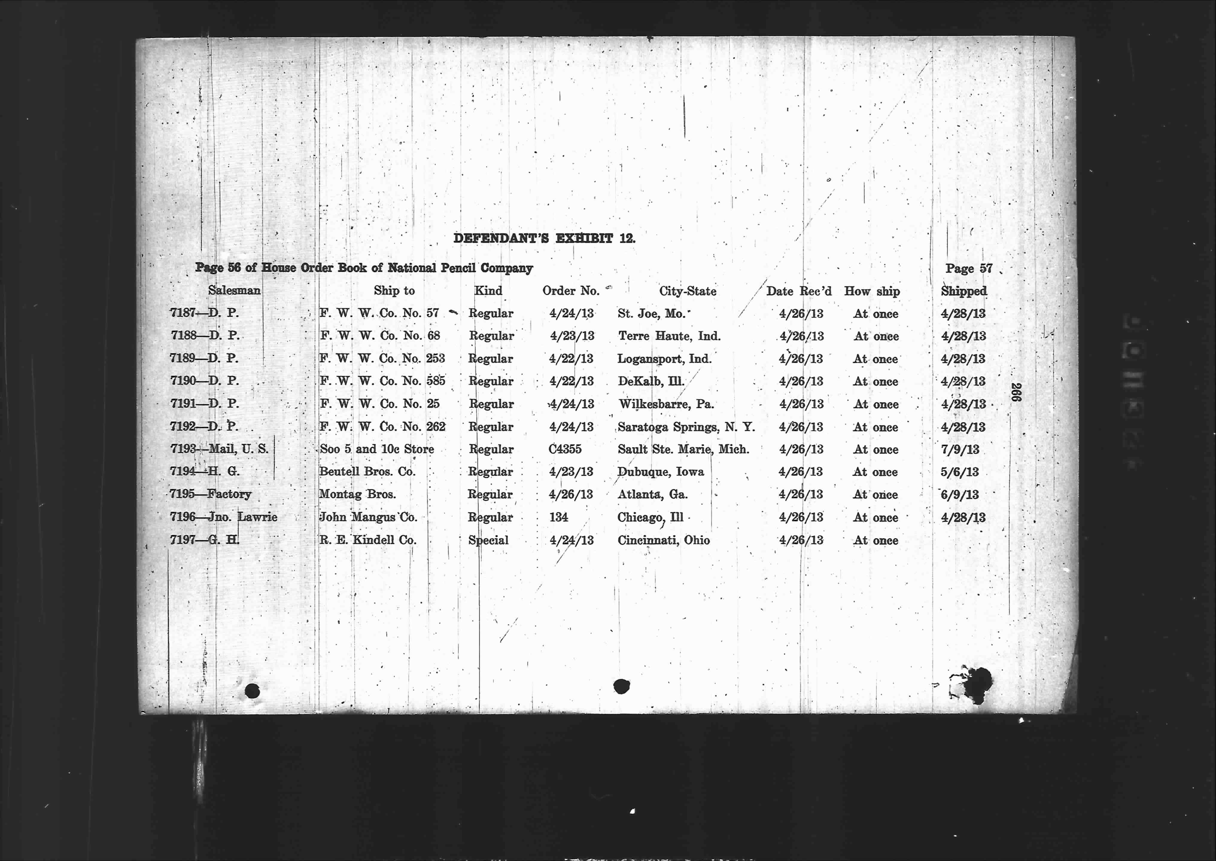 7187—D. P. F. W. W. Co. No. 57 Regular 4/24/13 St. Joe, Mo. 4/26/13 At once 4/28/13