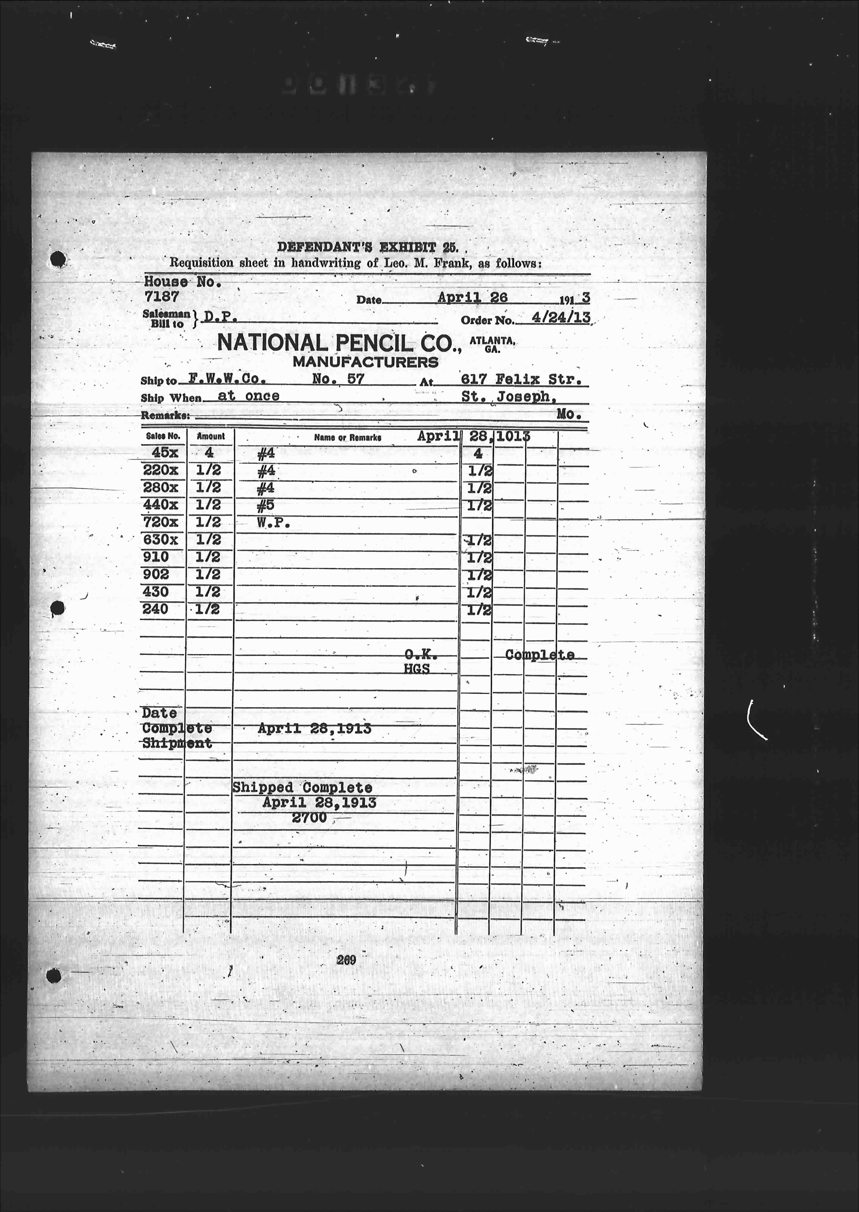 Requisition sheet in handwriting of Leo. M. Frank, as follows: