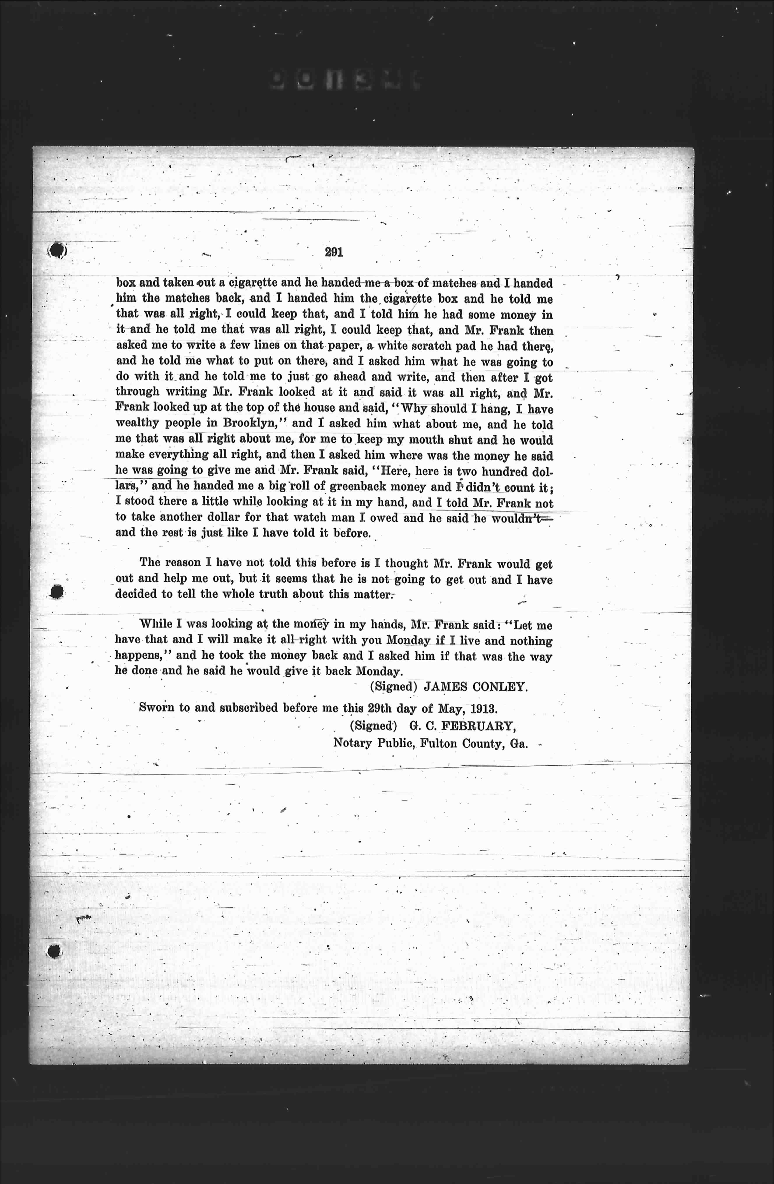 box and taken out a cigarette and he handed me a box of matches and I handed him the matches back, and I handed him the cigarette, and he told me that was all right, I could keep that, and I told him I had some money in it and he told me that was all right, I could keep that, and Mr. Frank then asked me to write a few lines on that paper, a white scratch pad he had there, and he told me what to put on there, and I asked him what he was going to do with it and he told me to just go ahead and write, and then after I got through writing Mr. Frank looked at it and said it was all right, and Mr. Frank looked up at the top of the house and said, "Why should I hang, I have wealthy people in Brooklyn," and I asked him what about me, and he told me that was all right about me, for me to keep my mouth shut and he would make everything all right, and then I asked him where was the money he said he was going to give me and Mr. Frank said, "Here there is two hundred dollars," and he handed me a big roll of greenback money and I didn't count it; I stood there a little while looking at it in my hand, and I told Mr. Frank not to take another dollar for that watch man I owed and he said he wouldn't— and the rest is just like I have told it before.