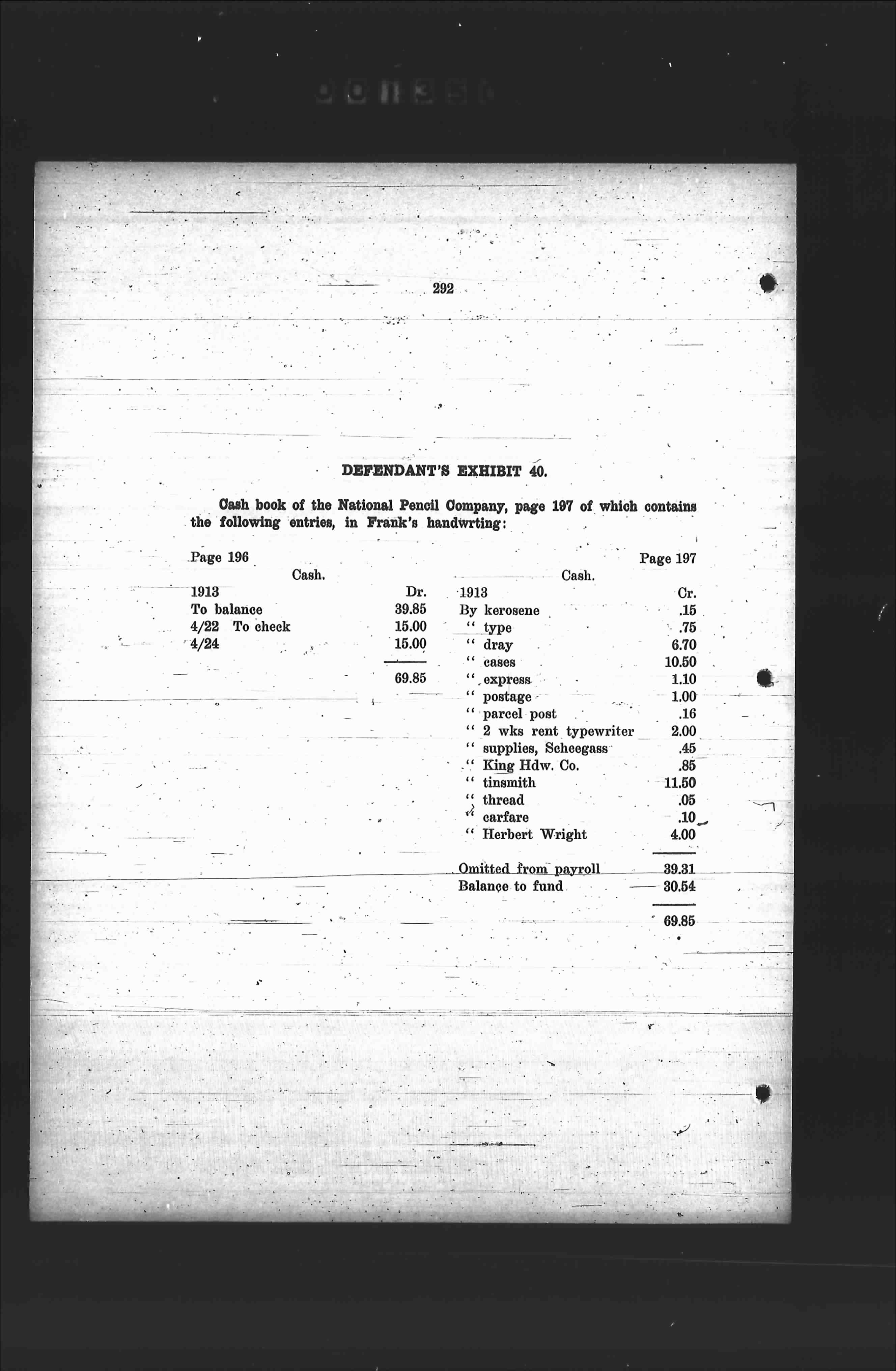 Cash book of the National Pencil Company, page 197 of which contains the following entries, in Frank's handwriting: