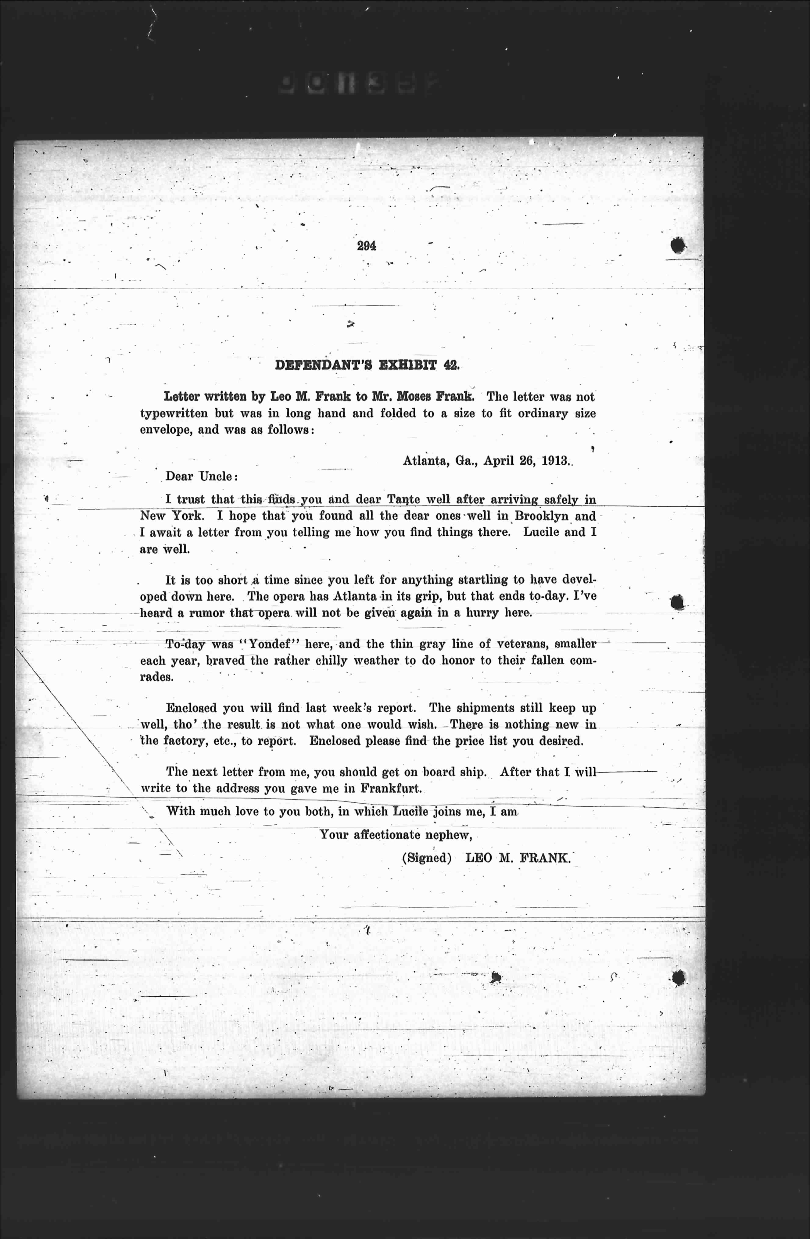 Letter written by Leo M. Frank to Mr. Moas Frank. The letter was not typewritten but was in long hand and folded to a size to fit ordinary size envelope, and was as follows: