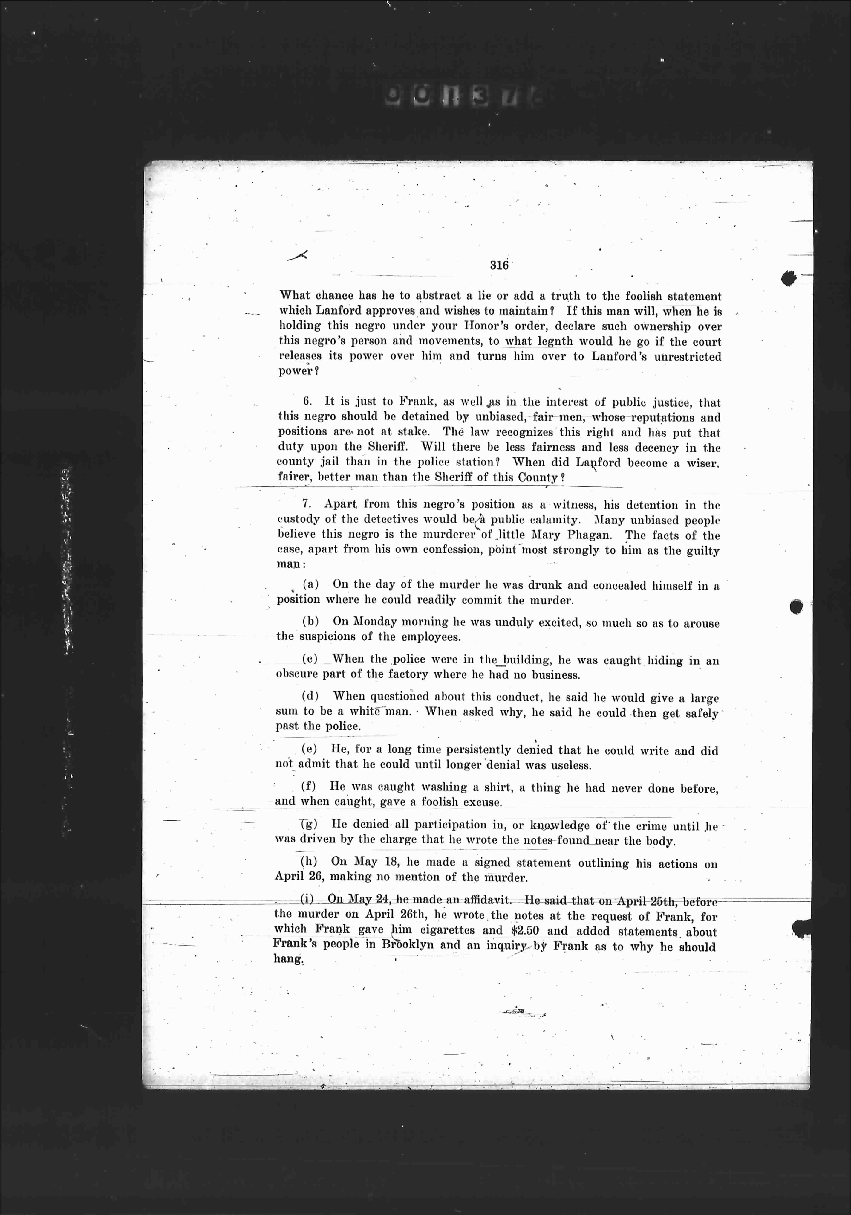 6. It is just to Frank, as well as in the interest of public justice, that this negro should be detained by unbiased, fair men, whose reputations and positions are not at stake. The law recognizes this right and has put that duty upon the Sheriff. Will there be less fairness and less decency in the county jail than in the police station? When did Lanford become a wiser, fairer, better man than the Sheriff of this County?