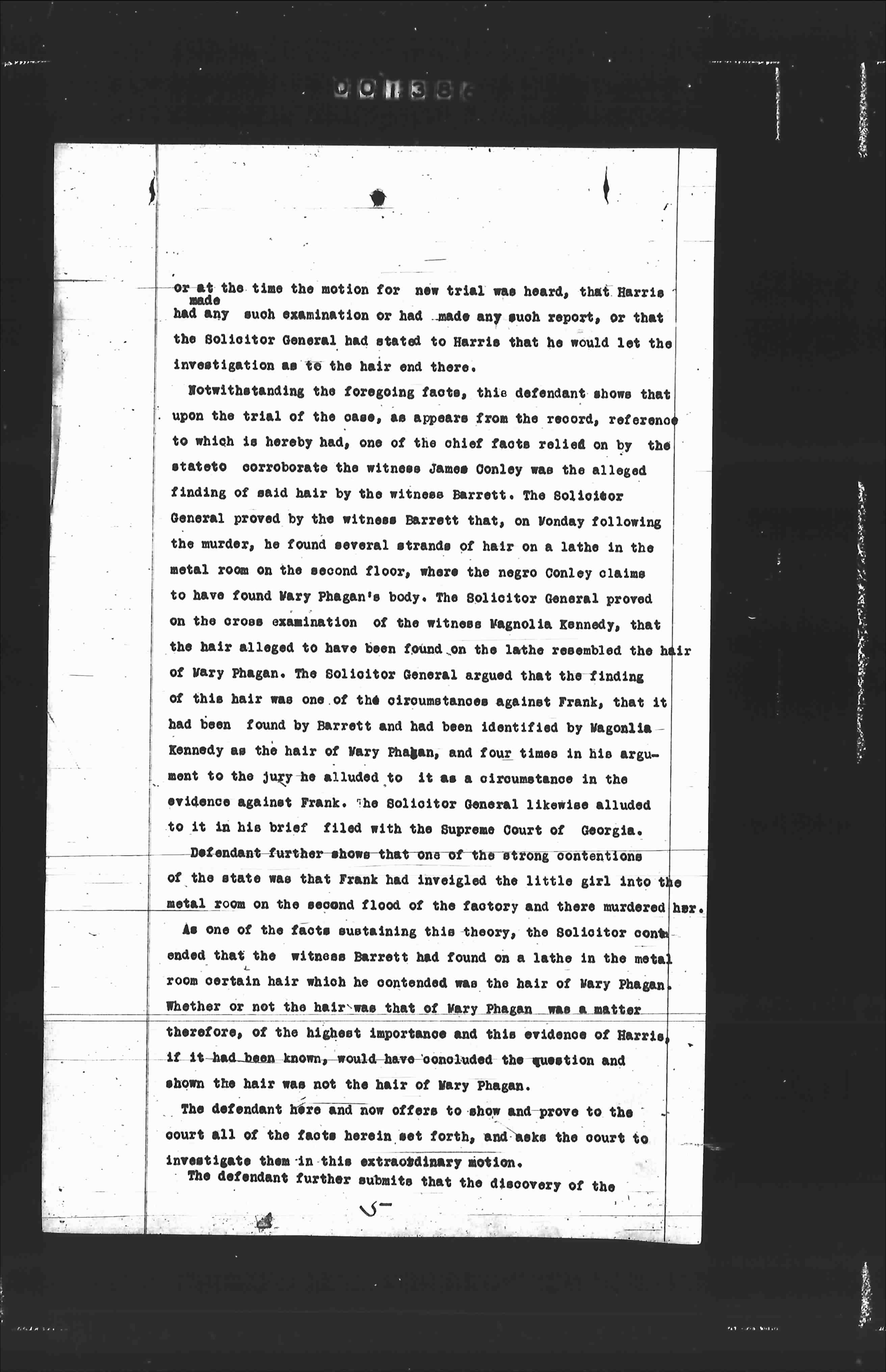 Notwithstanding the foregoing facts, this defendant shows that upon the trial of the case, as appears from the record, reference to which is hereby had, one of the chief facts relied on by the state to corroborate the witness James Conley was the alleged finding of said hair by the witness Barrett. The Solioitor General proved by the witness Barrett, that, on Monday following the murder, he found several strands of hair on a lathe in the metal room on the second floor, where the negro Conley claims to have found Mary Phagan's body. The Solioitor General proved on the cross examination of the witness Magnolia Kennedy, that the hair alleged to have been found on the lathe resembled the hair of Mary Phagan. The Solioitor General argued that the finding of this hair was one of the circumstances against Frank, that it had been found by Barrett and had been identified by Magnolia Kennedy as the hair of Mary Phagan, and four times in his argument to the jury he alluded to it as a circumstance in the evidence against Frank. The Solioitor General likewise alluded to it in his brief filed with the Supreme Court of Georgia.