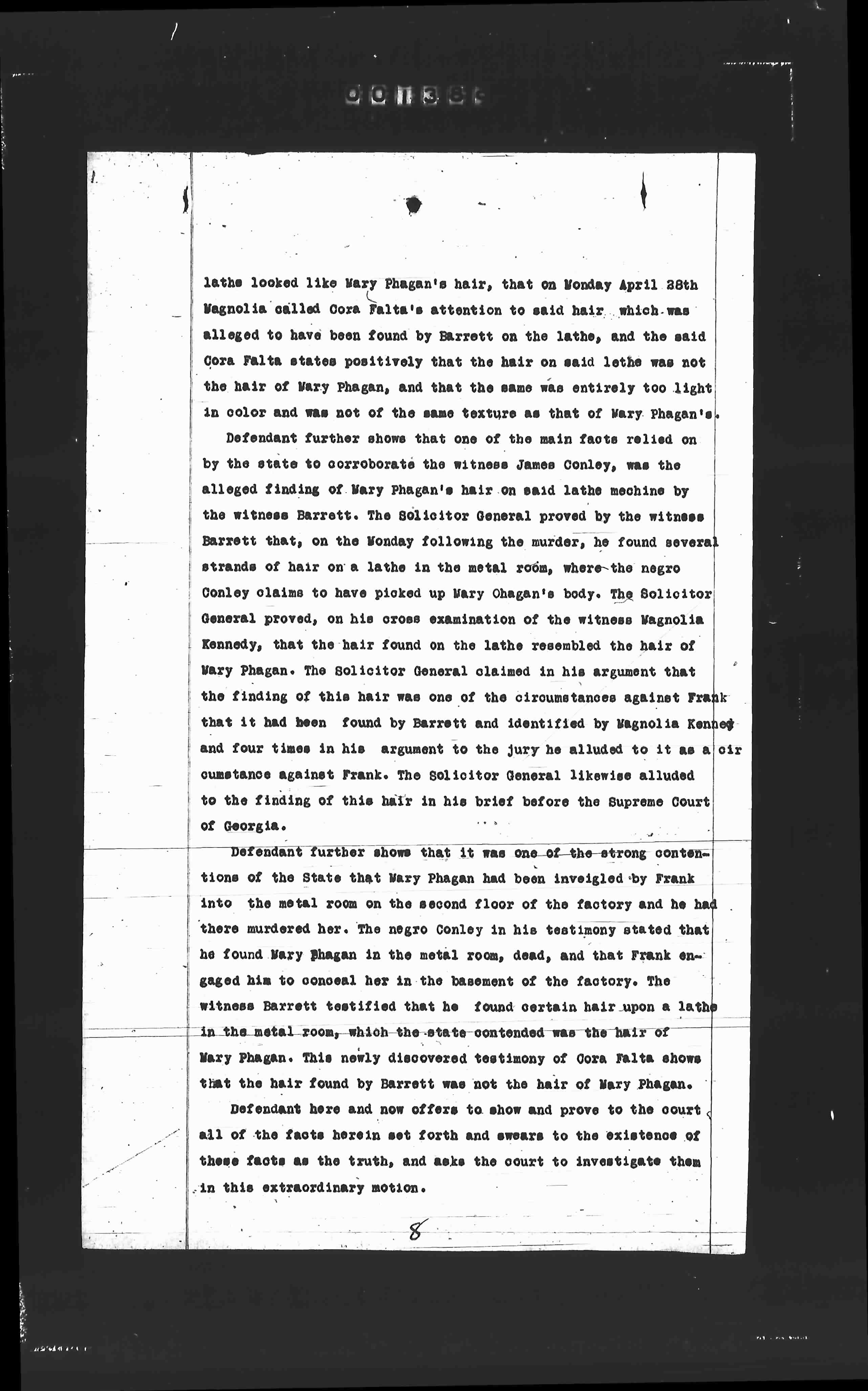 Defendant further shows that one of the main facts relied on by the state to corroborate the witness James Conley, was the alleged finding of Mary Phagan's hair on said lathe machine by the witness Barrett. The Solicitor General proved by the witness Barrett that, on the Monday following the murder, he found several strands of hair on a lathe in the metal room, where the negro Conley claims to have picked up Mary Phagan's body. The Solicitor General proved, on his cross examination of the witness Magnolia Kennedy, that the hair found on the lathe resembled the hair of Mary Phagan. The Solicitor General claimed in his argument that the finding of this hair was one of the circumstances against Frank that it had been found by Barrett and identified by Magnolia Kennedy, and four times in his argument to the jury he alluded to it as a circumstance against Frank. The Solicitor General likewise alluded to the finding of this hair in his brief before the Supreme Court of Georgia.