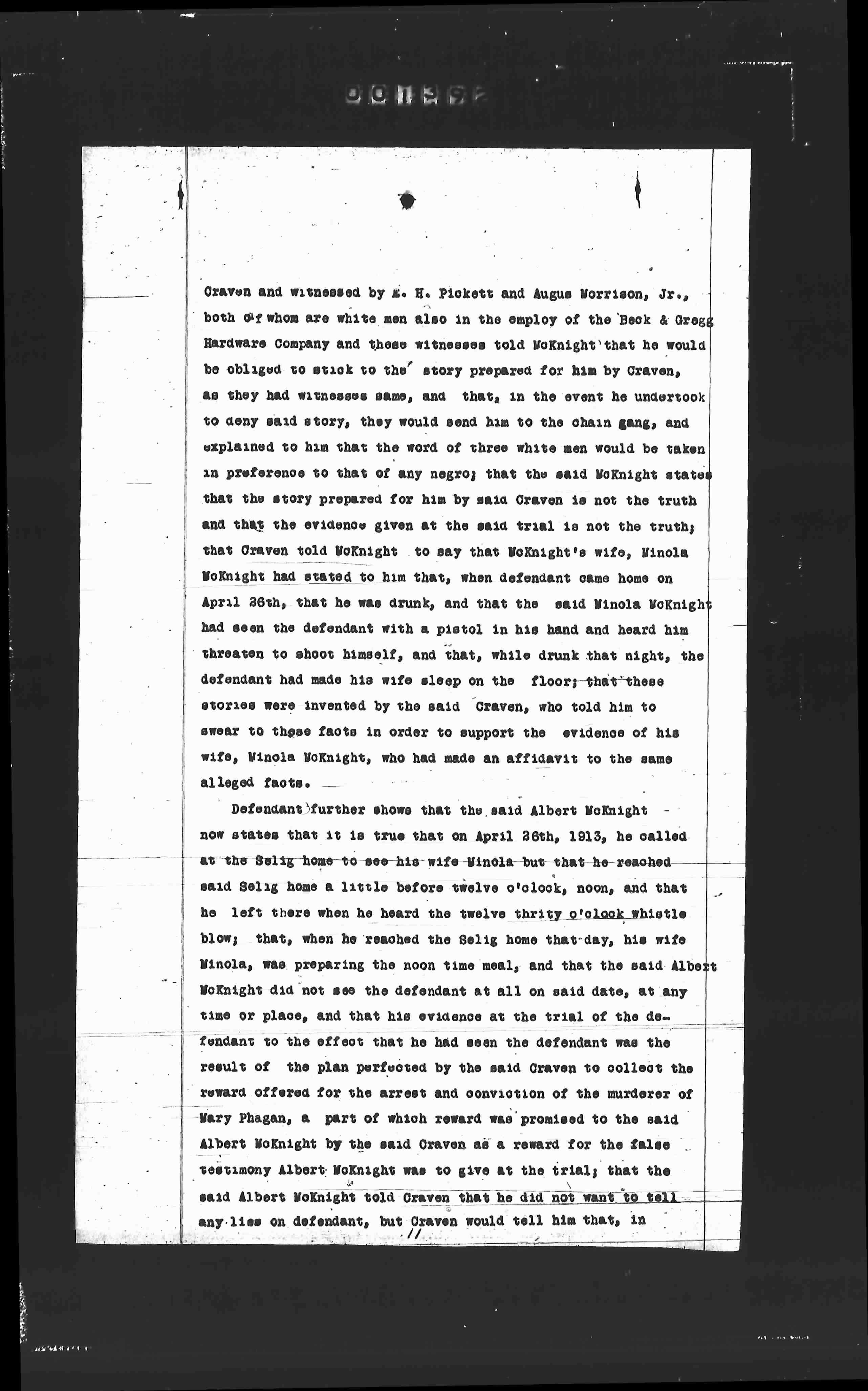 Craven and witnessed by E. H. Pickett and Angus Morrison, Jr., both of whom are white men also in the employ of the Beck & Gregg Hardware Company and these witnesses told McKnight that he would be obliged to stick to the story prepared for him by Craven, as they had witness same, and that, in the event he undertook to deny said story, they would send him to the chain gang, and explained to him that the word of three white men would be taken in preference to that of any negro; that the said McKnight states that the story prepared for him by said Craven is not the truth and that the evidence given at said trial is not the truth; that Craven told McKnight to say that McKnight's wife, Minola McKnight had stated to him that, when defendant came home April 26th, that he was drunk, and that the said Minola McKnight had seen the defendant with a pistol in his hand and heard him threaten to shoot himself, and that, while drunk that night, the defendant had made his wife sleep on the floor; that these stories were invented by the said Craven, who told him to swear to these facts in order to support the evidence of his wife, Minola McKnight, who had made an affidavit to the same alleged facts.