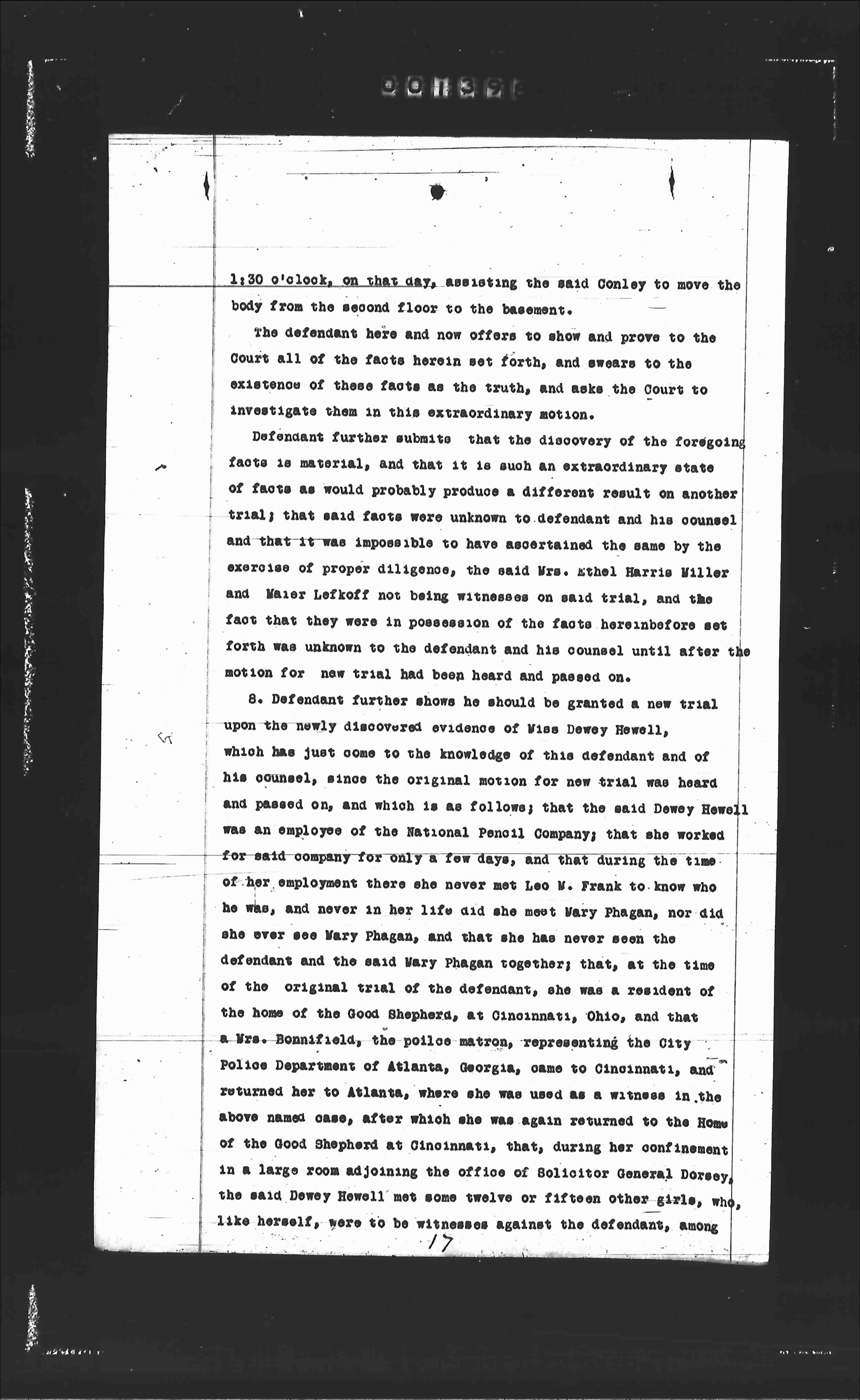 8. Defendant further shows he should be granted a new trial upon the newly discovered evidence of Miss Dewey Howell, which has just come to the knowledge of this defendant and of his counsel, since the original motion for new trial was heard and passed on, and which is as follows: that the said Dewey Howell was an employee of the National Pencil Company; that she worked for said company for only a few days; and that during the time of her employment there she never met Leo M. Frank to know who he was, and never in her life did she meet Mary Phagan, nor did she ever see Mary Phagan, and that she has never seen the defendant and the said Mary Phagan together; that, at the time of the original trial of the defendant, she was a resident of the home of the Good Shepherds, at Cincinnati, Ohio, and that a Mrs. Bonnifield, the police matron, representing the City Police Department of Atlanta, Georgia, came to Cincinnati, and returned her to Atlanta, where she was used as a witness in the above named case, after which she was again returned to the Home of the Good Shepherd at Cincinnati; that, during her confinement in a large room adjoining the office of Solicitor General Dorsey, the said Dewey Howell met some twelve or fifteen other girls, who, like herself, were to be witnesses against the defendant, among