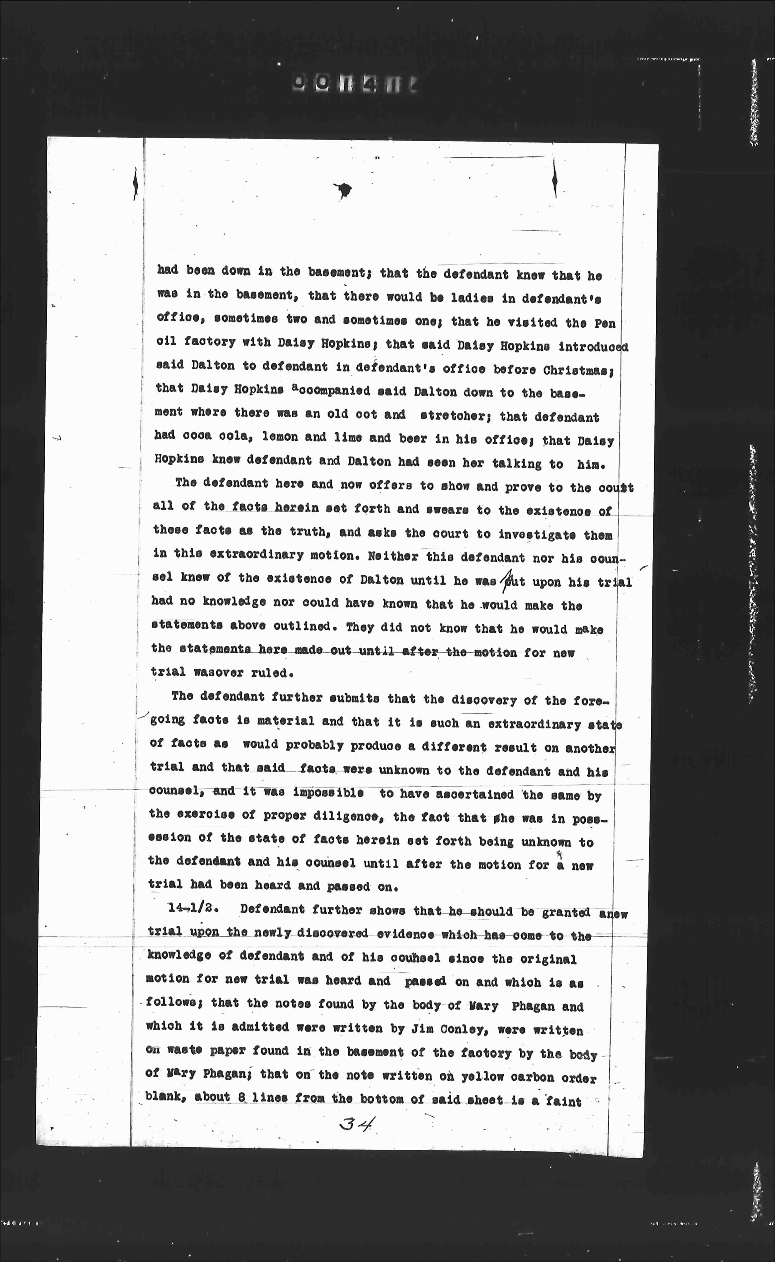 14-1/2. Defendant further shows that he should be granted a new trial upon the newly discovered evidence which has come to the knowledge of defendant and of his counsel since the original motion for new trial was heard and passed on and which is as follows: that the notes found by the body of Mary Phagan and which it is admitted were written by Jim Conley, were written on waste paper found in the basement of the factory by the body of Mary Phagan; that on the note written on yellow carbon order blank, about 8 lines from the bottom of said sheet is a faint
