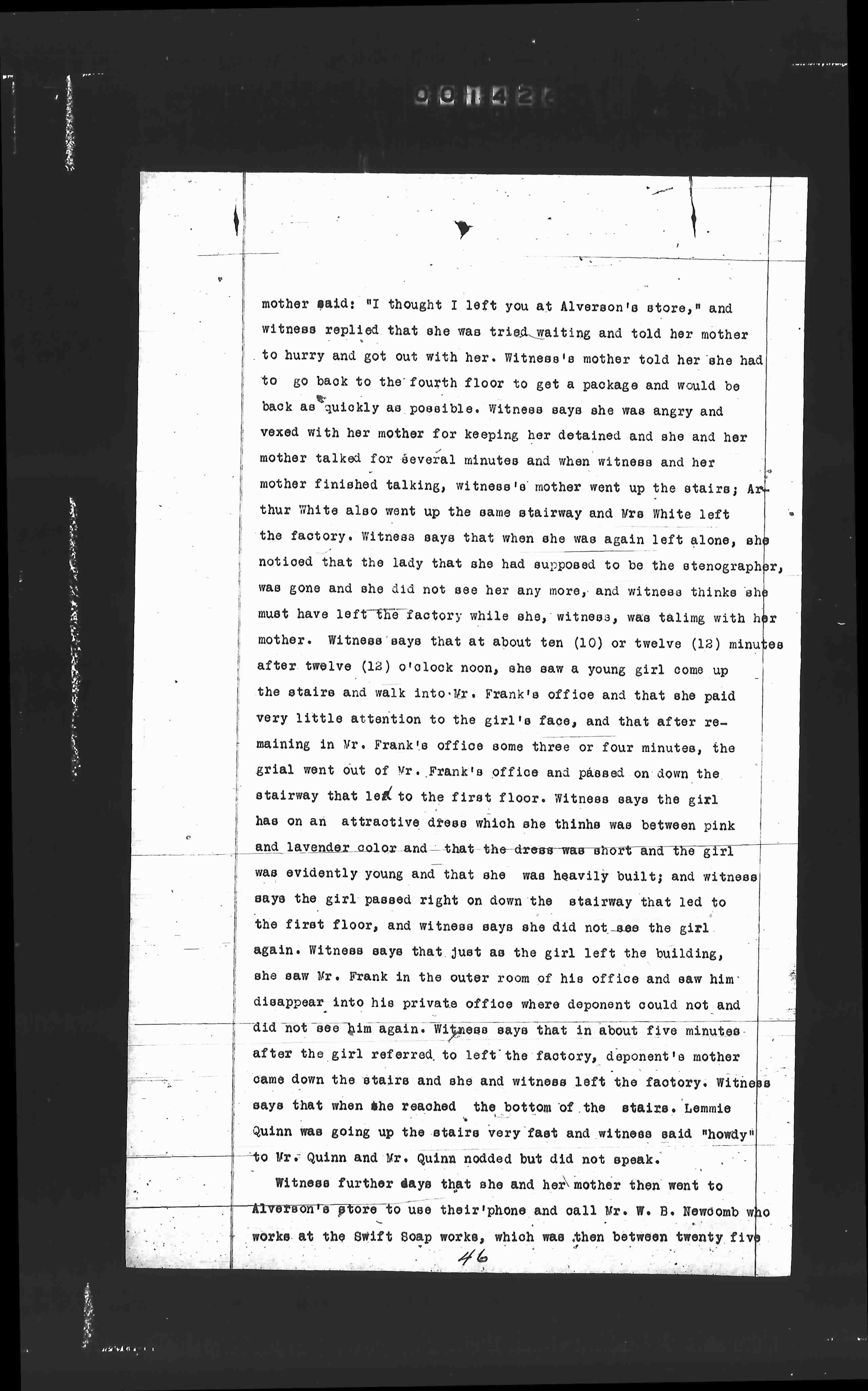 mother said: "I thought I left you at Alverson's store," and witness replied that she was tired waiting and told her mother to hurry and got out with her. Witness's mother told her she had to go back to the fourth floor to get a package and would be back as quickly as possible. Witness says she was angry and vexed with her mother for keeping her detained and she and her mother talked for several minutes and when witness and her mother finished talking, witness's mother went up the stairs; Arthur White also went up the same stairway and Mrs White left the factory. Witness says that when she was again left alone, she noticed that the lady that she had supposed to be the stenographer, was gone and she did not see her any more, and witness thinks she must have left the factory while she, witness, was talking with her mother. Witness says that at about ten (10) or twelve (12) minutes after twelve (12) o'clock noon, she saw a young girl come up the stairs and walk into Mr. Frank's office and that she paid very little attention to the girl's face, and that after remaining in Mr. Frank's office some three or four minutes, the girl went out of Mr. Frank's office and passed on down the stairway that led to the first floor. Witness says the girl has on an attractive dress and that the dress was short and the girl was evidently young and that she was heavily built; and witness says the girl passed right on down the stairway that led to the first floor, and witness says she did not see the girl again. Witness says that just as the girl left the building, she saw Mr. Frank in the outer room of his office and saw him disappear into his private office where deponent could not and did not see him again. Witness says that in about five minutes after the girl referred to left the factory, deponent's mother came down the stairs and she and witness left the factory. Witness says that when she reached the bottom of the stairs, Lemmie Quinn was going up the stairs very fast and witness said "howdy" to Mr. Quinn and Mr. Quinn nodded but did not speak. Witness further says that she and her mother then went to Alverson's store to use their phone and call Mr. W. B. Newcomb who works at the Swift Soap works, which was then between twenty five