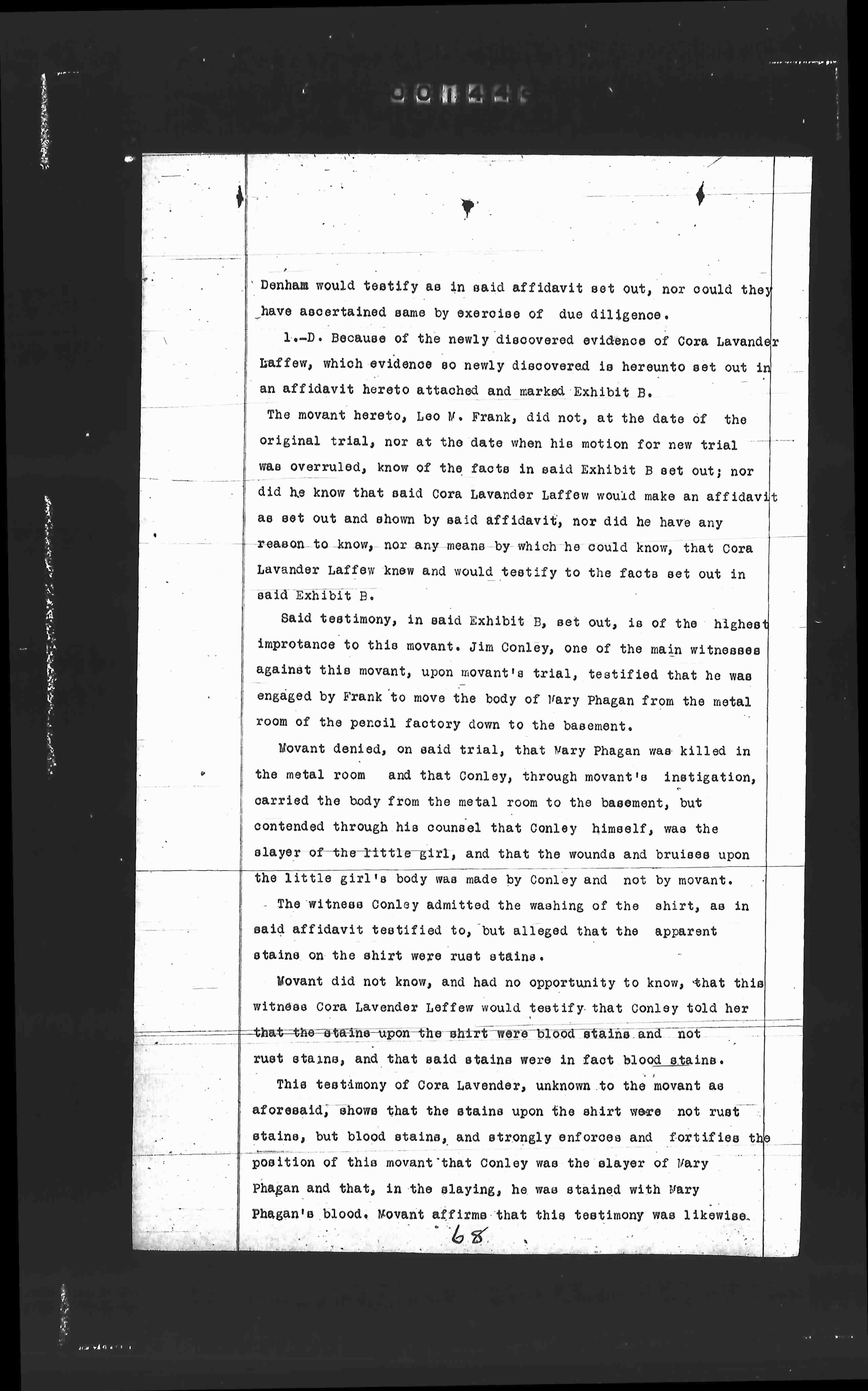 Said testimony, in said Exhibit B, set out, is of the highest importance to this movant. Jim Conley, one of the main witnesses against this movant, upon movant's trial, testified that he was engaged by Frank to move the body of Mary Phagan from the metal room of the pencil factory down to the basement.