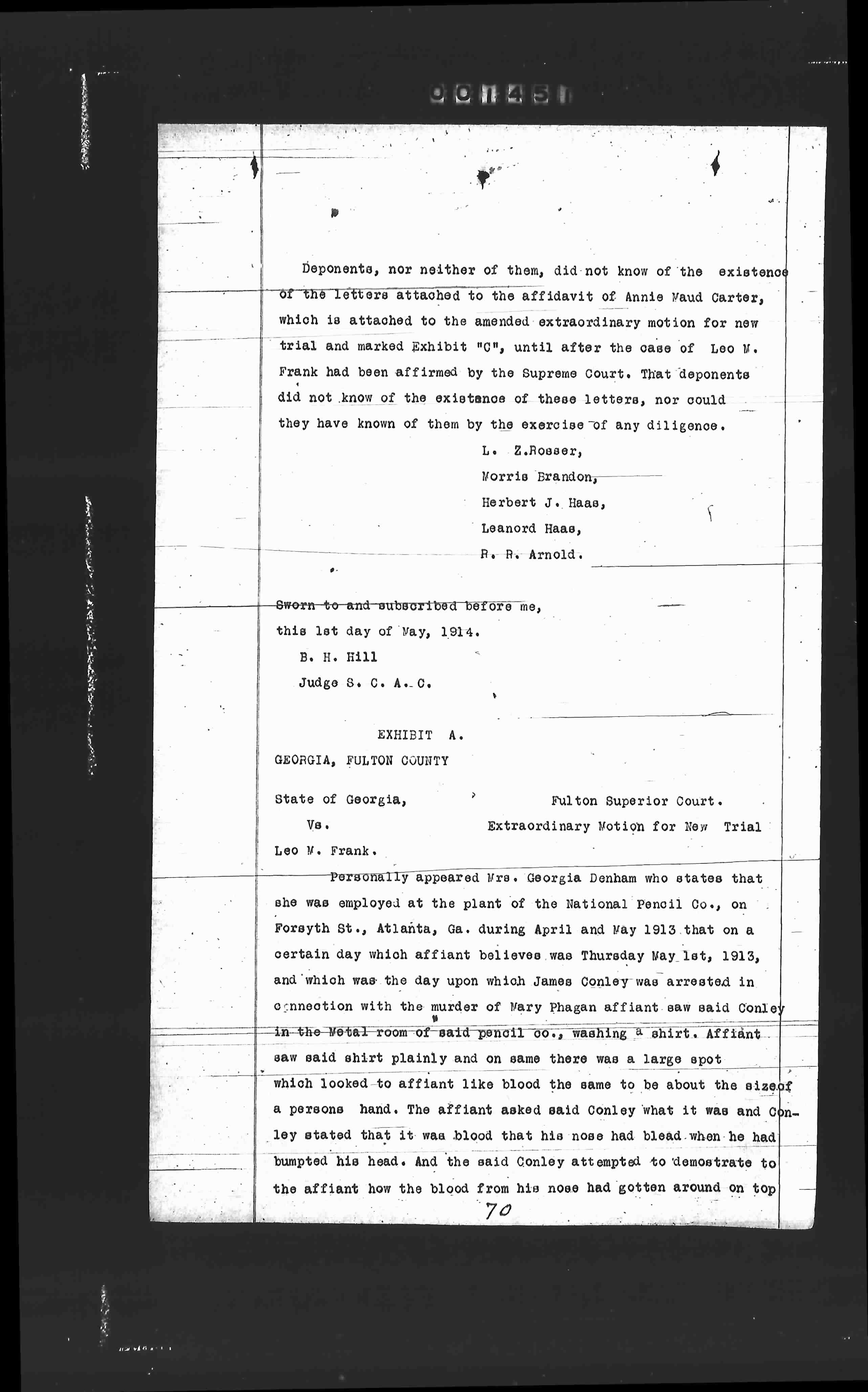 Personally appeared Mrs. Georgia Denham who states that she was employed at the plant of the National Pencil Co., on Forsyth St., Atlanta, Ga. during April and May 1913 that on a certain day which affiant believes was Thursday May 1st, 1913, and which was the day upon which James Conley was arrested in connection with the murder of Mary Phagan affiant saw said Conley in the Metal room of said pencil co., washing a shirt. Affiant saw said shirt plainly and on same there was a large spot which looked to affiant like blood the same to be about the size of a persons hand. The affiant asked said Conley what it was and Conley stated that it was blood that his nose had bled when he had bumped his head and the said Conley attempted to demonstrate to the affiant how the blood from his nose had gotten around on top