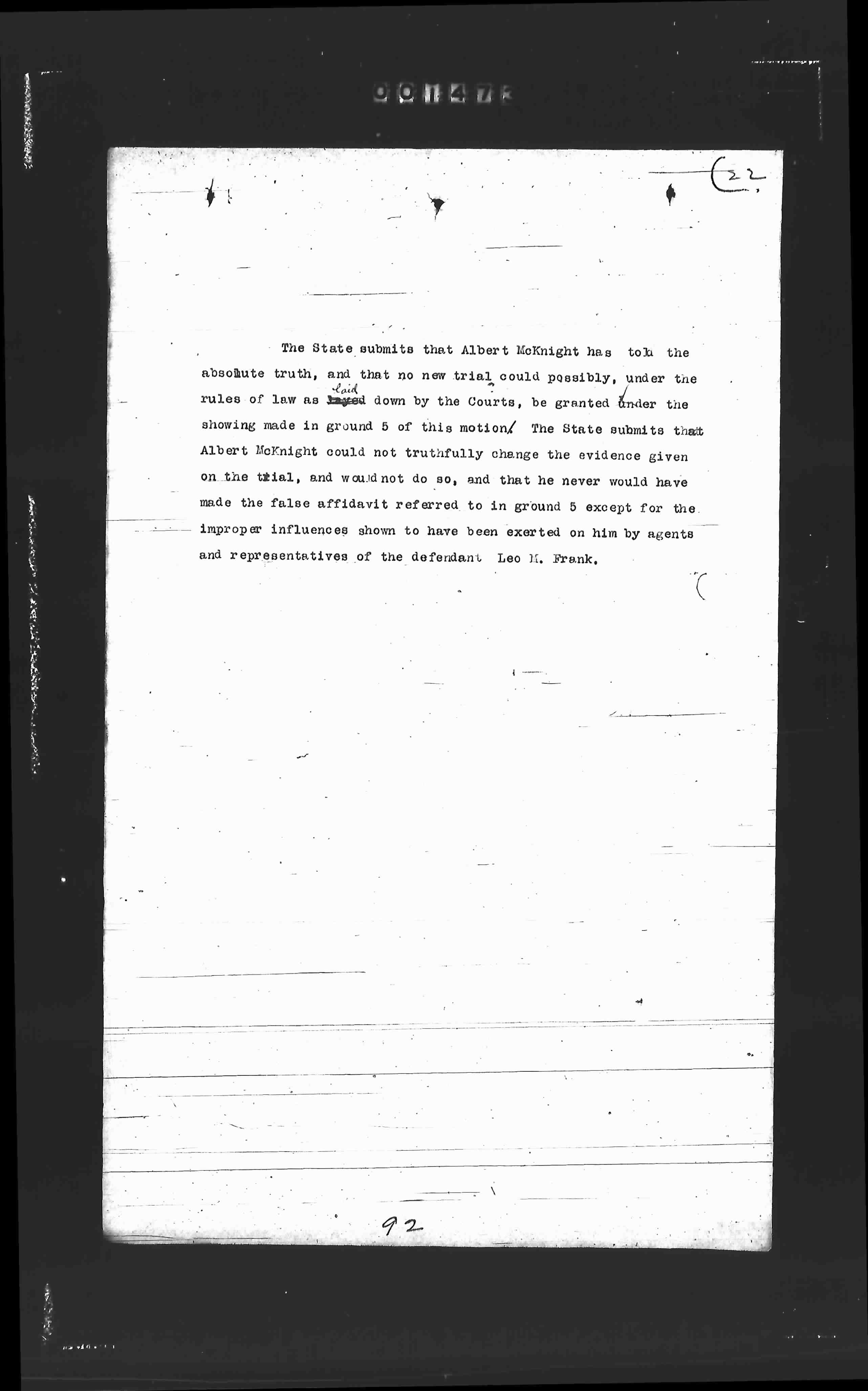 The State submits that Albert McKnight has told the absolute truth, and that no new trial could possibly, under the rules of law as laid down by the Courts, be granted under the showing made in ground 5 of this motion. The State submits that Albert McKnight could not truthfully change the evidence given on the trial, and would not do so, and that he never would have made the false affidavit referred to in ground 5 except for the improper influences shown to have been exerted on him by agents and representatives of the defendant, Leo M. Frank.