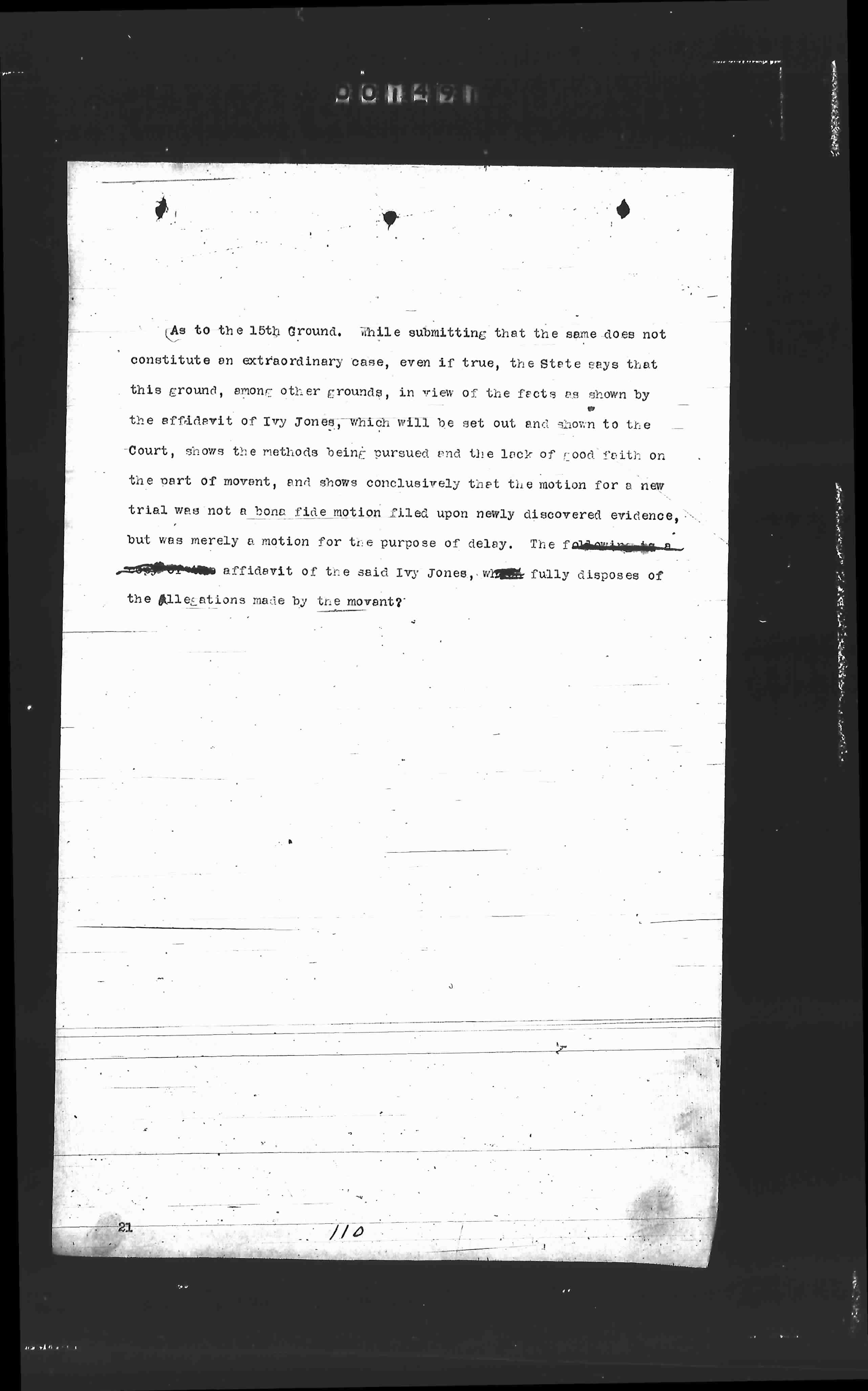 As to the 15th Ground, while submitting that the same does not constitute an extraordinary case, even if true, the State says that this ground, among other grounds, in view of the facts as shown by the affidavit of Ivy Jones, which will be set out and shown to the Court, shows the methods being pursued and the lack of good faith on the part of movent, and shows conclusively that the motion for a new trial was not a bona fide motion filed upon newly discovered evidence, but was merely a motion for the purpose of delay. The following is a copy of the affidavit of the said Ivy Jones, which fully disposes of the allegations made by the movent.