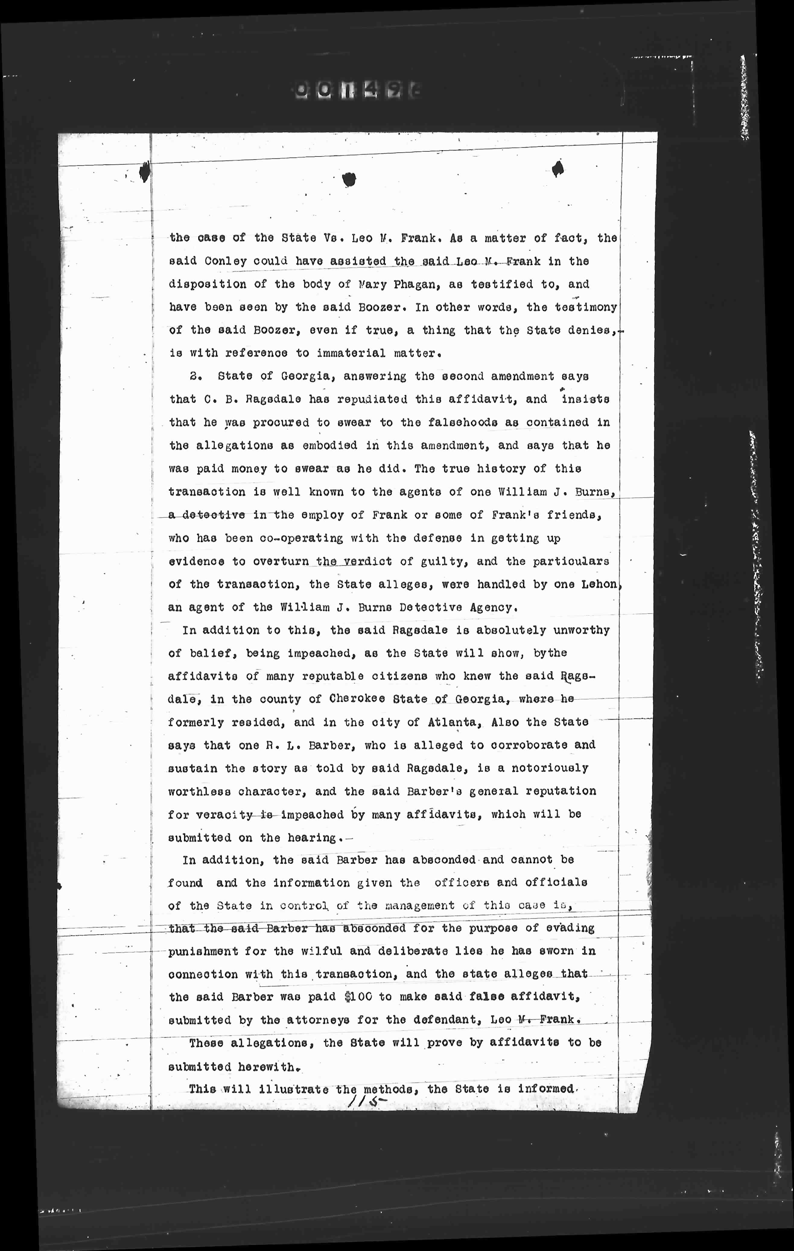 2. State of Georgia, answering the second amendment says that C. B. Ragadale has repudiated this affidavit, and insists that he was procured to swear to the falsehoods as contained in the allegations as embodied in this amendment, and says that he was paid money to swear as he did. The true history of this transaction is well known to the agents of one William J. Burns, a detective in the employ of Frank or some of Frank's friends, who has been co-operating with the defense in getting up evidence to overturn the verdict of guilty, and the particulars of the transaction, the State alleges, were handled by one Lehon, an agent of the William J. Burns Detective Agency.
