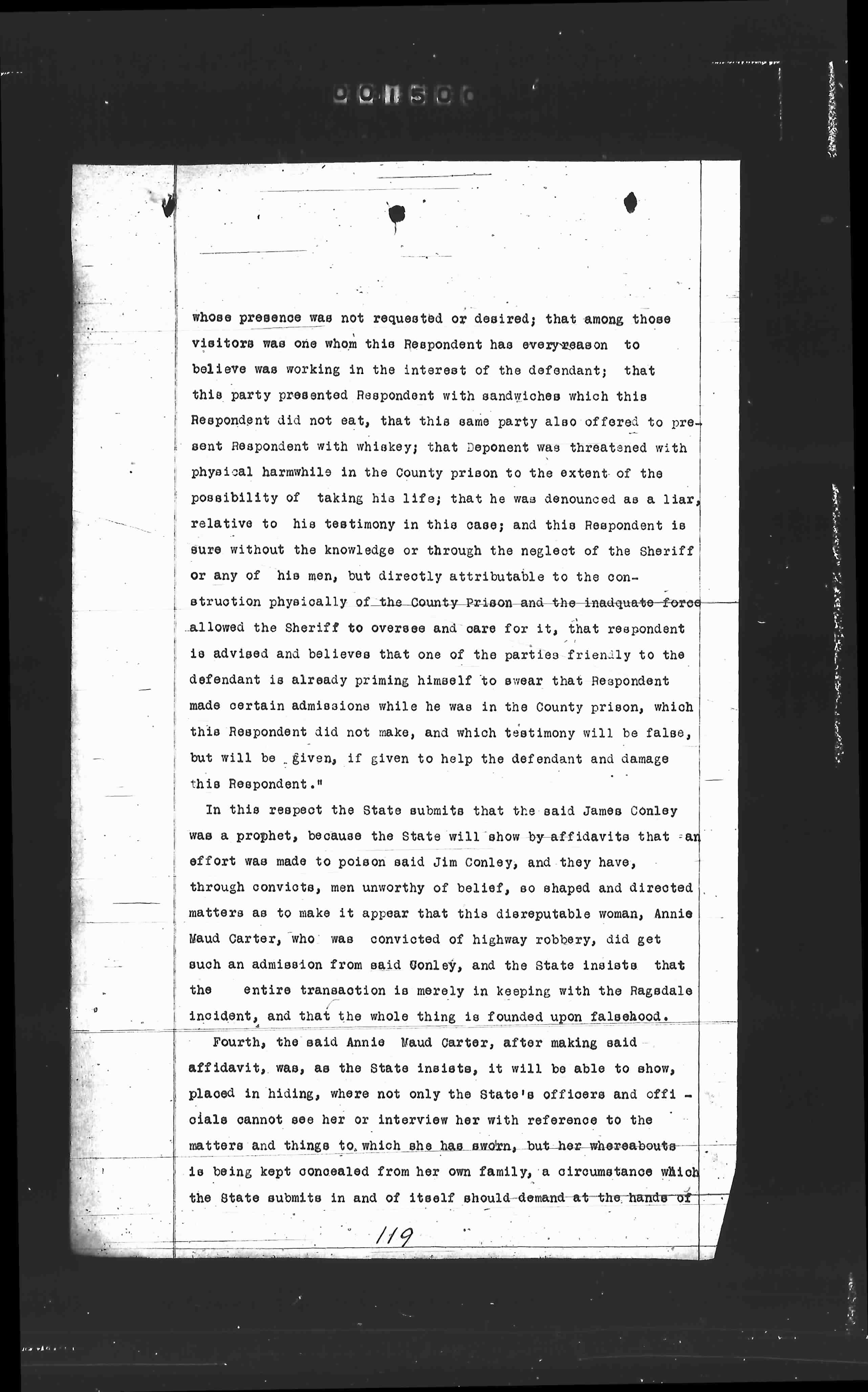 In this respect the State submits that the said James Conley was a prophet, because the State will show by affidavit that an effort was made to poison said Jim Conley, and they have, through convicts, men unworthy of belief, so shaped and directed matters as to make it appear that this disreputable woman, Annie Maud Carter, who was convicted of highway robbery, did get such an admission from said Conley, and the State insists that the entire transaction is merely in keeping with the Ragsdale incident, and that the whole thing is founded upon falsehood.