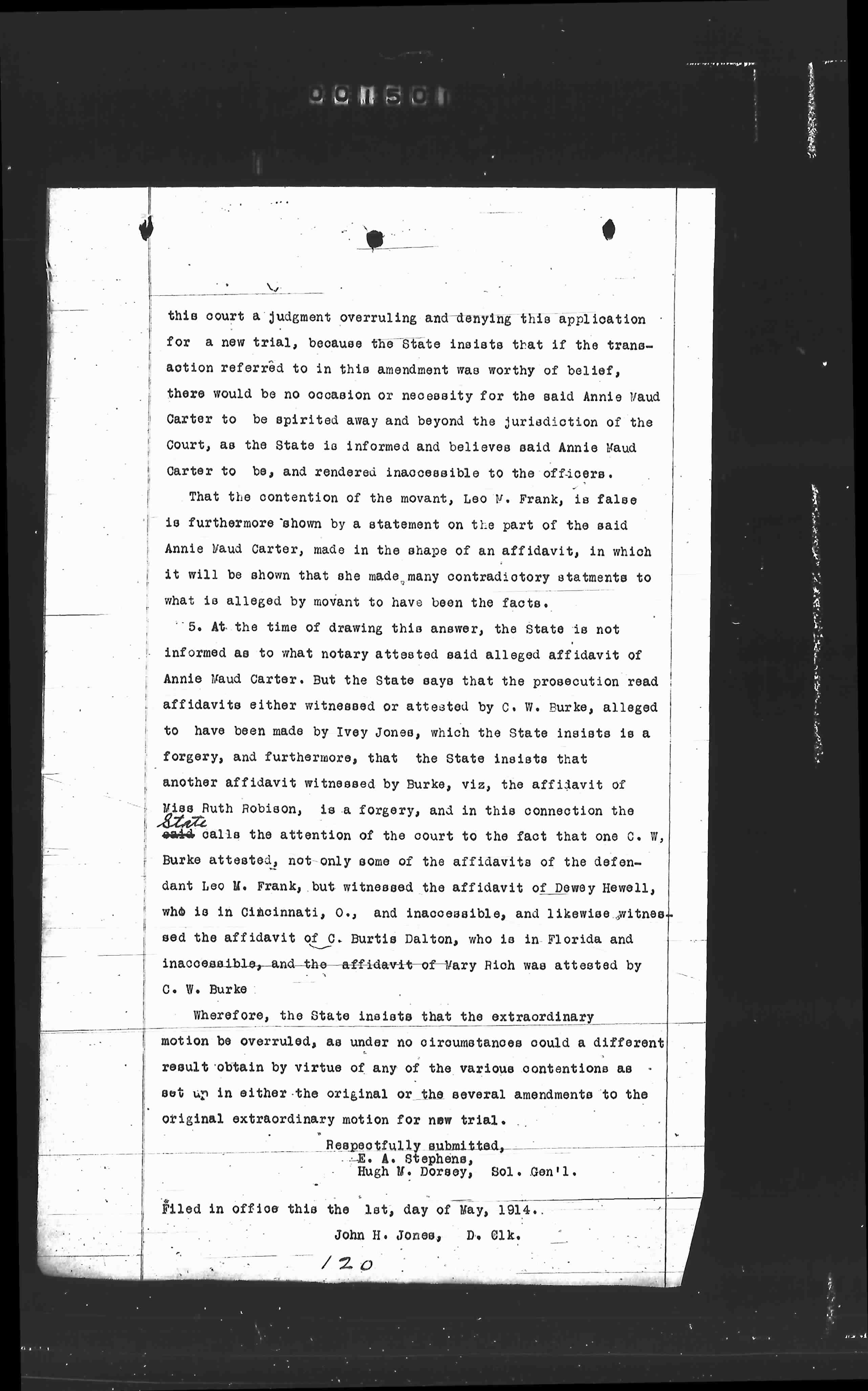 5. At the time of drawing this answer, the State is not informed as to what notary attested said alleged affidavit of Annie Maud Carter. But the State says that the prosecution read affidavits either witnessed or attested by C. W. Burke, alleged to have been made by Ivey Jones, which the State insists is a forgery, and furthermore, that the State insists that another affidavit witnessed by Burke, viz: the affidavit of Miss Ruth Robinson, is a forgery, and in this connection the State calls the attention of the court to the fact that one C. W. Burke attested, not only some of the affidavits of the defendant Leo M. Frank, but witnessed the affidavit of Dewey Howell, who is in Cincinnati, O., and inaccessible, and likewise witnessed the affidavit of C. Burlis Dalton, who is in Florida and inaccessible, and the affidavit of Wm. Rich was attested by C. W. Burke.