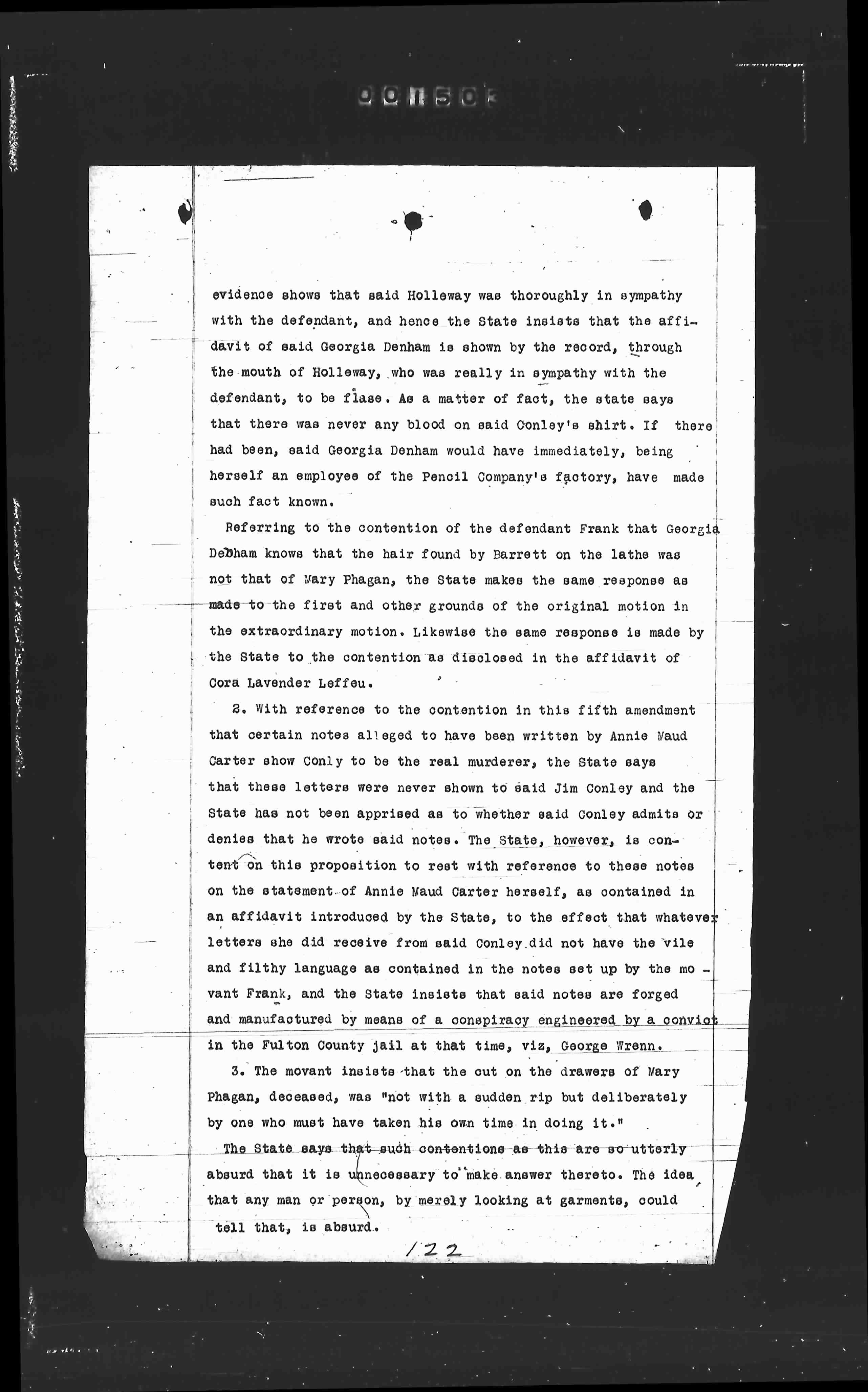 2. With reference to the contention in this fifth amendment that certain notes alleged to have been written by Annie Maud Carter show Conley to be the real murderer, the State says that these letters were never shown to said Jim Conley and the State has not been apprised as to what said Conley admits or denies that he wrote said notes. The State, however, is content on this proposition to rest with reference to these notes on the statement of Annie Maud Carter herself, as contained in an affidavit introduced by the State, to the effect that whatever letters she did receive from said Conley did not have the vile and filthy language as contained in the notes set up by the movant Frank, and the State insists that said notes are forged and manufactured by means of a conspiracy engineered by a convict in the Fulton County jail at that time, viz, George Wrenn.