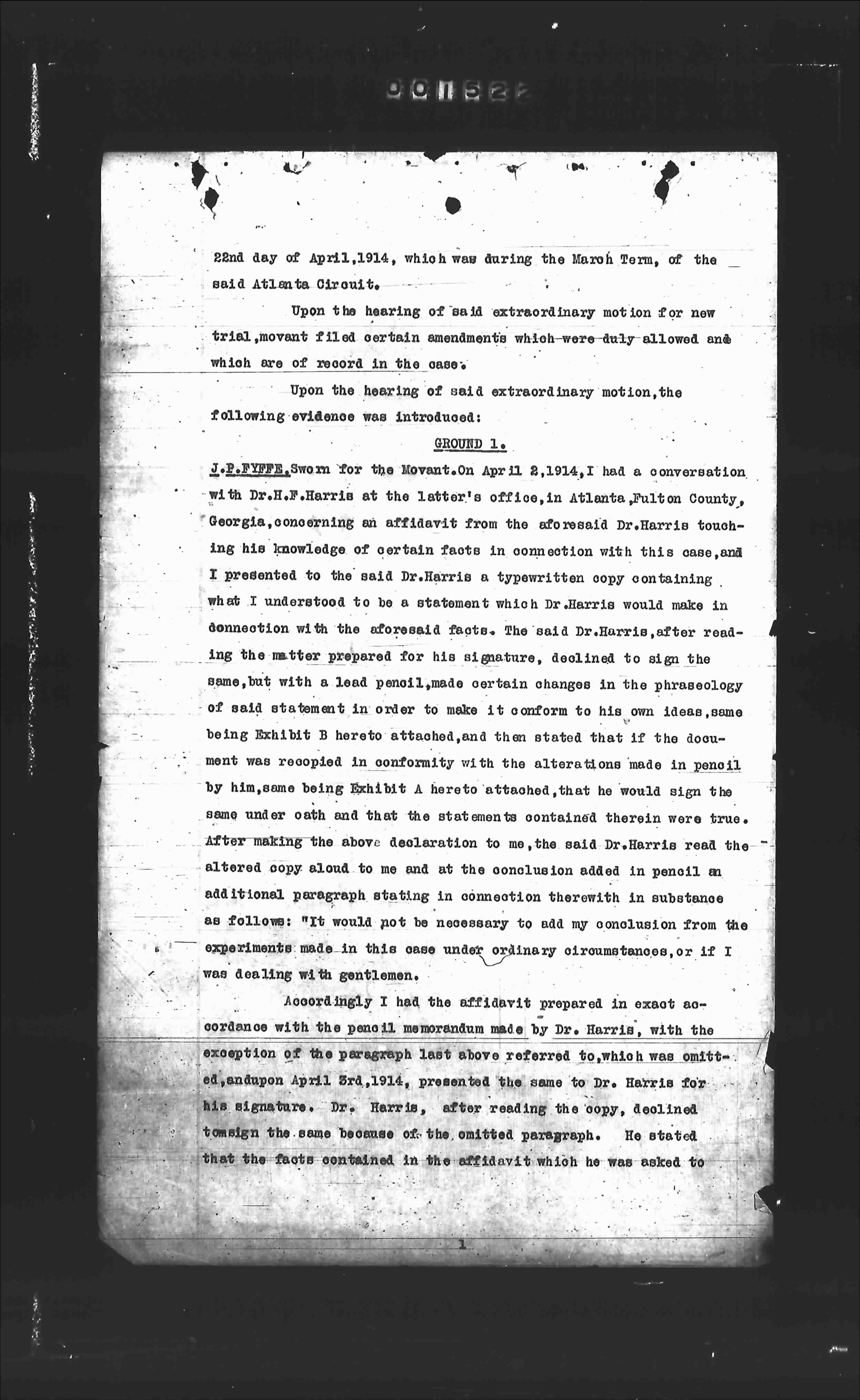 J. E. EPPER sworn for the movant. On April 2, 1914, I had a conversation with Dr. H. F. Harris at the latter's office, in Atlanta, Fulton County, Georgia, concerning an affidavit from the aforesaid Dr. Harris touching his knowledge of certain facts in connection with this case, and I presented to the said Dr. Harris a typewritten copy containing what I understood to be a statement which Dr. Harris would make in connection with the aforesaid facts. The said Dr. Harris, after reading the matter prepared for his signature, declined to sign the same, but with a lead pencil, made certain changes in the phraseology of said statement in order to make it conform to his own ideas, same being Exhibit B hereto attached, and then stated that if the document was recopied in conformity with the alterations made in pencil by him, same being Exhibit A hereto attached, that he would sign the same under oath and that the statement contained therein was true. After making the above declaration, the said Dr. Harris read the altered copy aloud to me and at the conclusion added in pencil an additional paragraph stating in connection therewith in substance as follows: "It would not be necessary to add my conclusion from the experiments made in this case under ordinary circumstances, or if I was dealing with gentlemen."