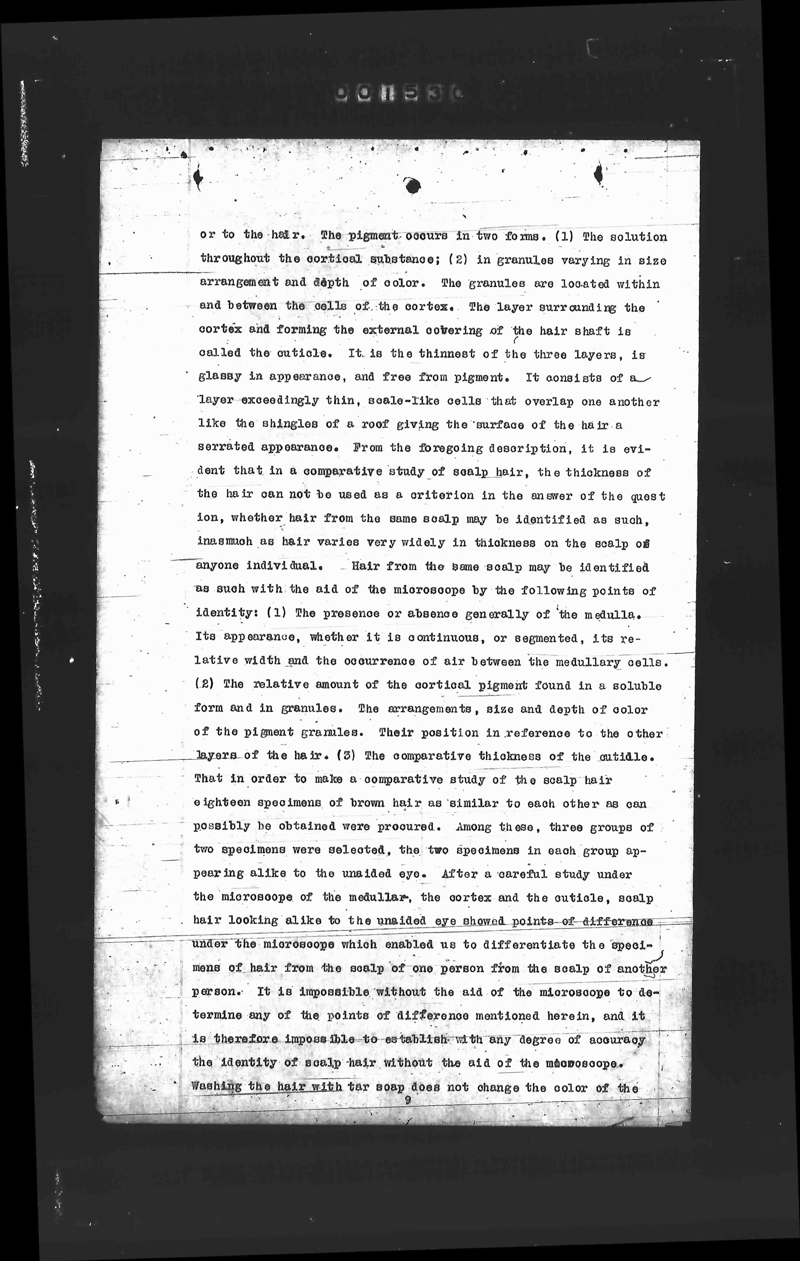 or to the heir. The pigment occurs in two forms. (1) The solution throughout the cortical substance; (2) in granules varying in size arrangement and depth of color. The granules are located within and between the cells of the cortex. The layer surrounding the cortex and forming the external covering of the hair shaft is called the outicle. It is the thinnest of the three layers, is glassy in appearance, and free from pigment. It consists of a layer exceedingly thin, scale-like cells that overlap one another like the shingles of a roof giving the surface of the hair a serrated appearance. From the foregoing description, it is evident that in a comparative study of scalp heir, the thickness of the hair can not be used as a criterion in answer of the question, whether hair from the same scalp may be identified as such, inasmuch as hair varies very widely in thickness on the scalp of anyone individual. Hair from the same scalp may be identified as such with the aid of the microscope by the following points of identity: (1) The presence or absence generally of the medulla. Its appearance, whether it is continuous, or segmented, its relative width and the occurrence of air between the medullary cells. (2) The relative amount of the cortical pigment found in a soluble form and in granules. The arrangements, size and depth of color of the pigment granules. Their position in reference to the other layers of the heir. (3) The comparative thickness of the outicle. That in order to make a comparative study of the scalp hair eighteen specimens of brown hair as similar to each other as can possibly be obtained were procured. Among these, three groups of two specimens were selected, the two specimens in each group appearing alike to the unaided eye. After a careful study under the microscope of the medulla, the cortex and the outicle, scalp hair looking alike to the unaided eye showed points of difference under the microscope which enabled us to differentiate the specimens of hair from the scalp of one person from the scalp of another person. It is impossible without the aid of the microscope to determine any of the points of difference mentioned herein, and it is therefore impossible to establish with any degree of accuracy the identity of scalp hair without the aid of the microscope. Washing the hair with tar soap does not change the color of the